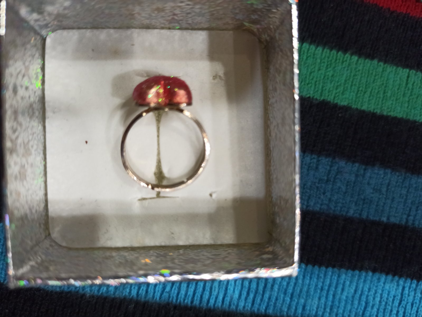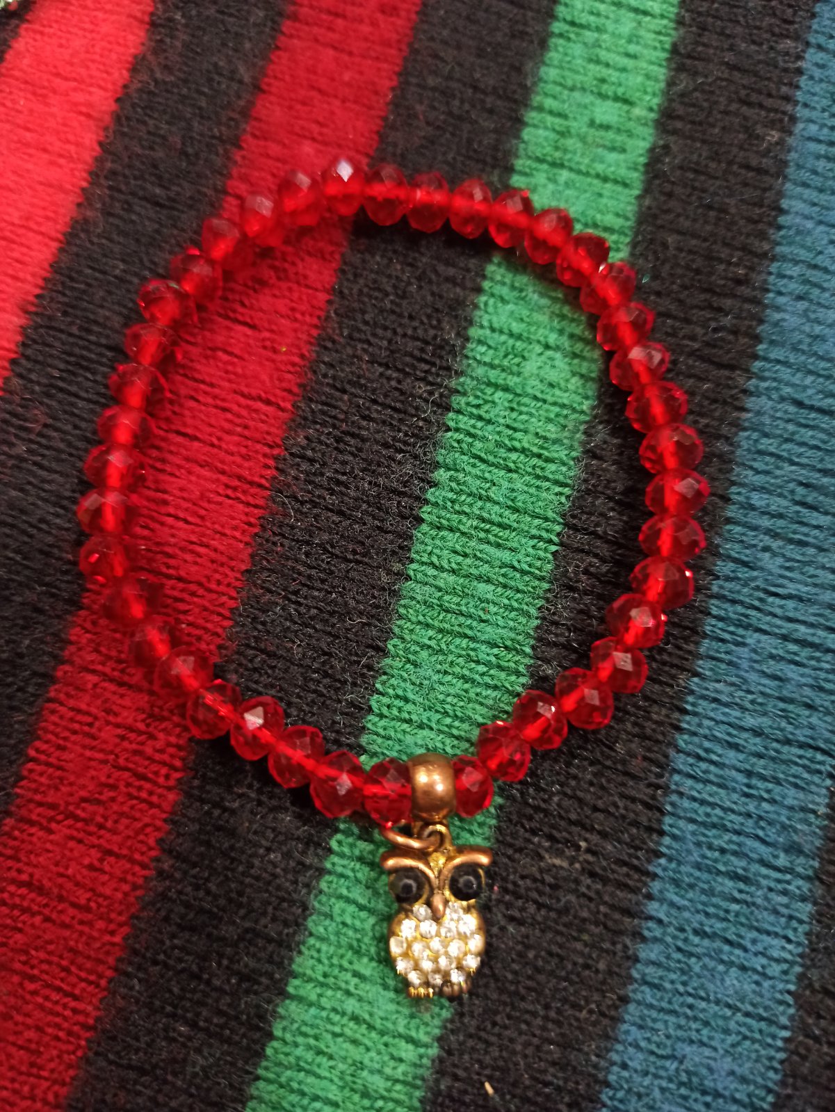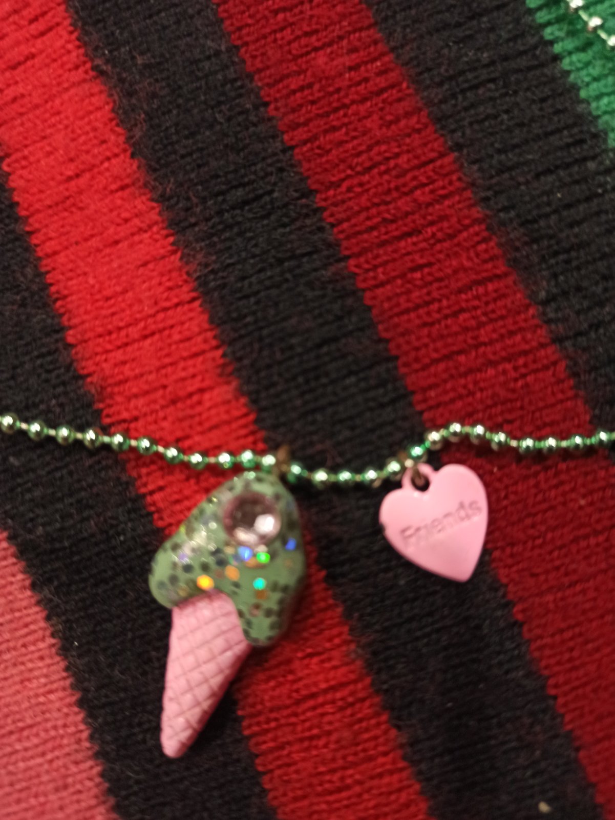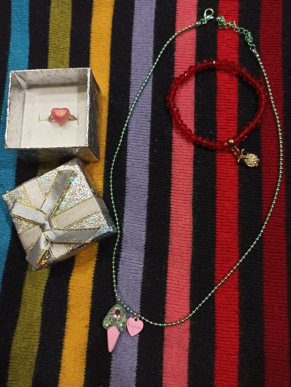 Prstienok s ružovým srdiečkom, náramok na gumičku s drobnými červenými korálkami, náhrdelník, neboseny, duma za sadu