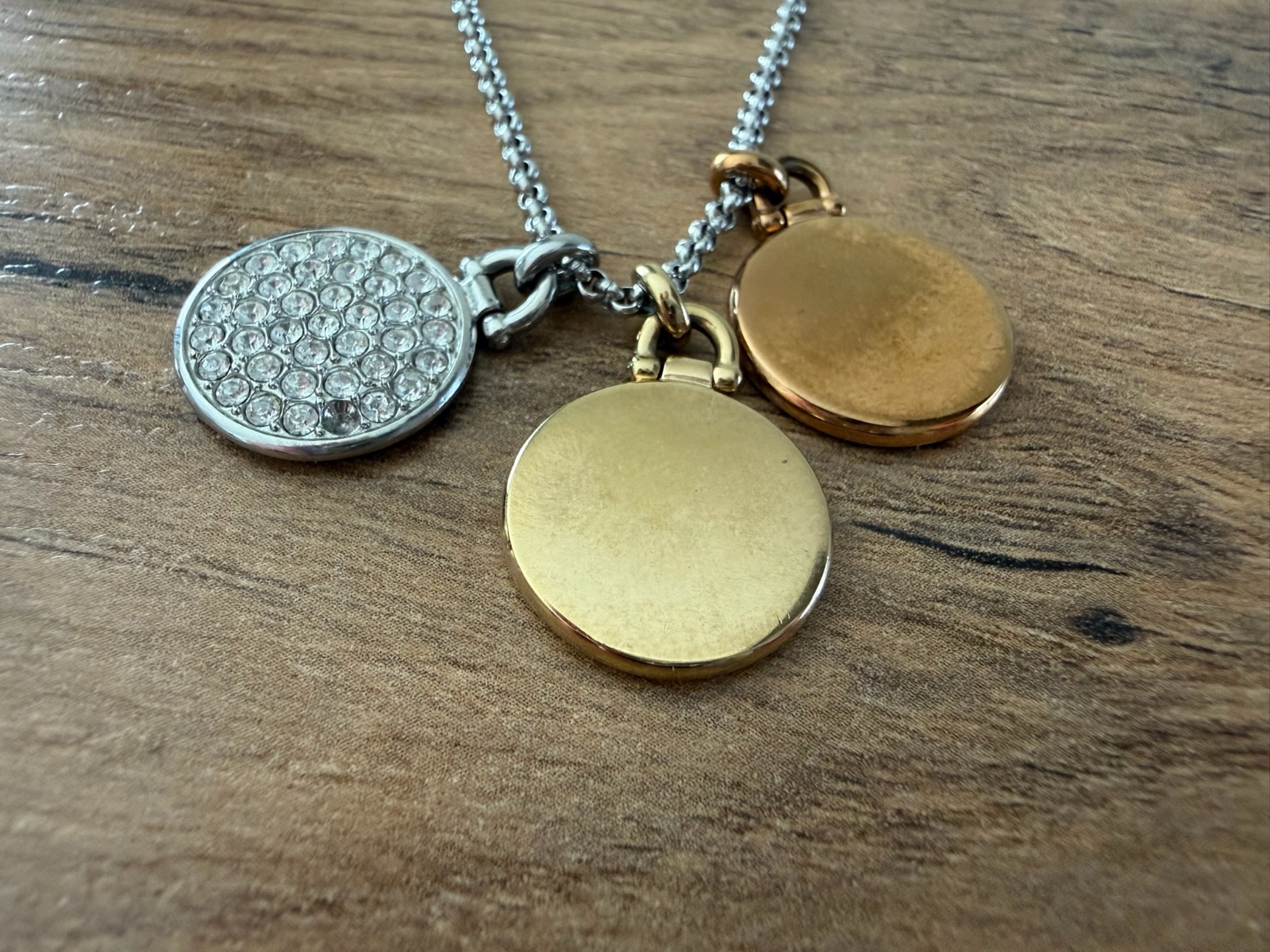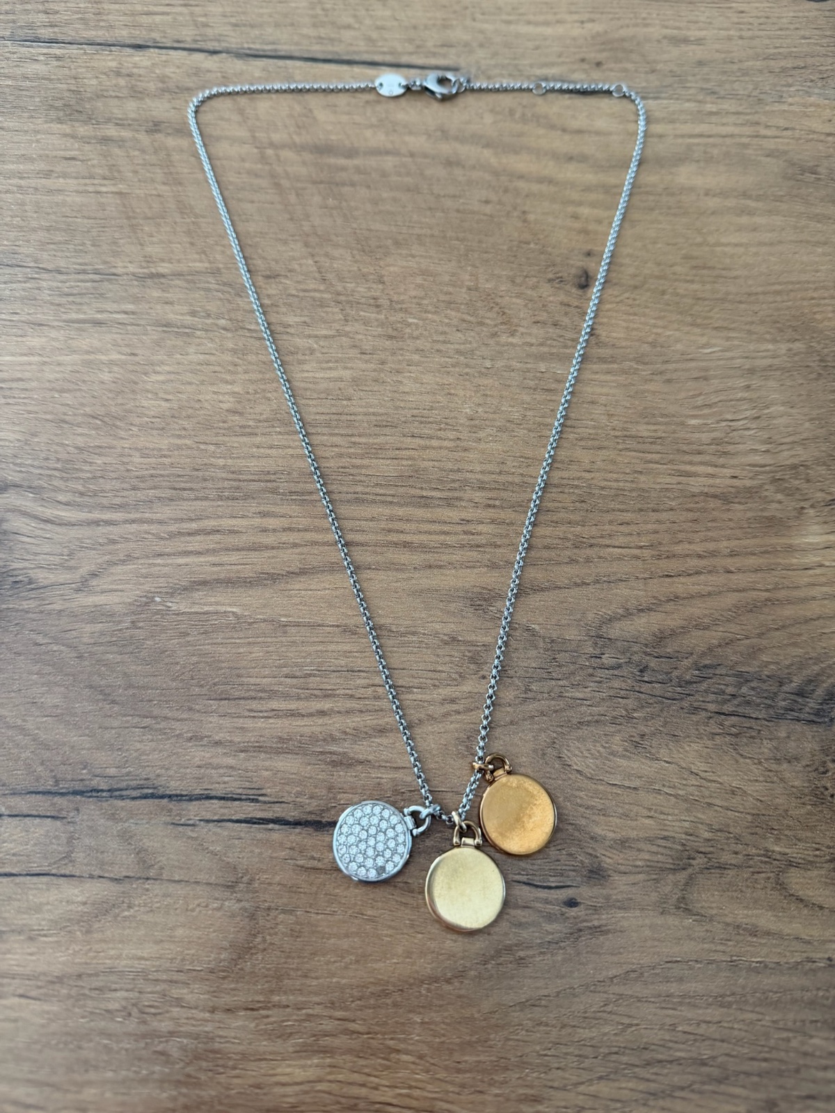 Nosený málo, veľmi pekný, kvalitný a detailný, nenosím tak predávam, chýba jeden kamienok (viď obr.) ktorý sa dá doplniť, nie je to veľmi viditeľné, originál Fossil, dovoz z USA, dlžka retiazky 52 cm, priemer medailónu 15 mm