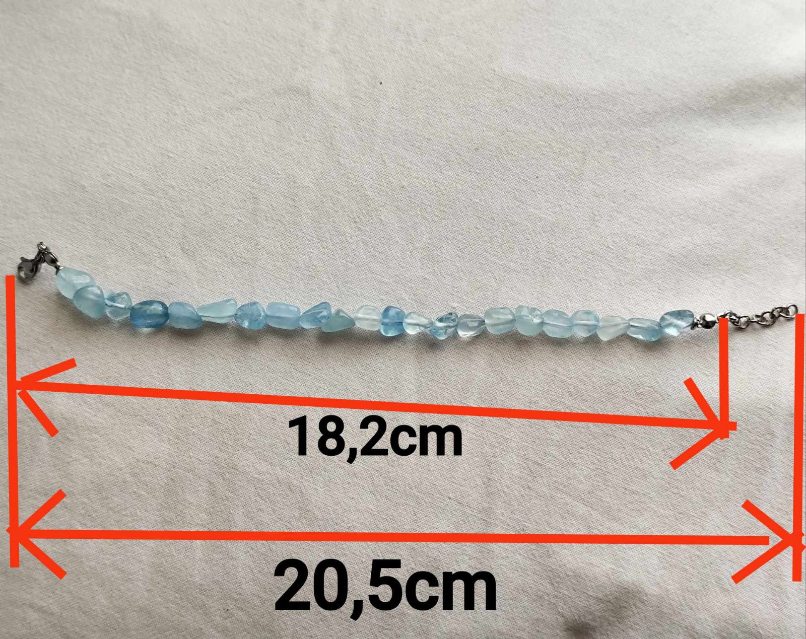 Náramok akvamarín. Kov je chirurgická oceľ. Dĺžka od zapínania po prvý krúžok je 18,2 cm. Celkovo má 20,5 cm.