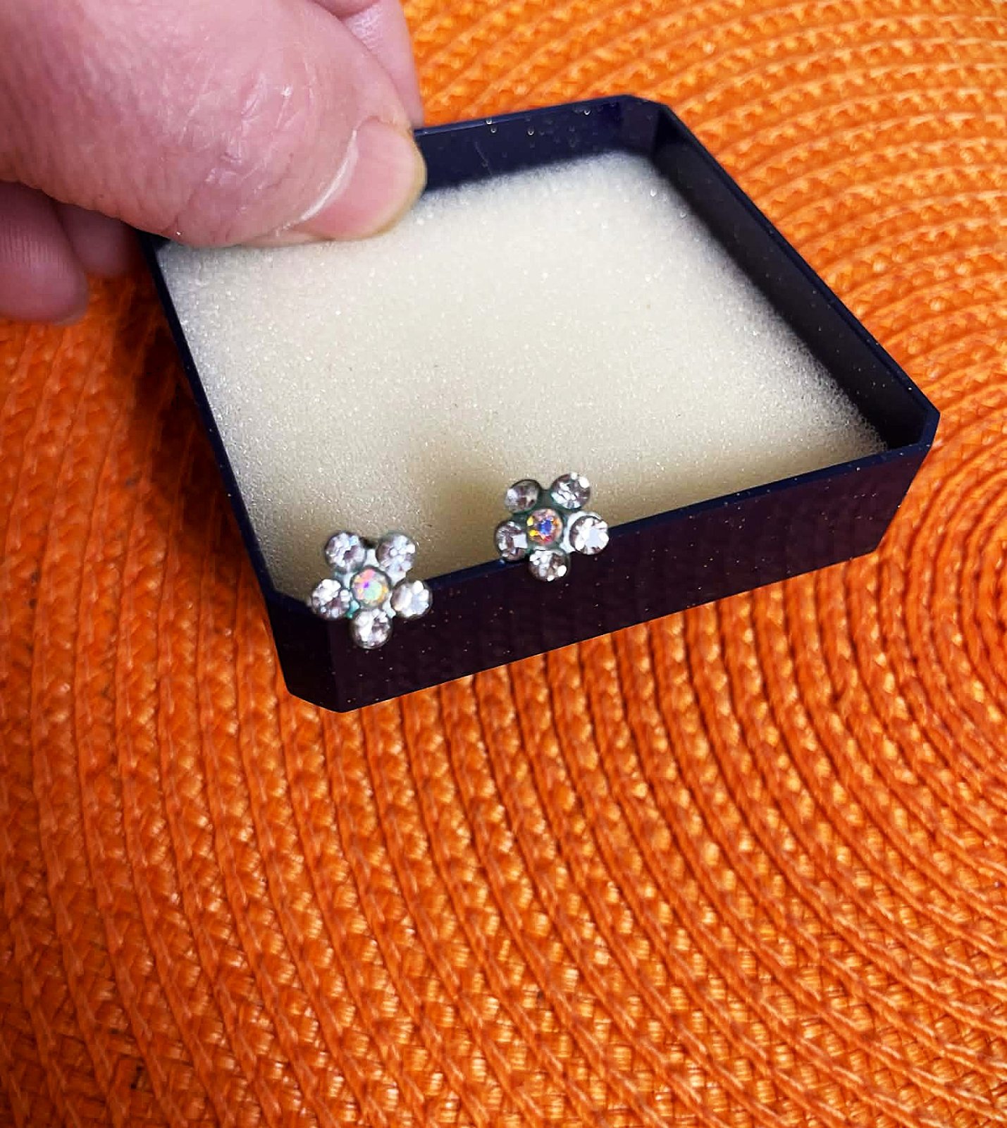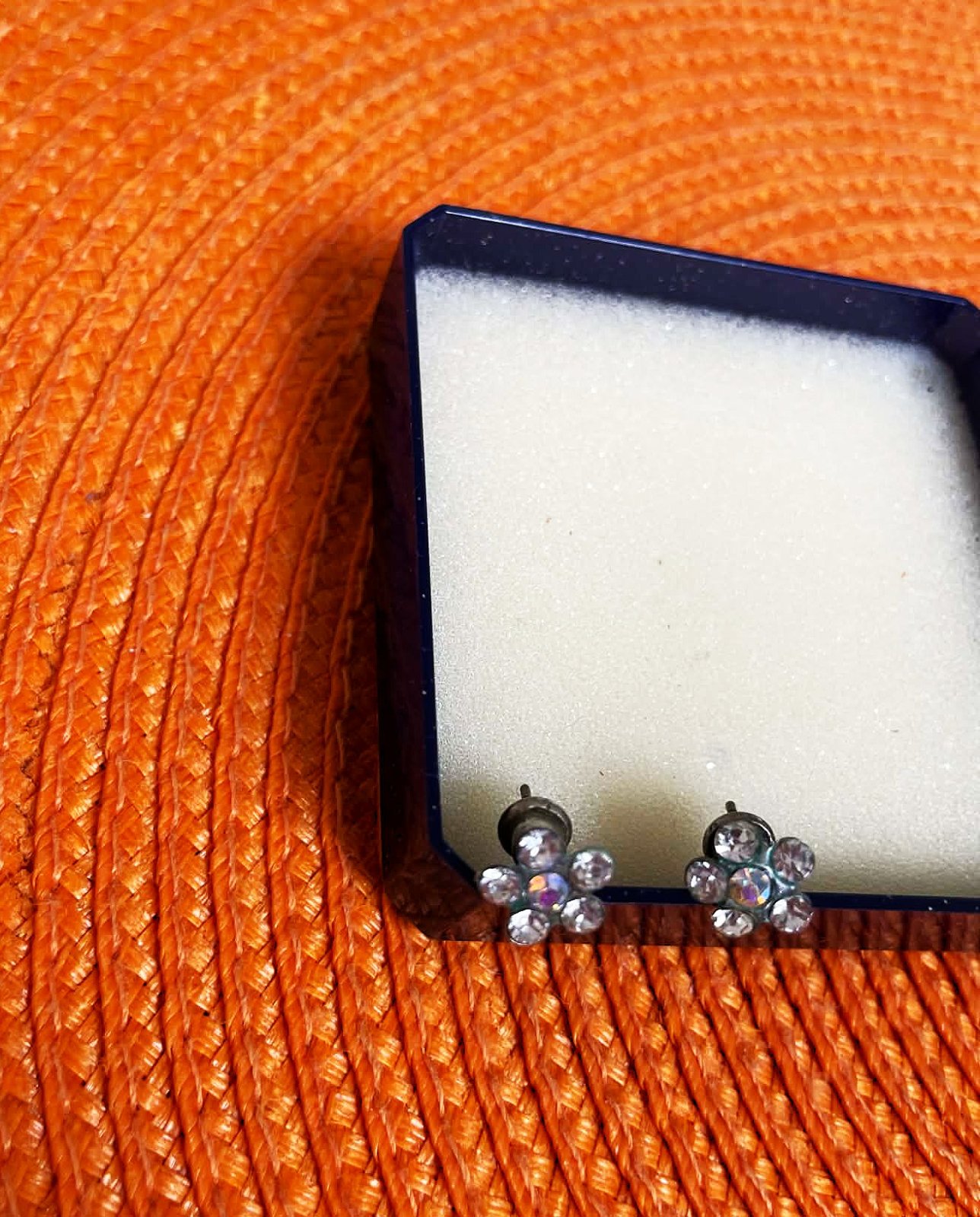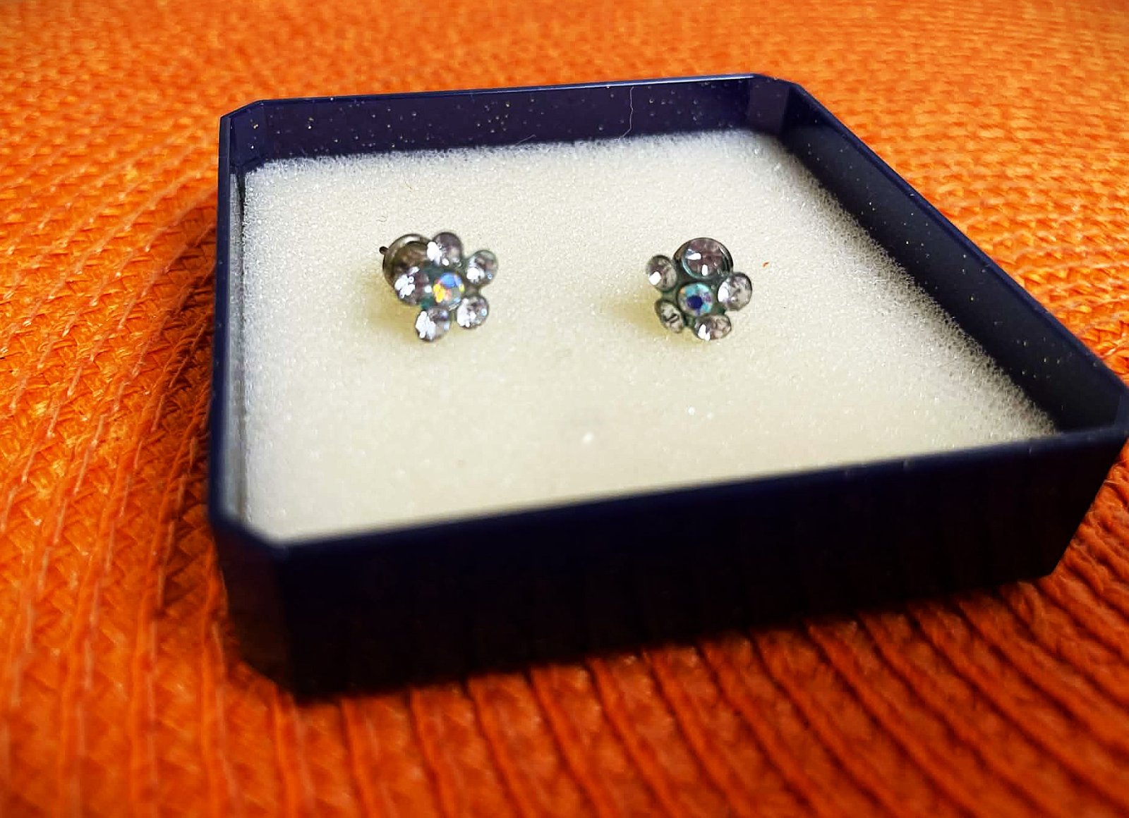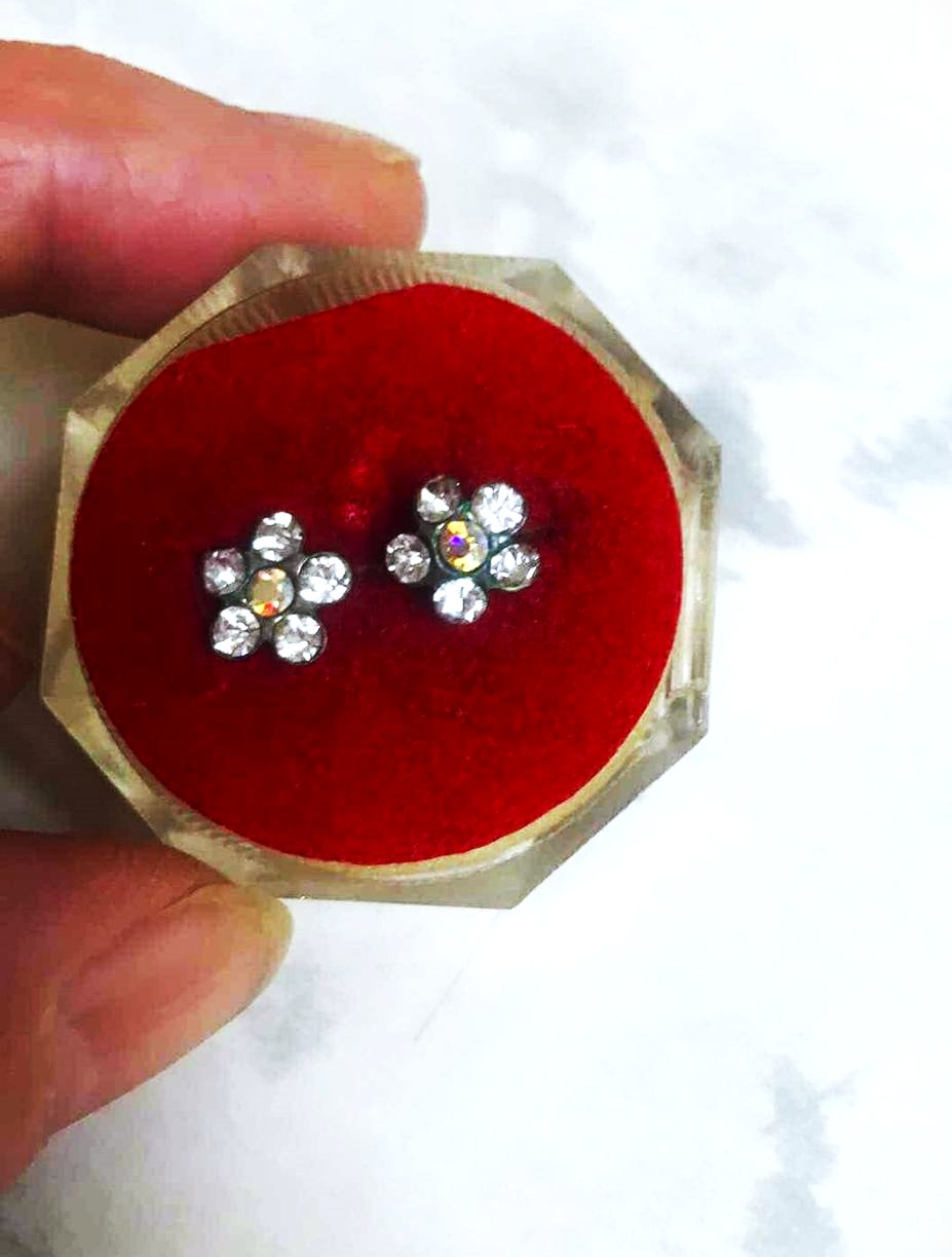 krásne nežné jemné náušničky,málo nosené,je to kvietok z drobných malých trblietavých kamienkov, priemer = cca 1 cm,je to bižutéria