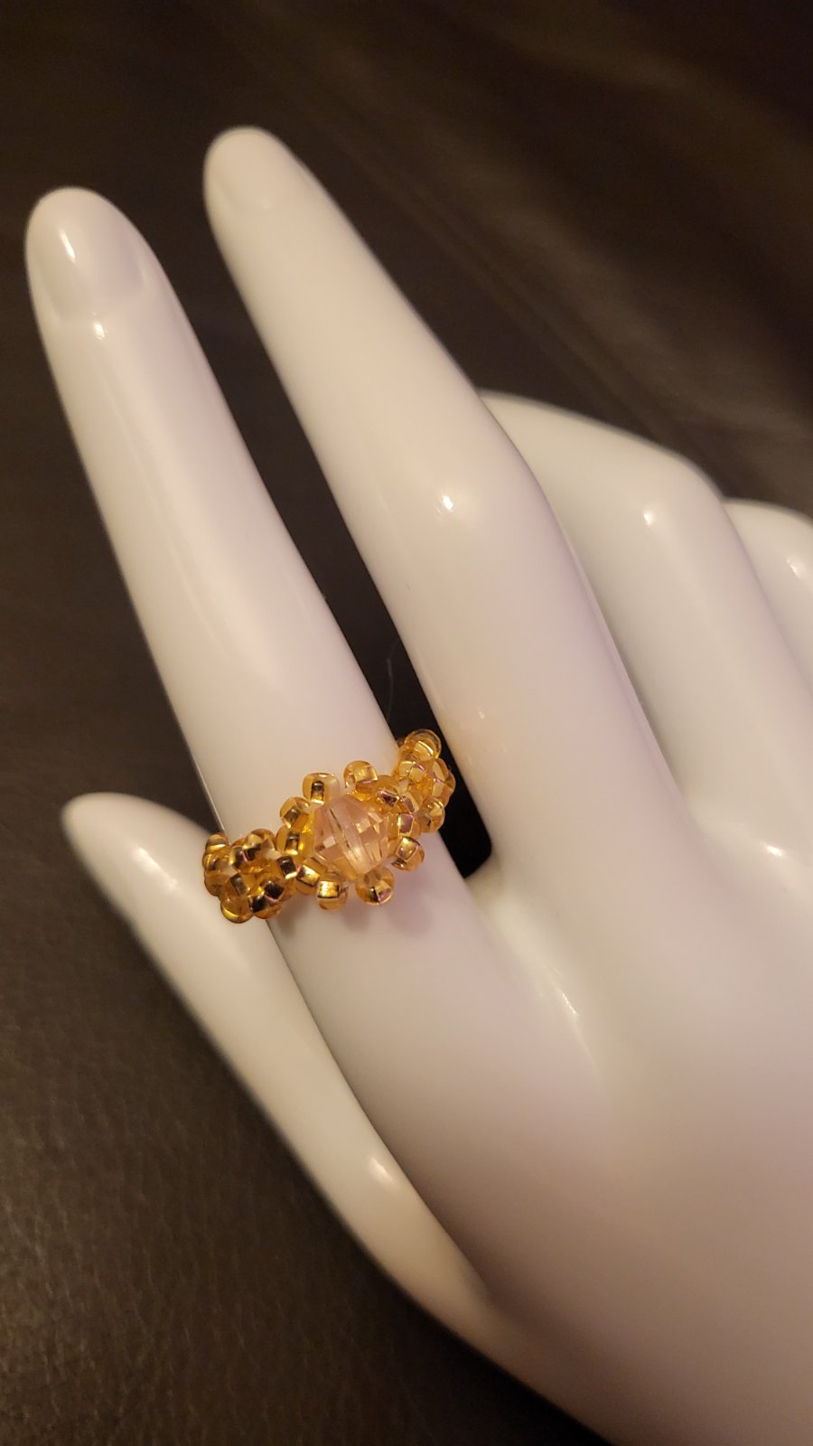 Krásny prsteň z korálok - preciosa. Korálky navliekané na gumičku na dobrú manipuláciu. Korálky v zlatej farbe, veľká plastová v strede. Veľkosť 52. Posielam po prevode na účet. - možnosť sledovania zásielky. Osobný odber možný. Poštovné a balné v cene.