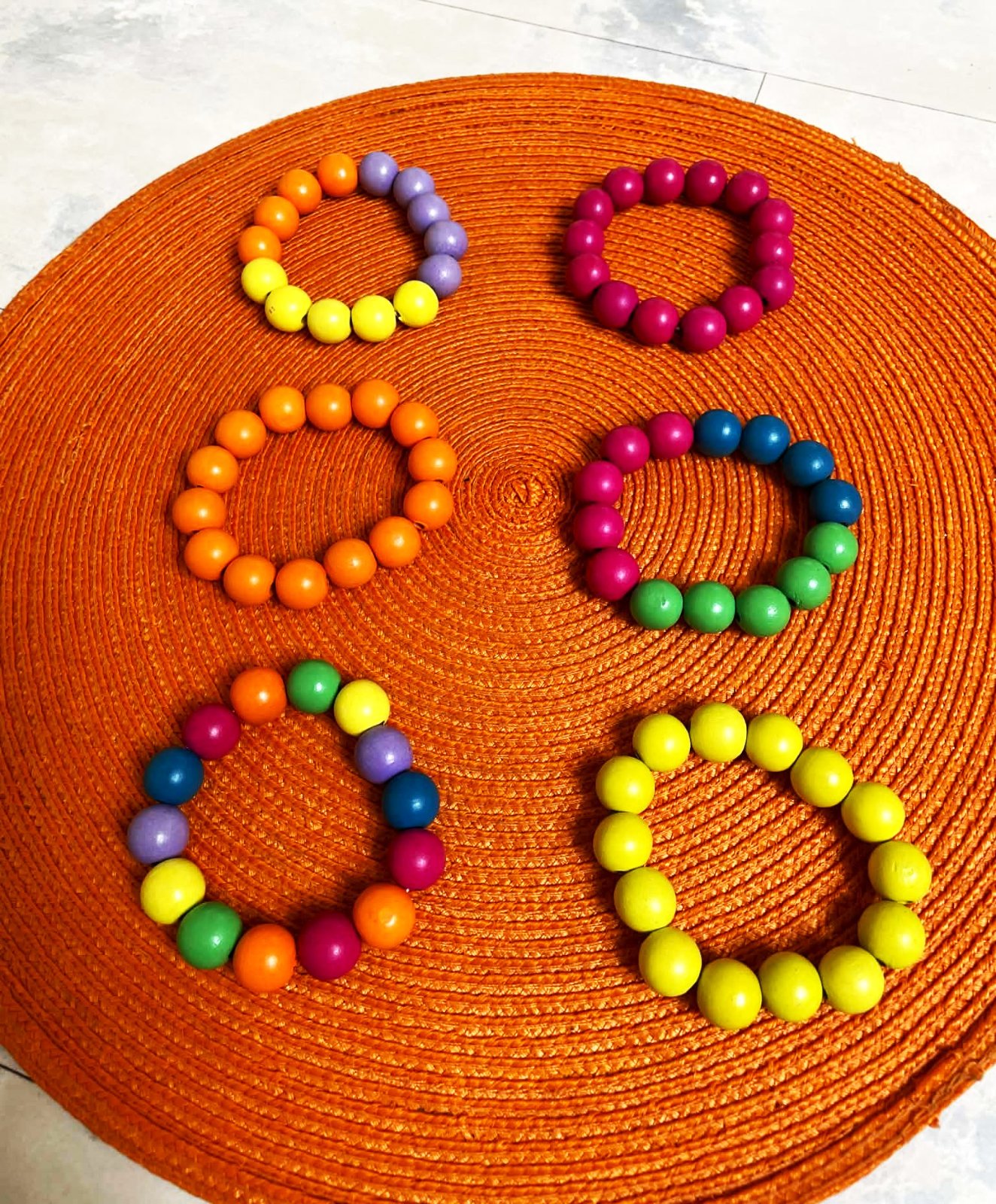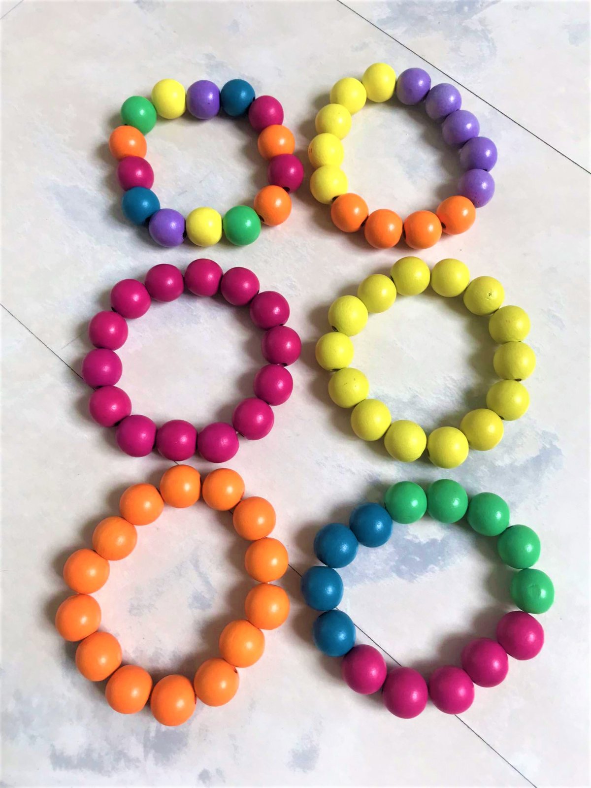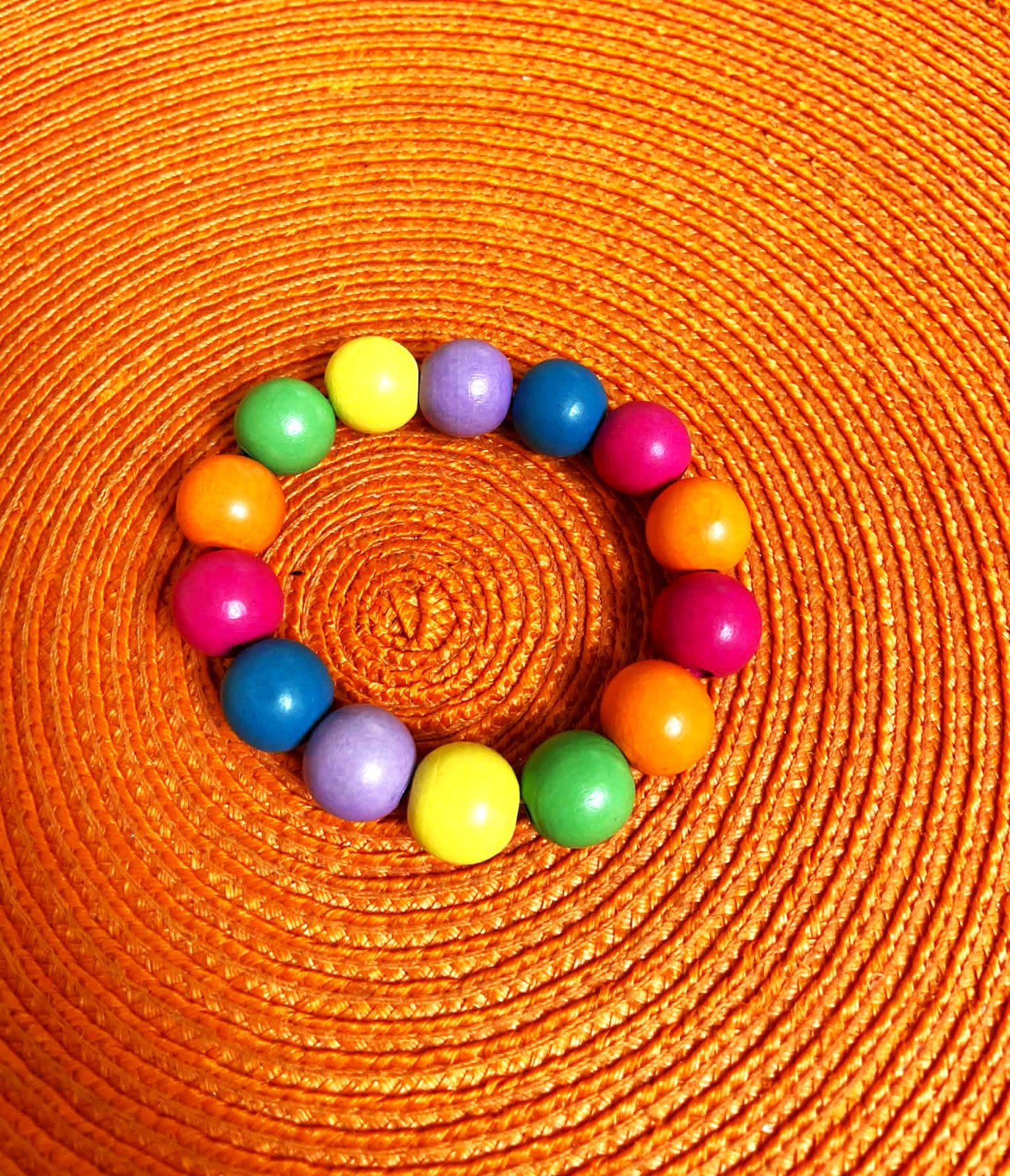 letný pestrý drevený náramok,málo používaný,na gumičku,ja som ho nosila vrstvene s inými farbami,gulička má priemer cca 1,2 cm