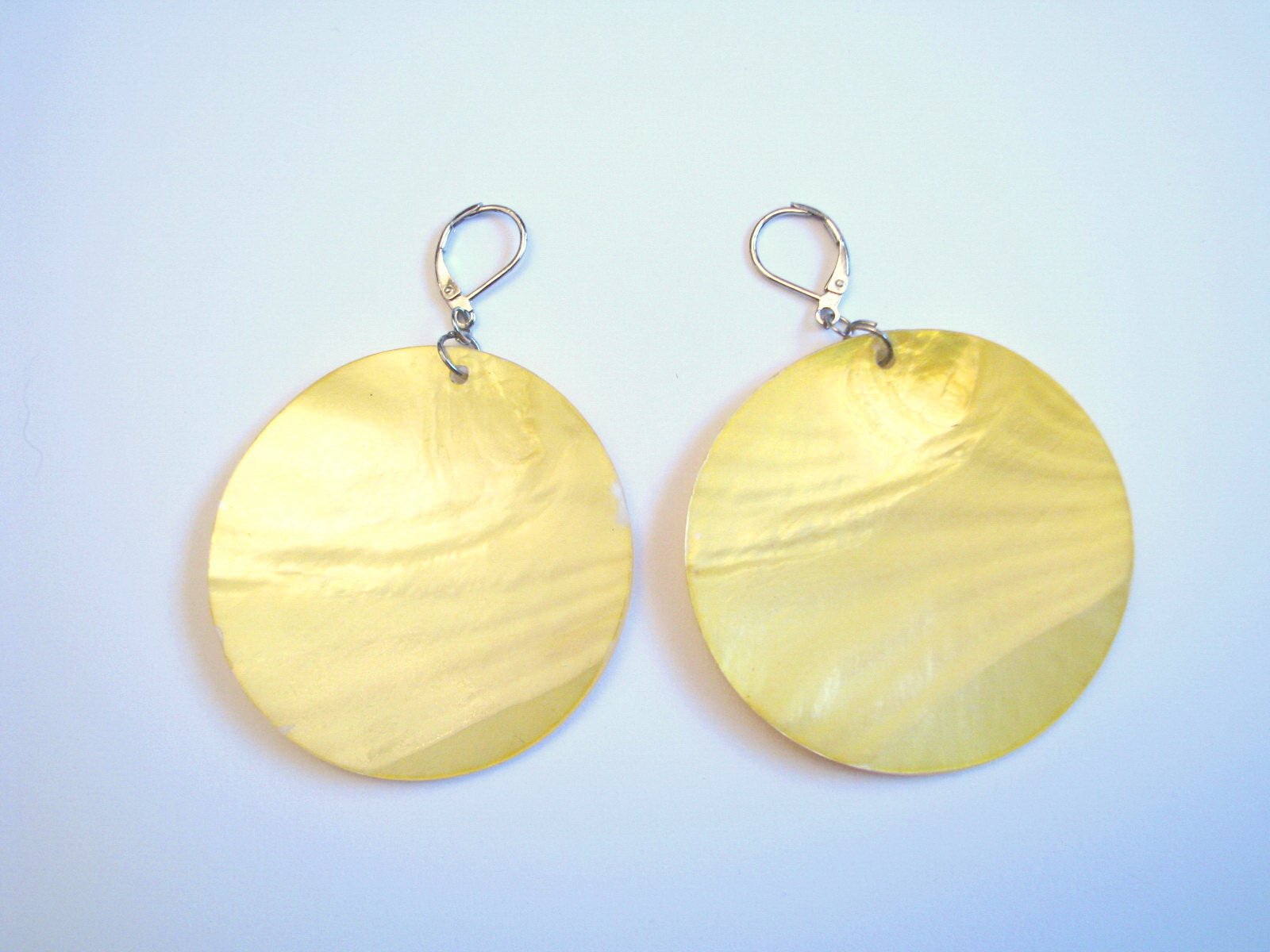 Náušnice z perlete, farbené na žlto. Sú ťažšie. Visia na zatváracích háčikoch platinovej farby. Na jednom mieste trošku vylúpnuté, viď. detailná fotka a pár mini nenápadných šuchnutí.