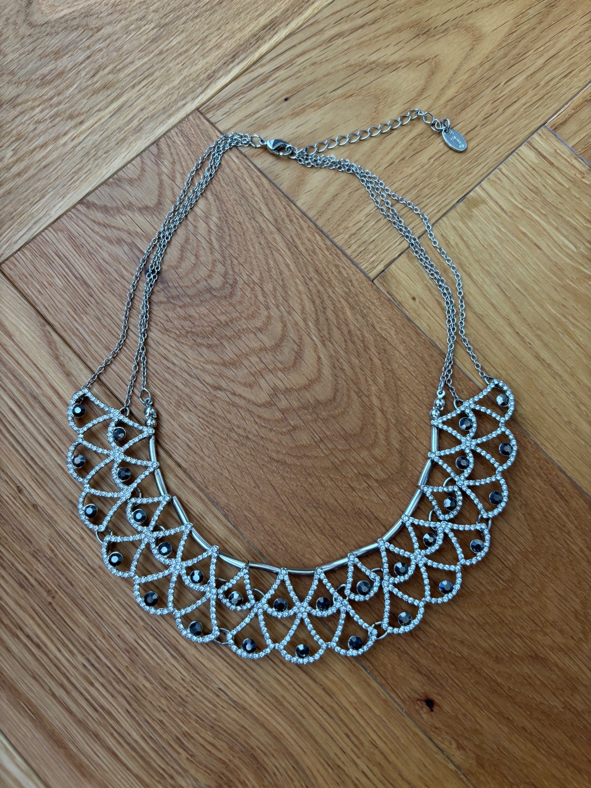 Elegantný náhrdelník s lesklými kamienkami, ktoré vytvárajú krížové prepojenie a predĺžený stred. Vhodný na formálne a spoločenské udalosti.