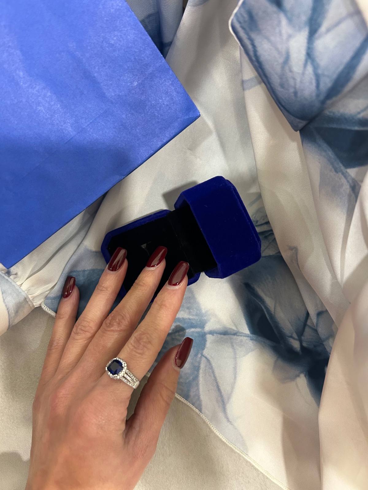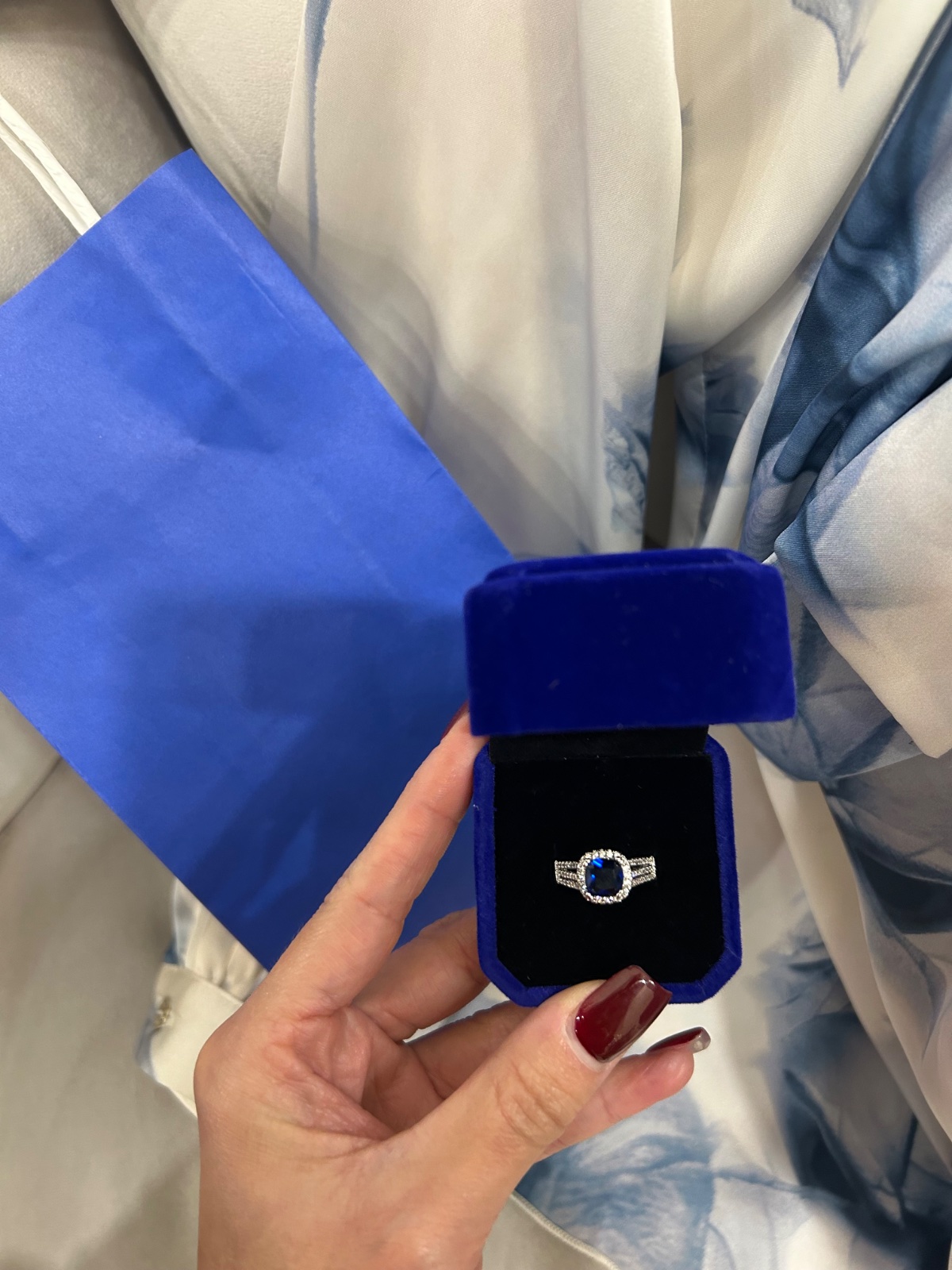 Strieborný prsteň znak 925-striebro - s tmavomodrym kameňom - veľkosť 6. V krabičke a taštičke. Nový.