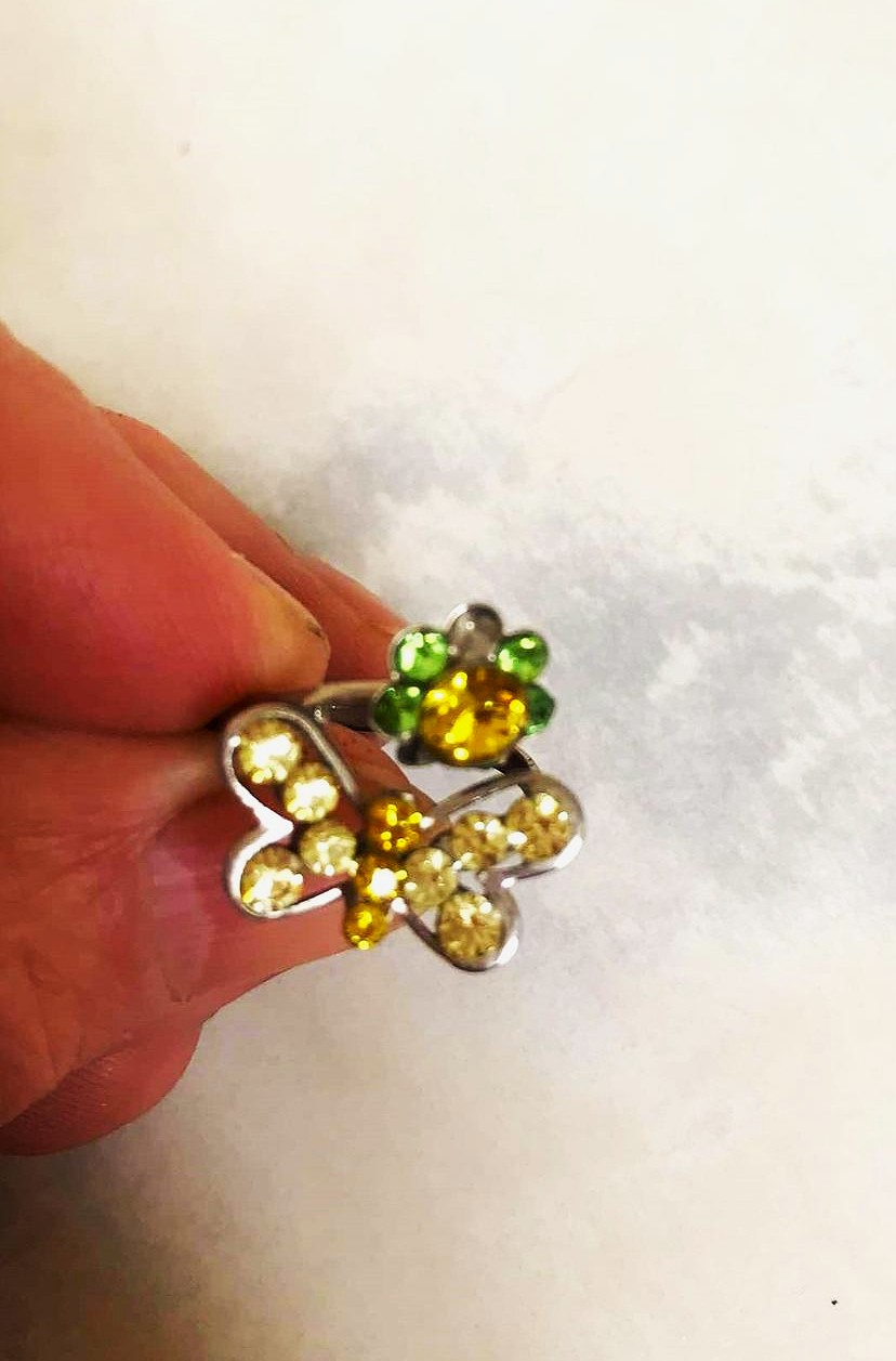 zaujímavý štrasový prsteň,použitý,je jemne pokrivený,ale pri nosení to nie je absolútne vidieť - a to z dôvodu,že obvod na prst je povoliteľný - variabilný