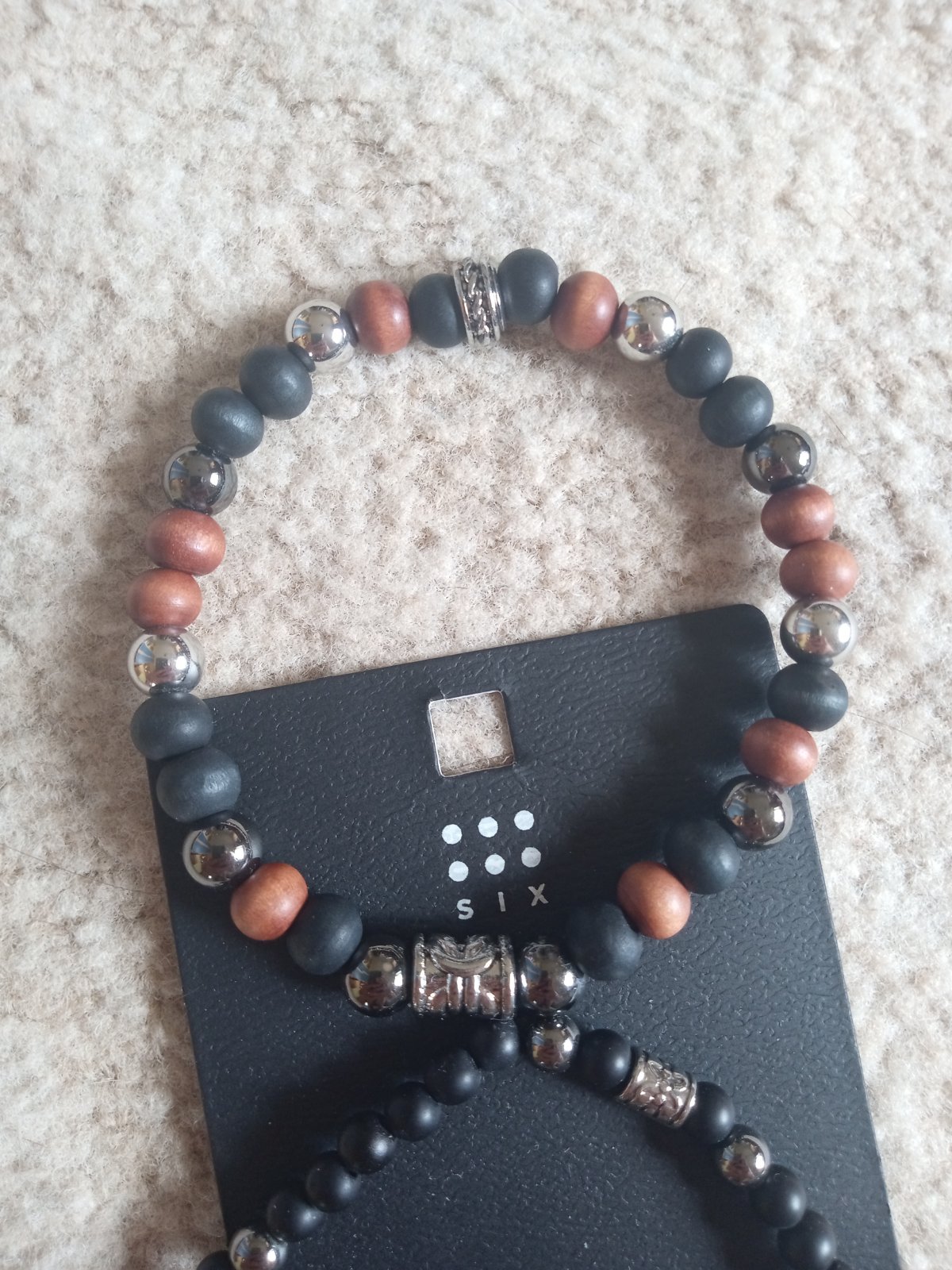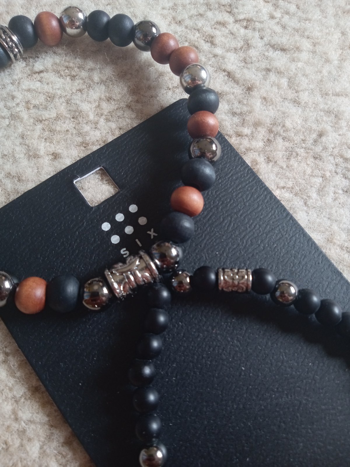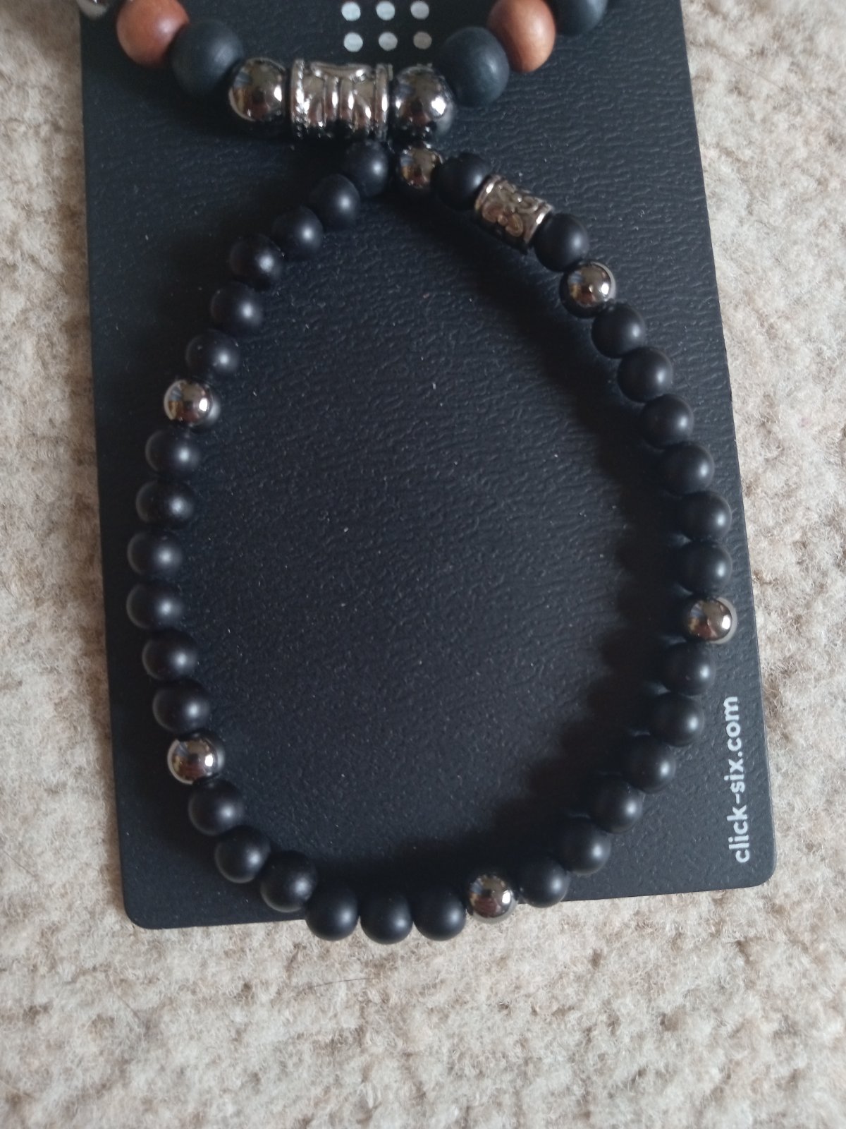 Náramok z minerálnych kameňov láva, ónyx a tigrie oko. Doplnený nerezovou futbalovou loptou a strieborným príveskom. Priemer kamienkov je 6mm.