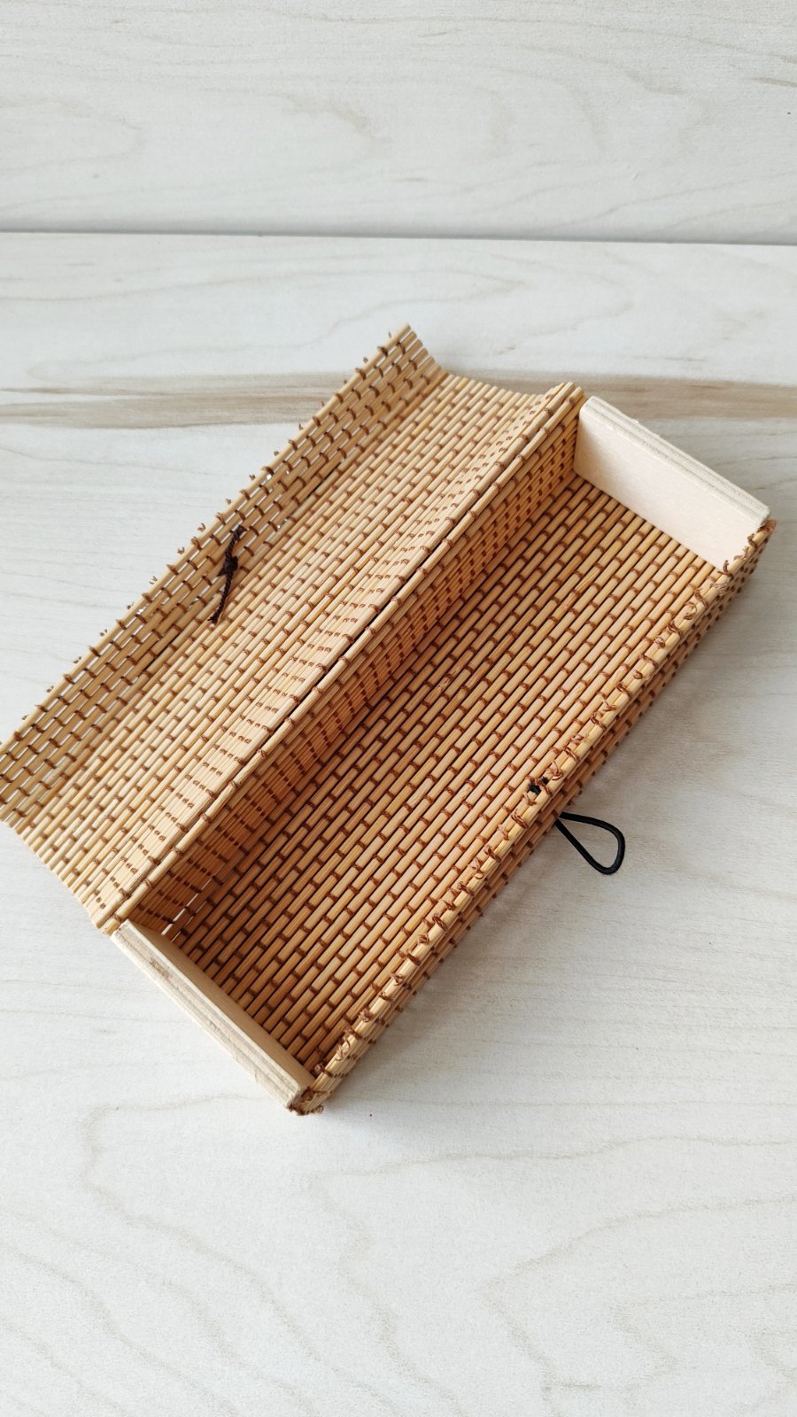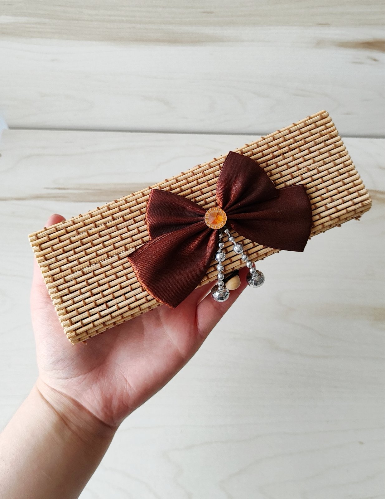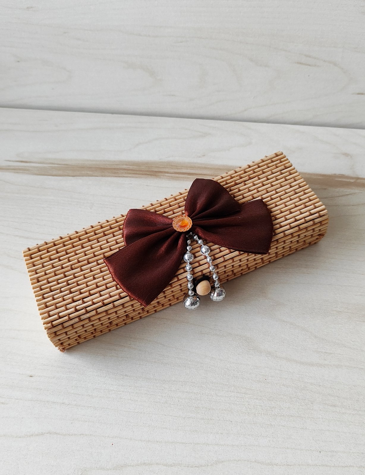 Hnedá elegantná bambusová šperkovnička, úložná krabička, zdobená mašľou.