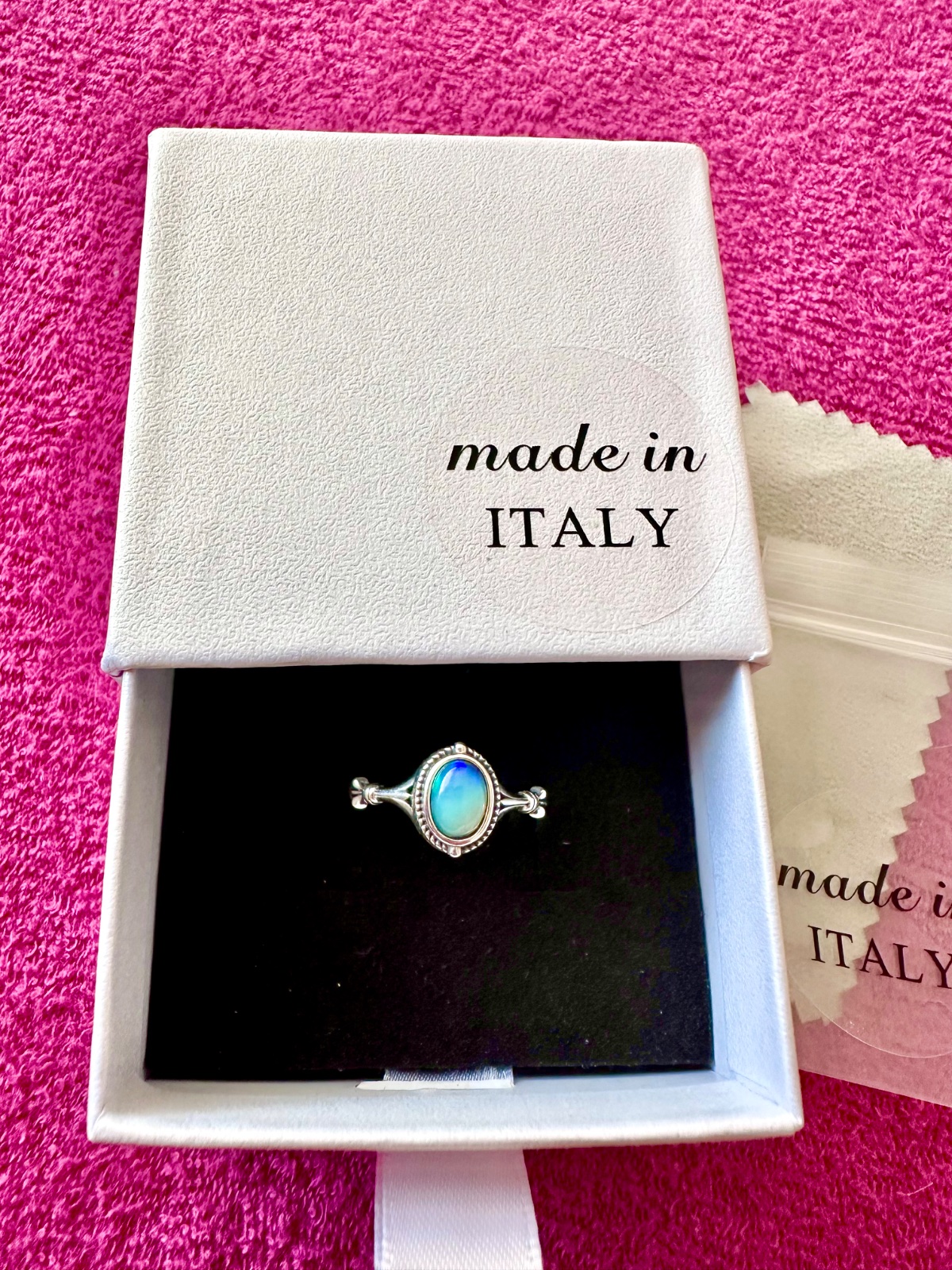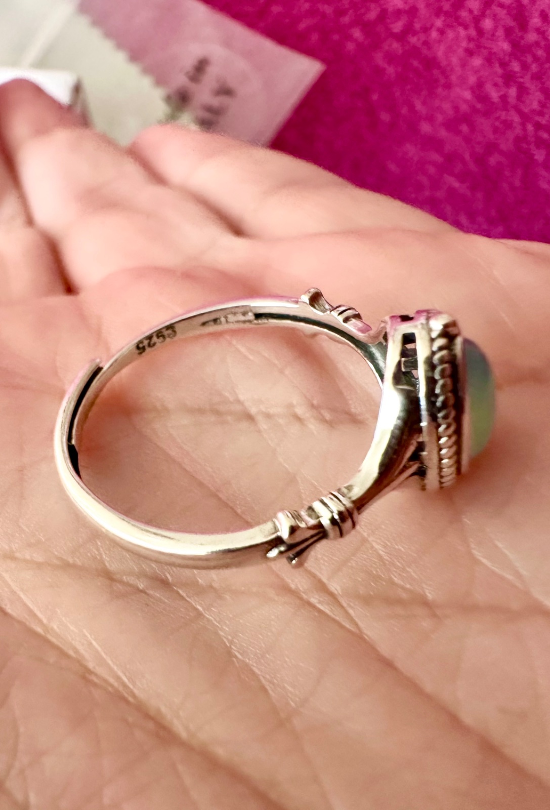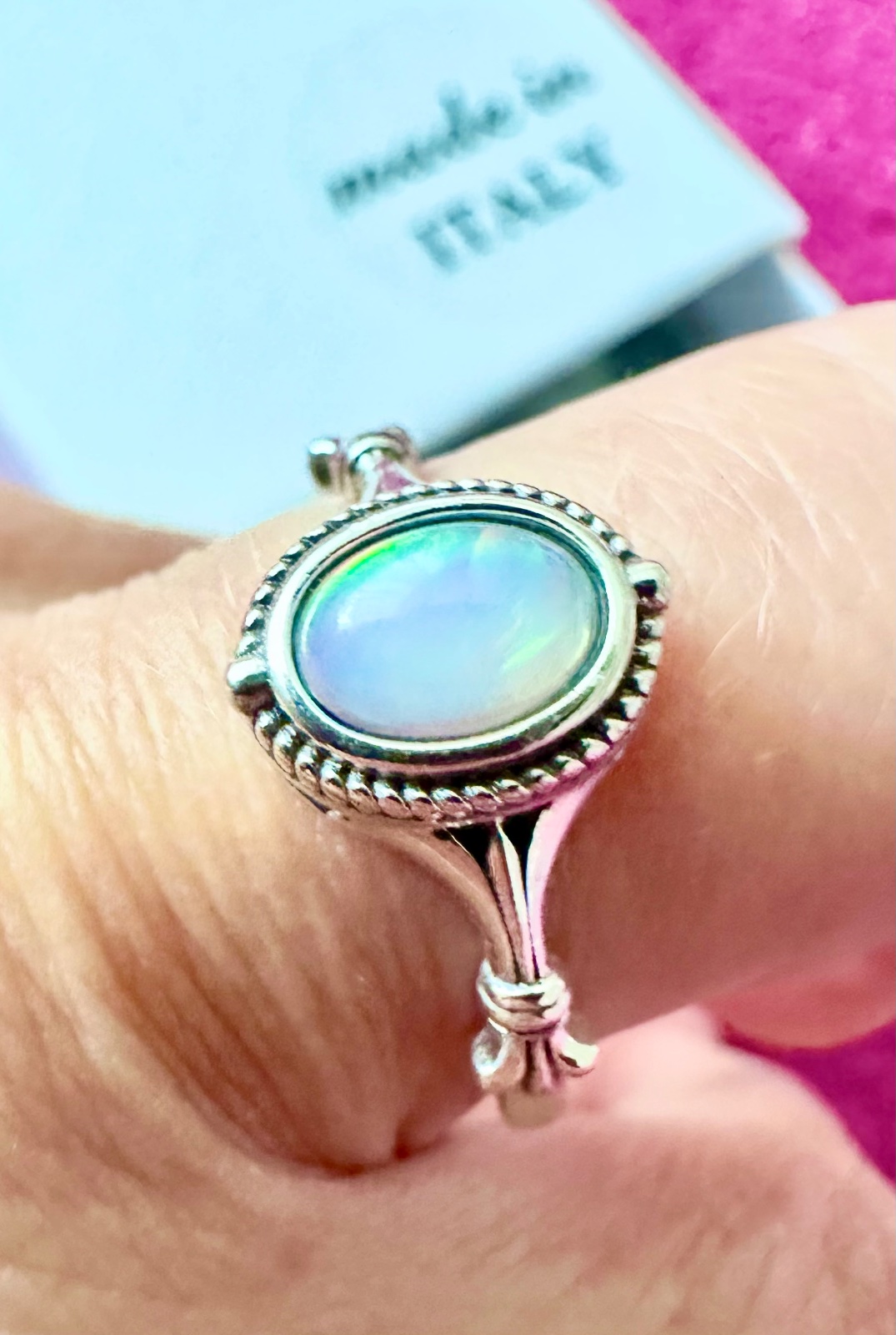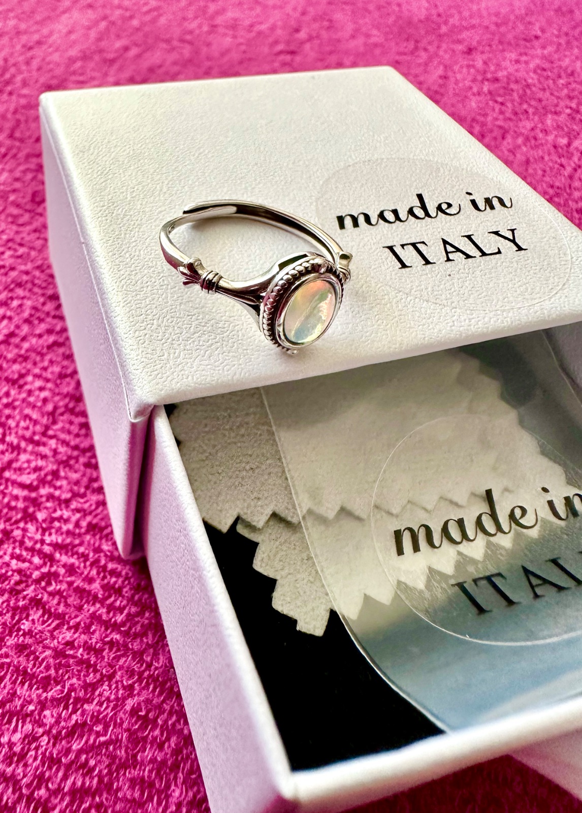 Predám krásny nový strieborný prsteň vo vintage štýle s pravým opálom. Prsteň má nastaviteľnú veľkosť a punc striebra. K prstienku je krabička a čistiaca handrička na striebro.