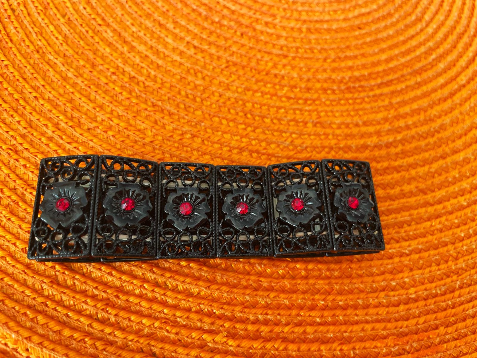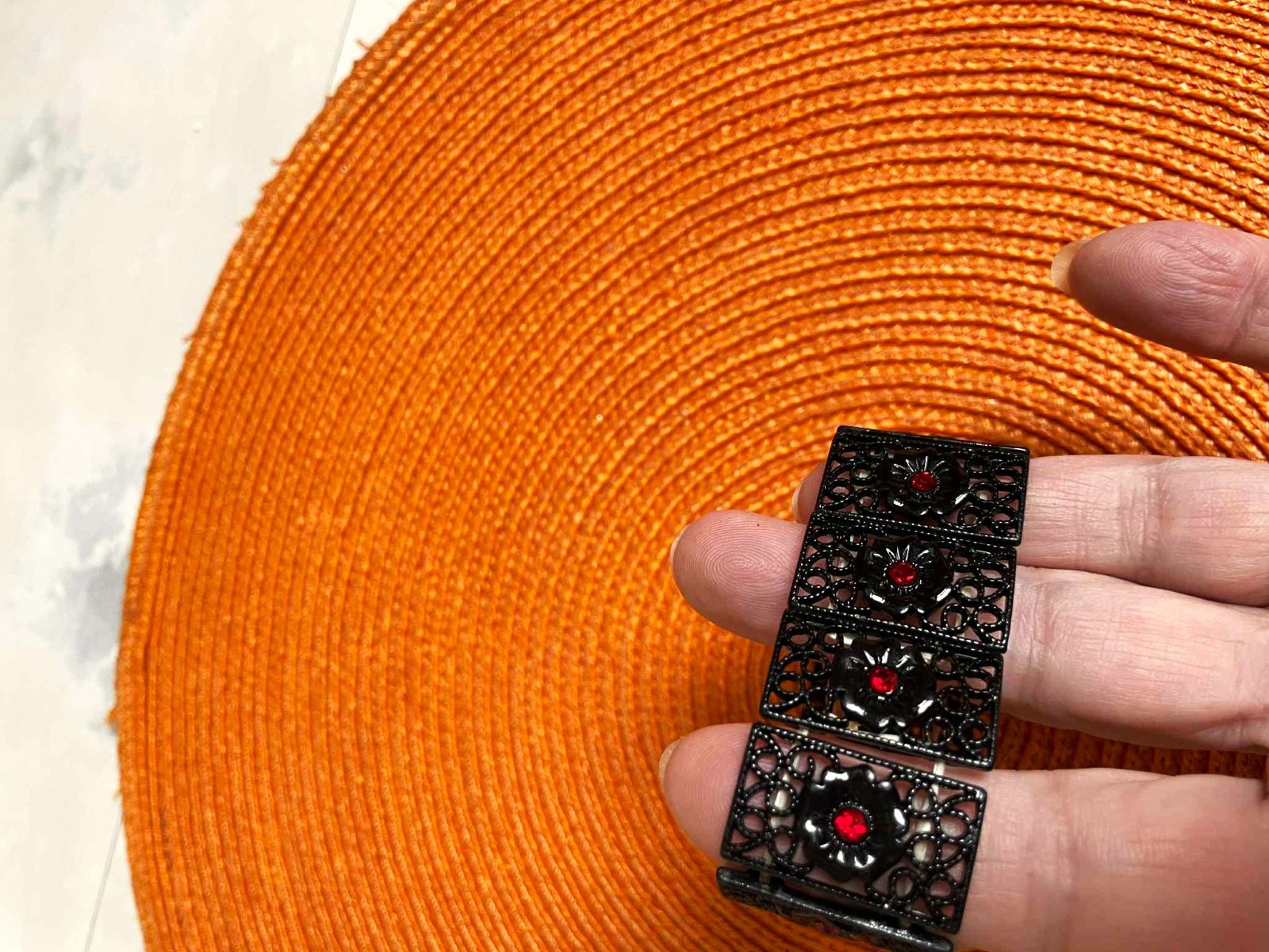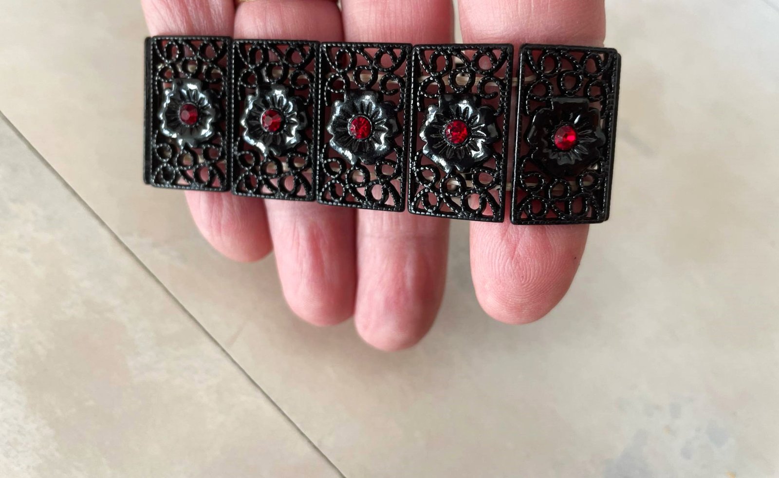 krásna čipková dierkovaná práca,na gumičku, v strede krásne priesvitné červené očko hrajúce podľa svetla rôznymi odtieňmi
