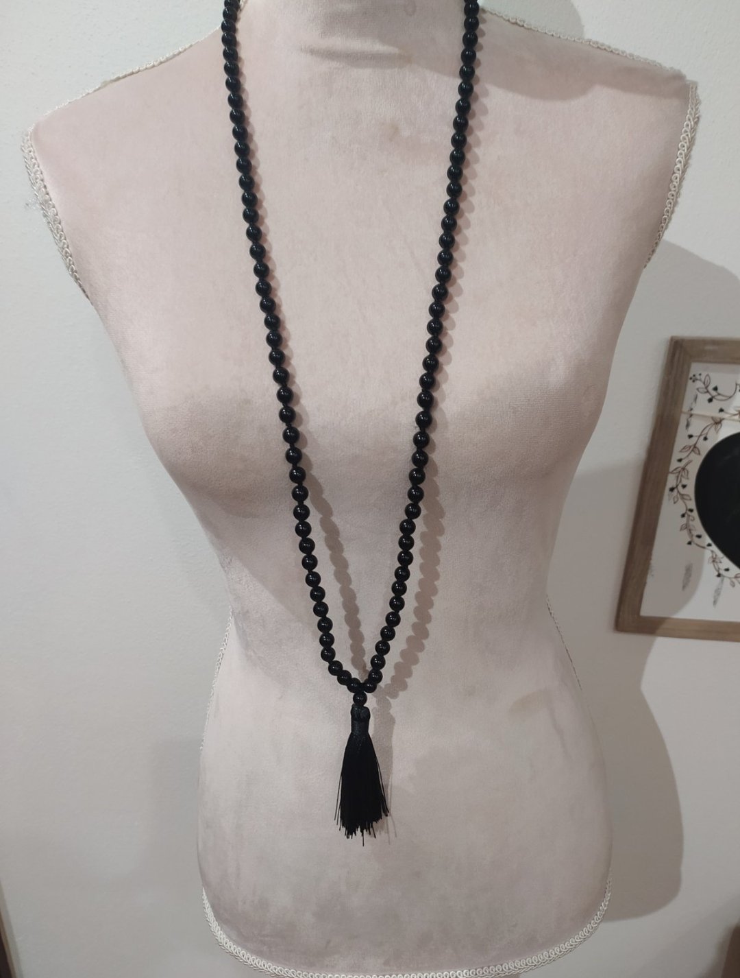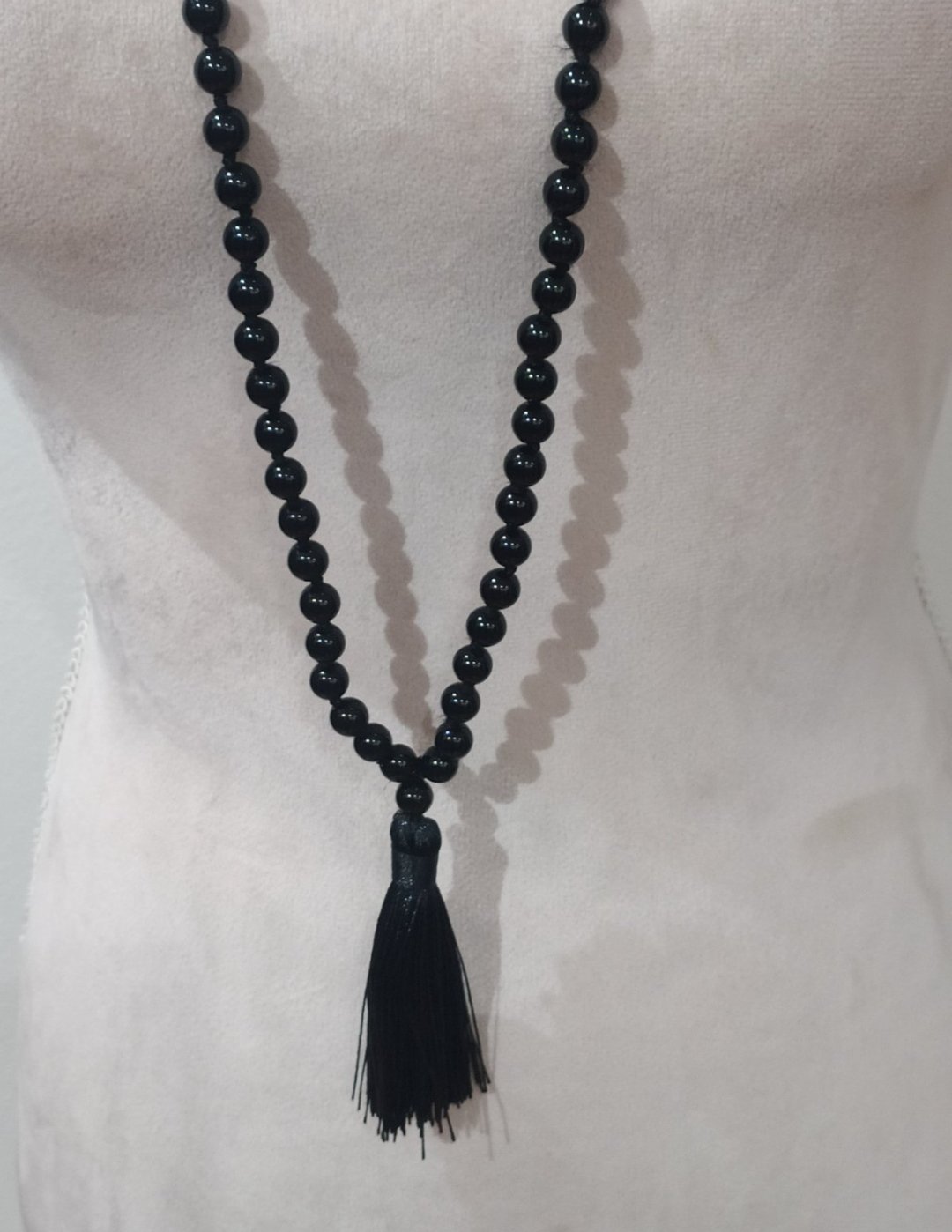 Jednoduchý náhrdelník s čiernou šnúrkou a trblietavou ozdobou v strede.