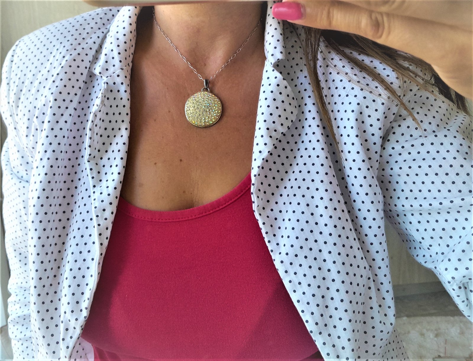 nevymieňam!!!nosený,s trblietavým medailónom s AB odleskami,dĺžka retiazky 42cm,medaion má priemer 3,8cm..kuk aj na iné moje inzeráty