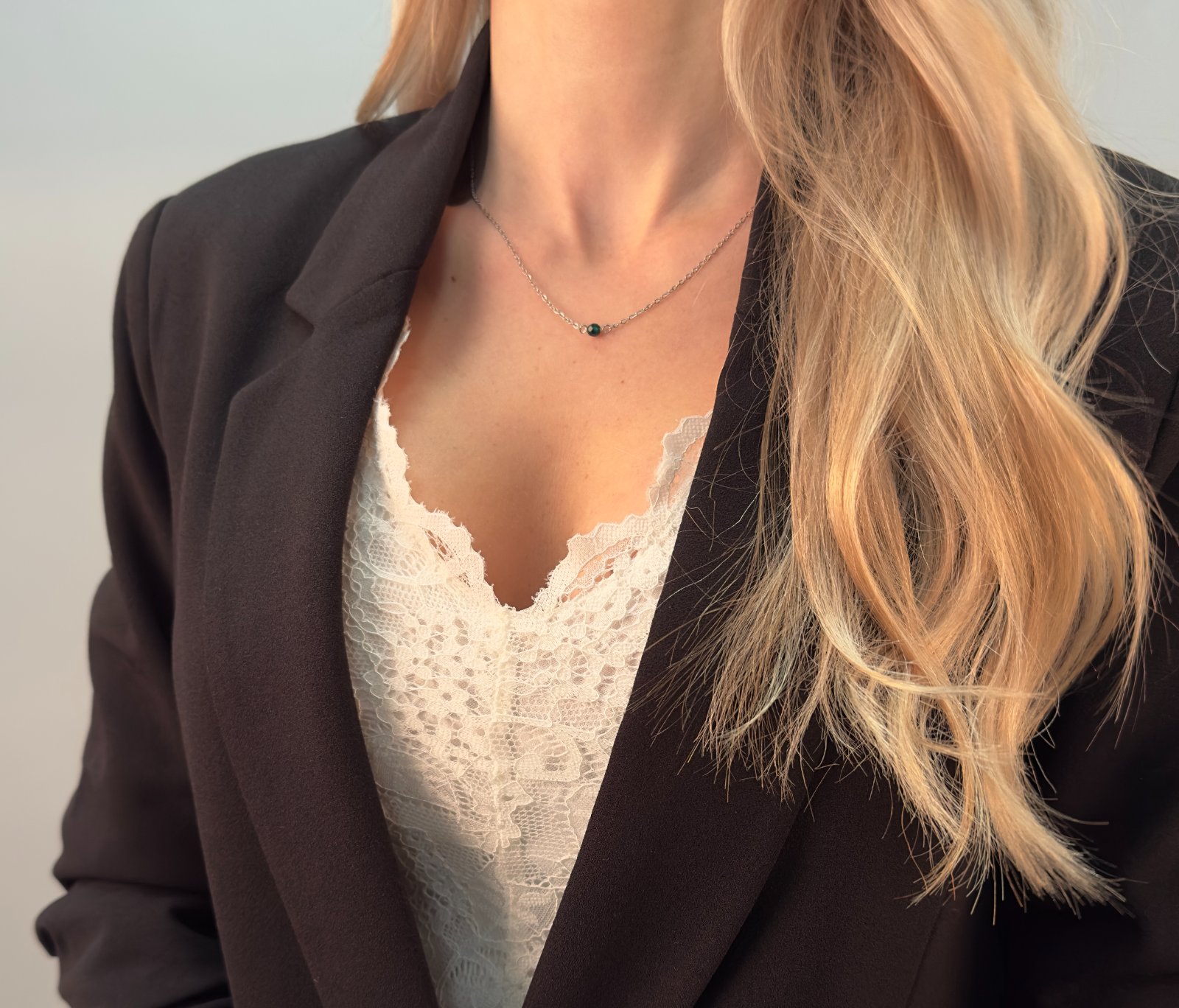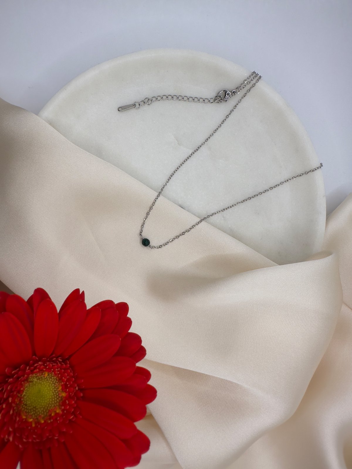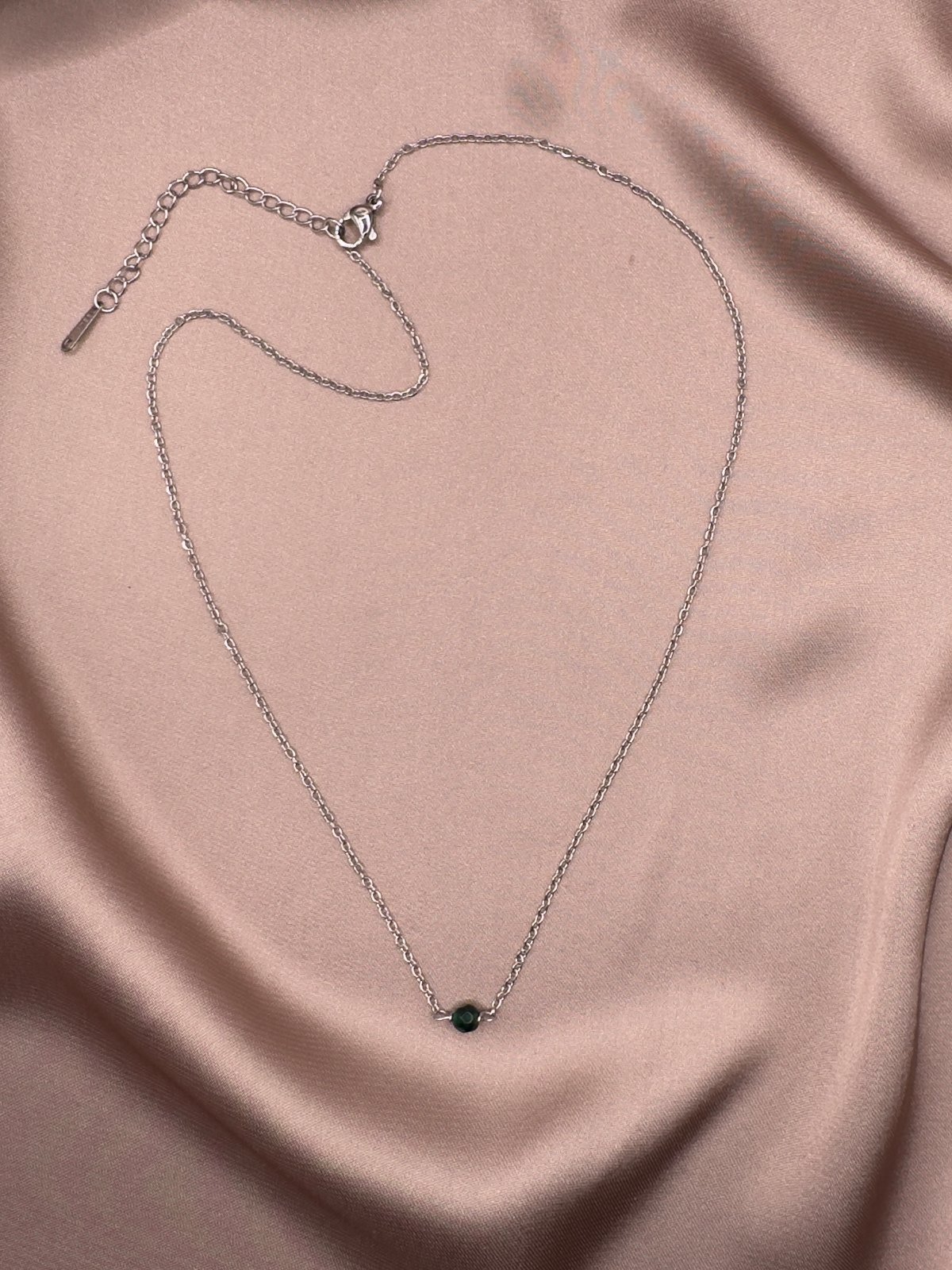 Jemný náhrdelník vyrobený z chirurgickej ocele, doplnený korálkou zo zeleného onyxu. Tento minimalistický a elegantný šperk je navrhnutý tak, aby ladil s každým štýlom – od bežného dňa až po slávnostné príležitosti.