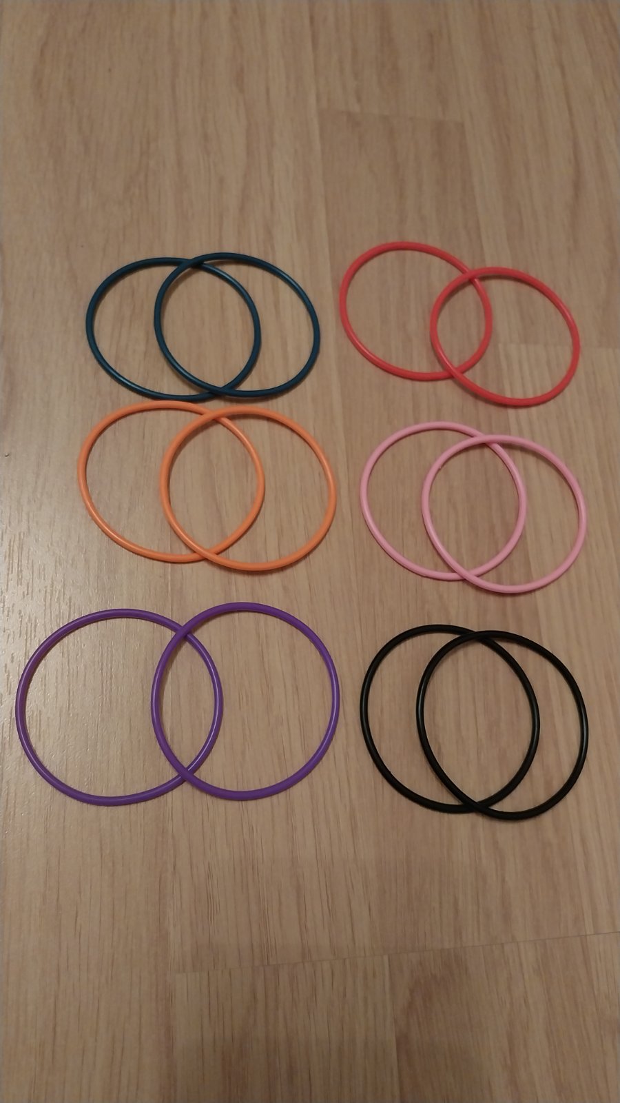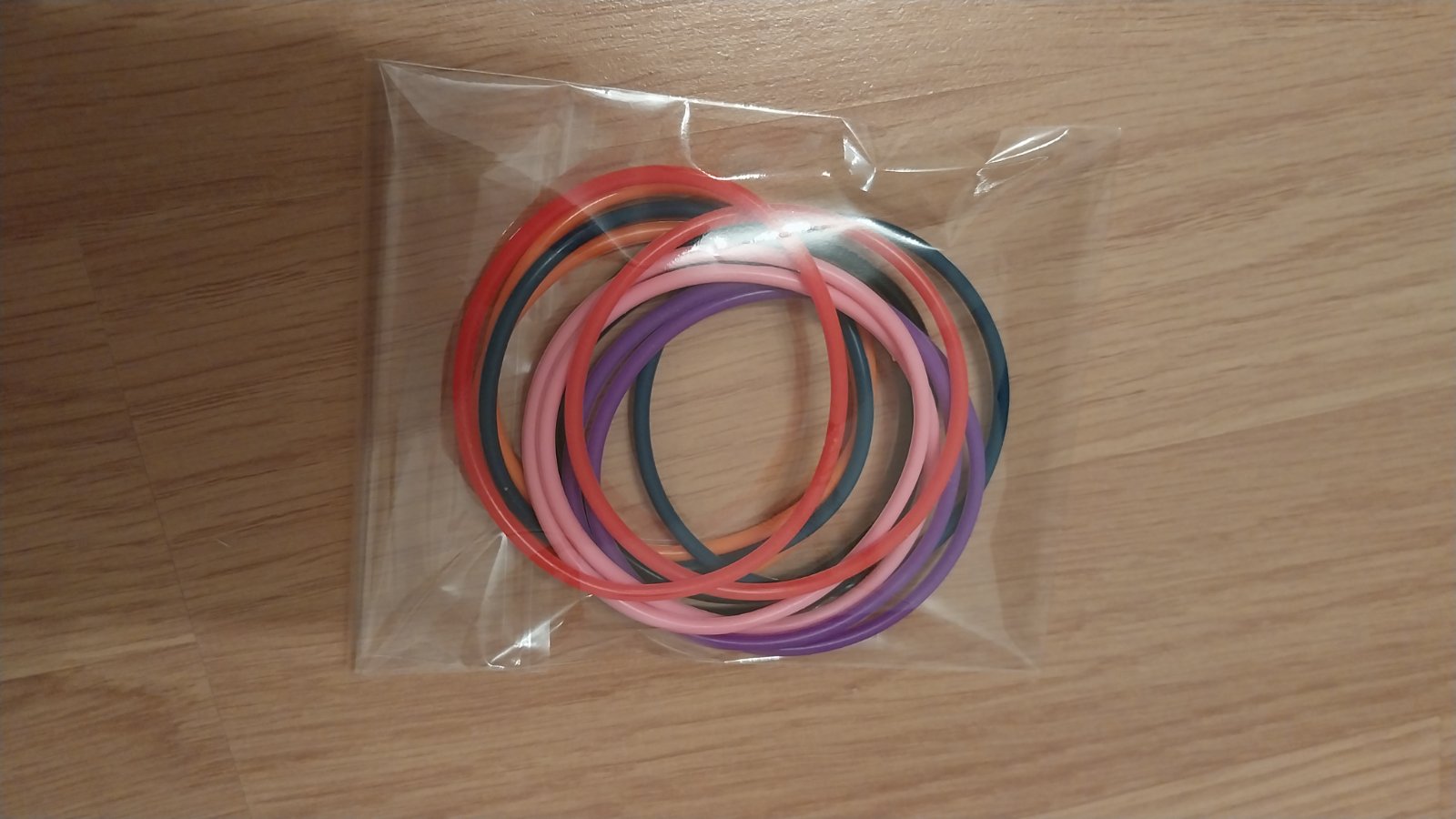balenie 12 silikonovych naramkov - na vyrobu 6tich farieb Infinity naramkov. Kupovane pre maminu, ale jej su male (ma dost hrubu ruku, fotila som ich ja na svojej ruke). rozmery su nafotene