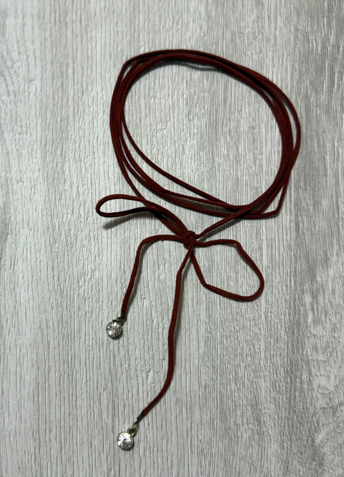 Predám choker na krk s kamienkami. Dá sa ľubovoľne zaviazať. Párkrát použitý. Farba bordovo-tmavohnedá.