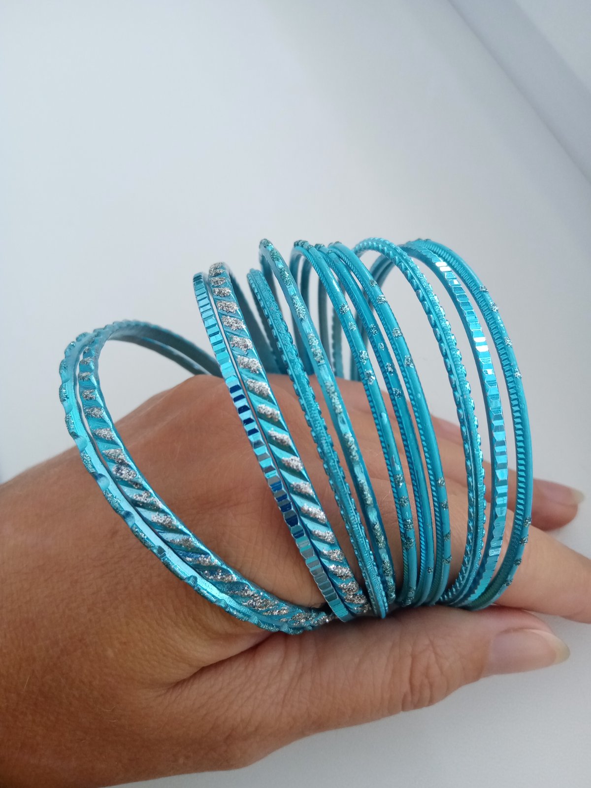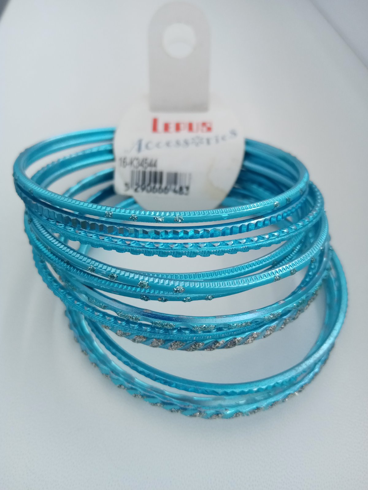 Sada okrúhlych kovových náramkov v krásnej jasnej modrej farbe. Nové, nenosené.