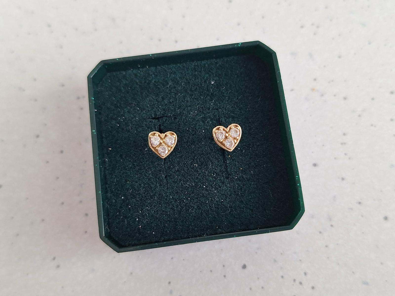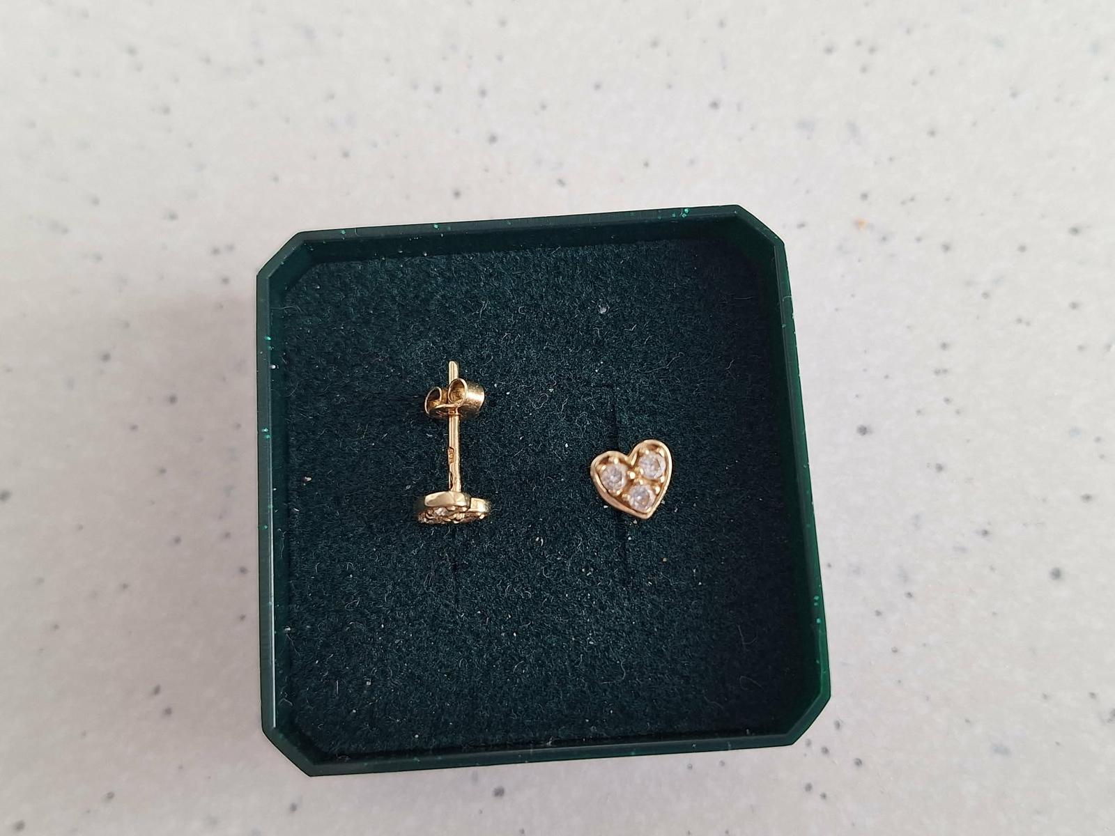 predám malé zlaté 14 karátové napichovacie náušnice so zirkónmi, rýdzosť 0,585 jedna šrubka chýba.