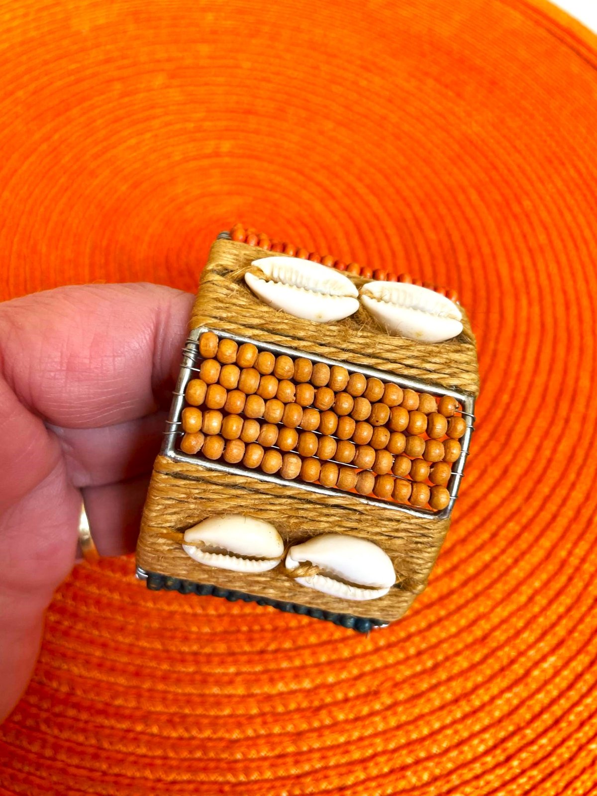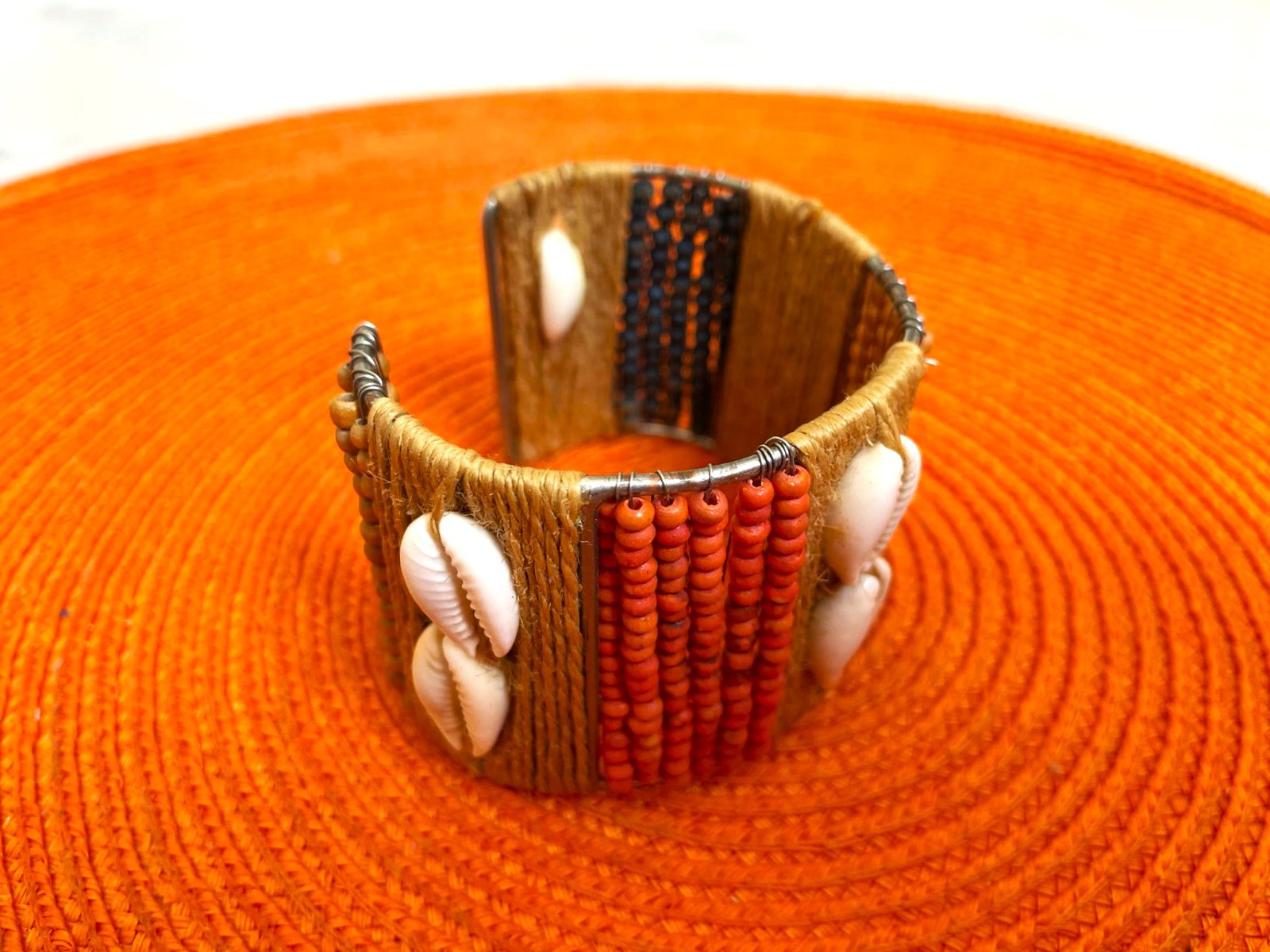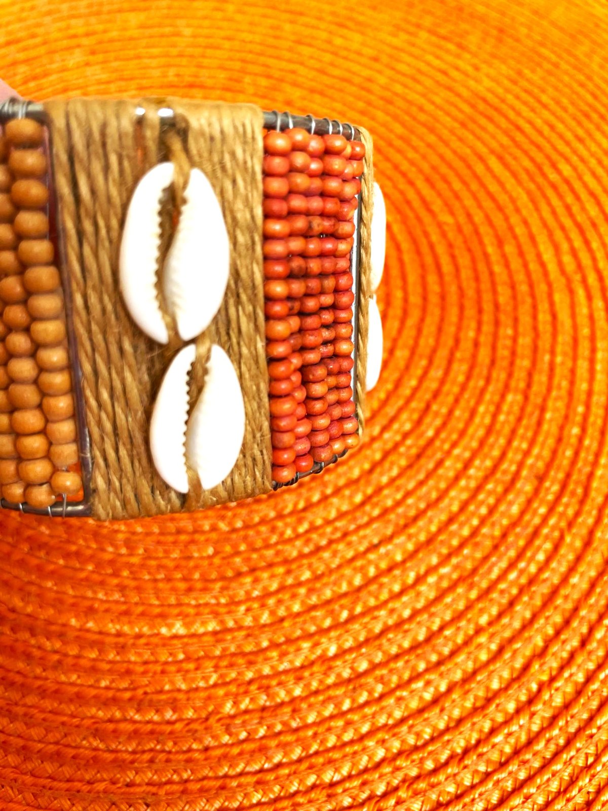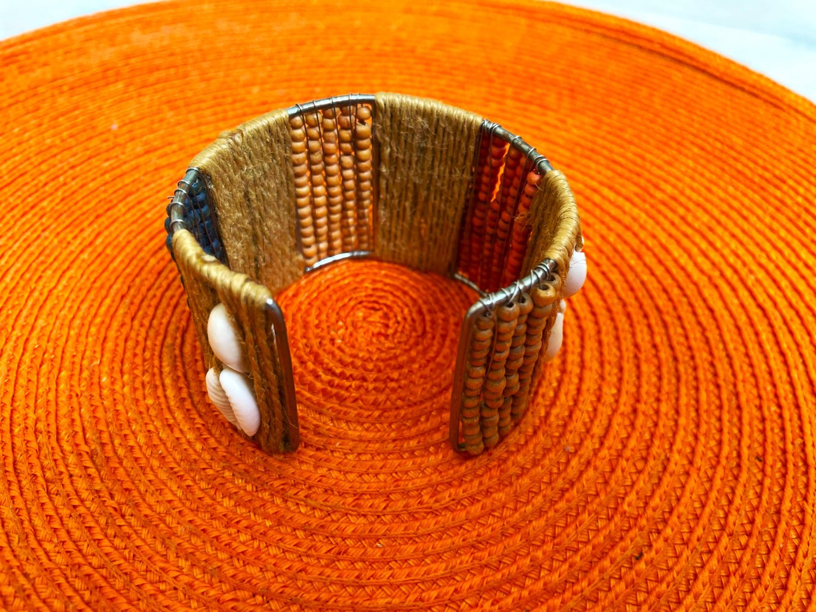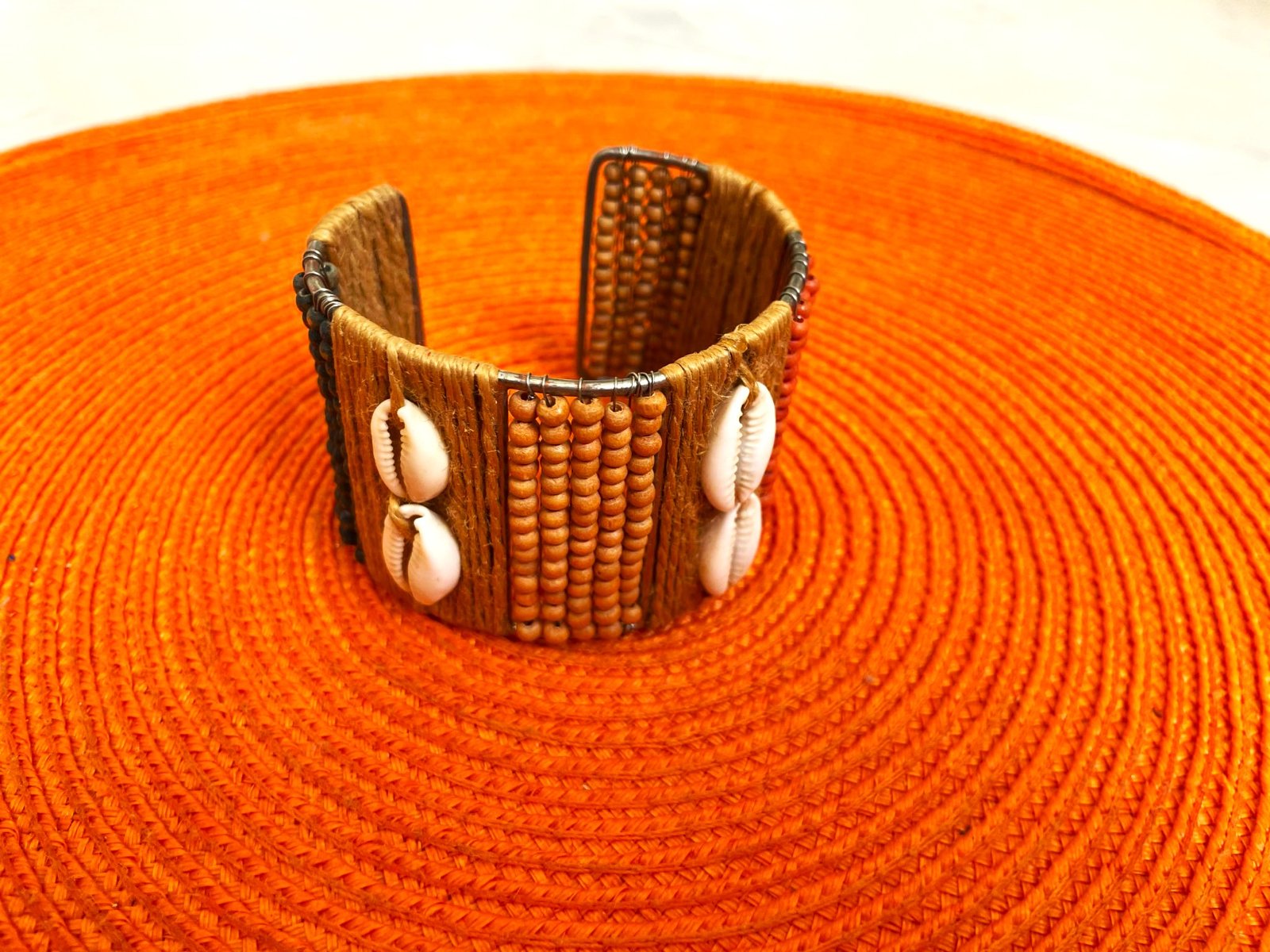 veľmi zaujímavý a netuctový náramok,ručne robený,s drevenými korálkami a mušličkami,nastaviteľný, v top stave
