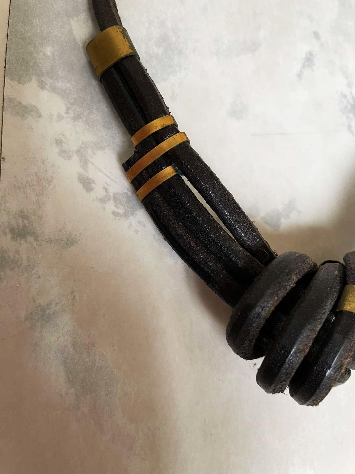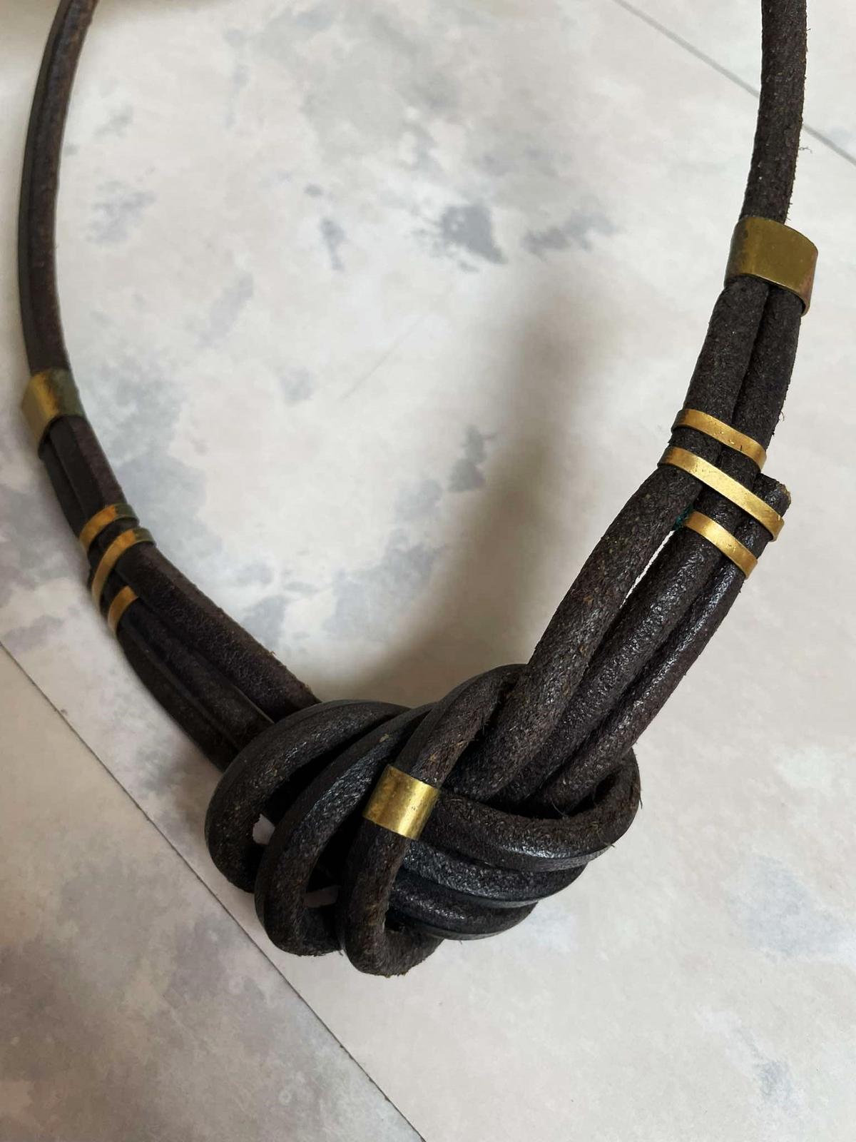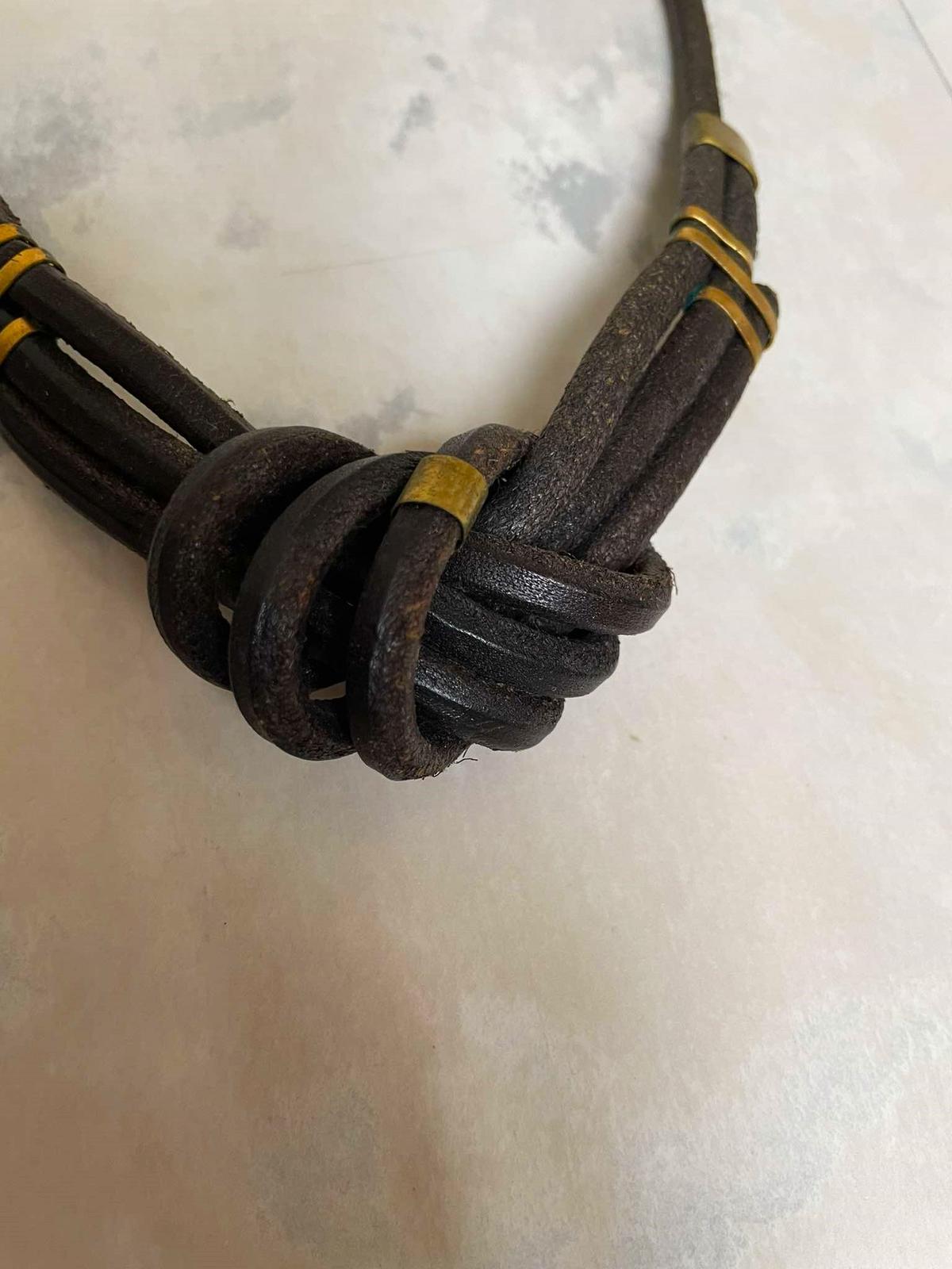 zaujímavý naturálny náhrdelník,pravá koža,veľmi zaujímavý uzol kombinovaný s kovovými ozdobnými sponami,pozri k tomu aj náušnice,super vyzerá ku košeli ale aj k pleteným pulóvrom,náušnice - hand made vyrobené,nie priemyselne,top stav,pravá koža,na konci drevená gulička