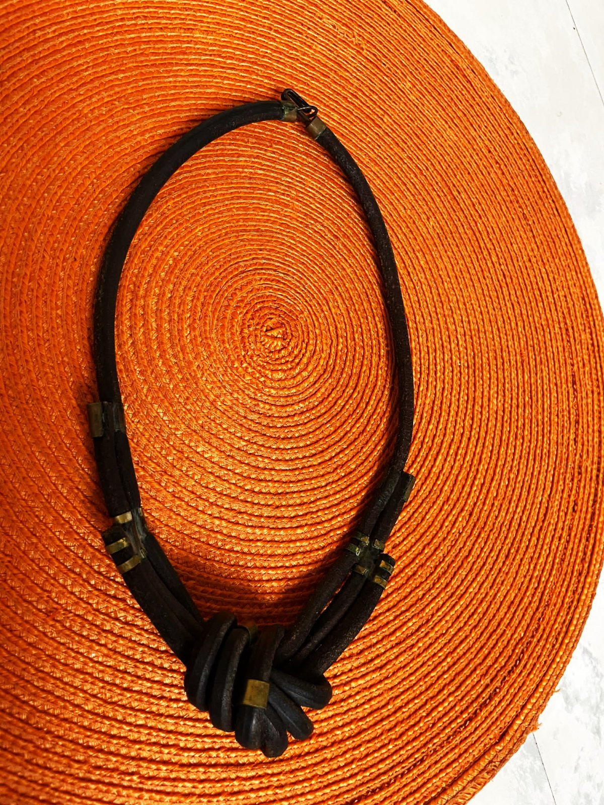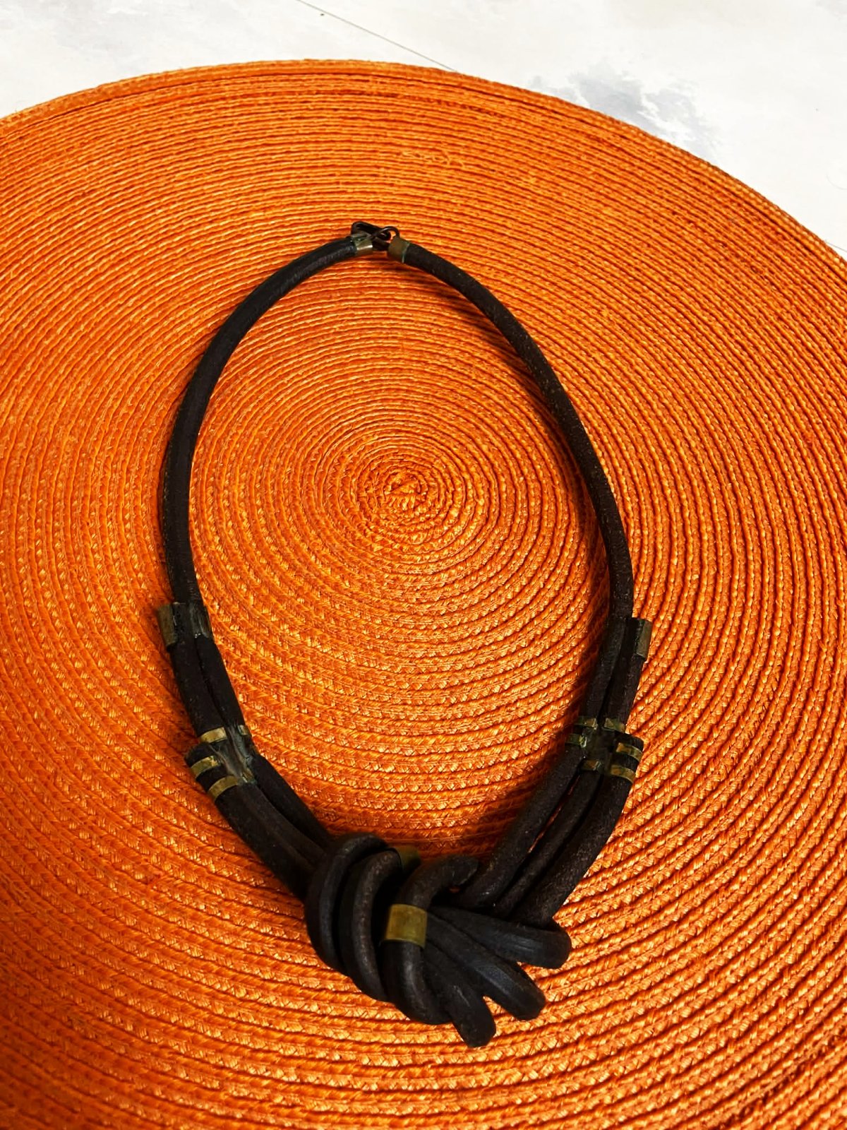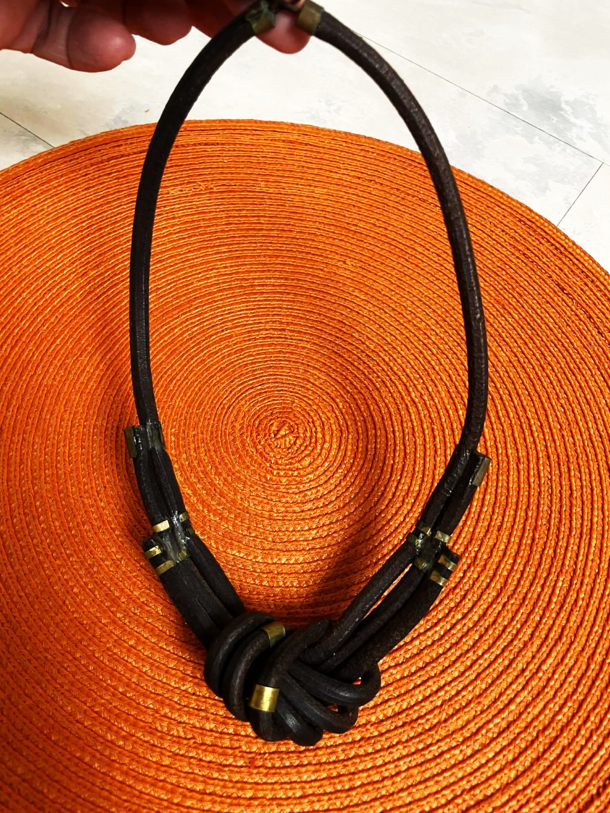 zaujímavý naturálny náhrdelník,pravá koža,veľmi zaujímavý uzol kombinovaný s kovovými ozdobnými sponami,pozri k tomu aj náušnice,super vyzerá ku košeli ale aj k pleteným pulóvrom,náušnice - hand made vyrobené,nie priemyselne,top stav,pravá koža,na konci drevená gulička