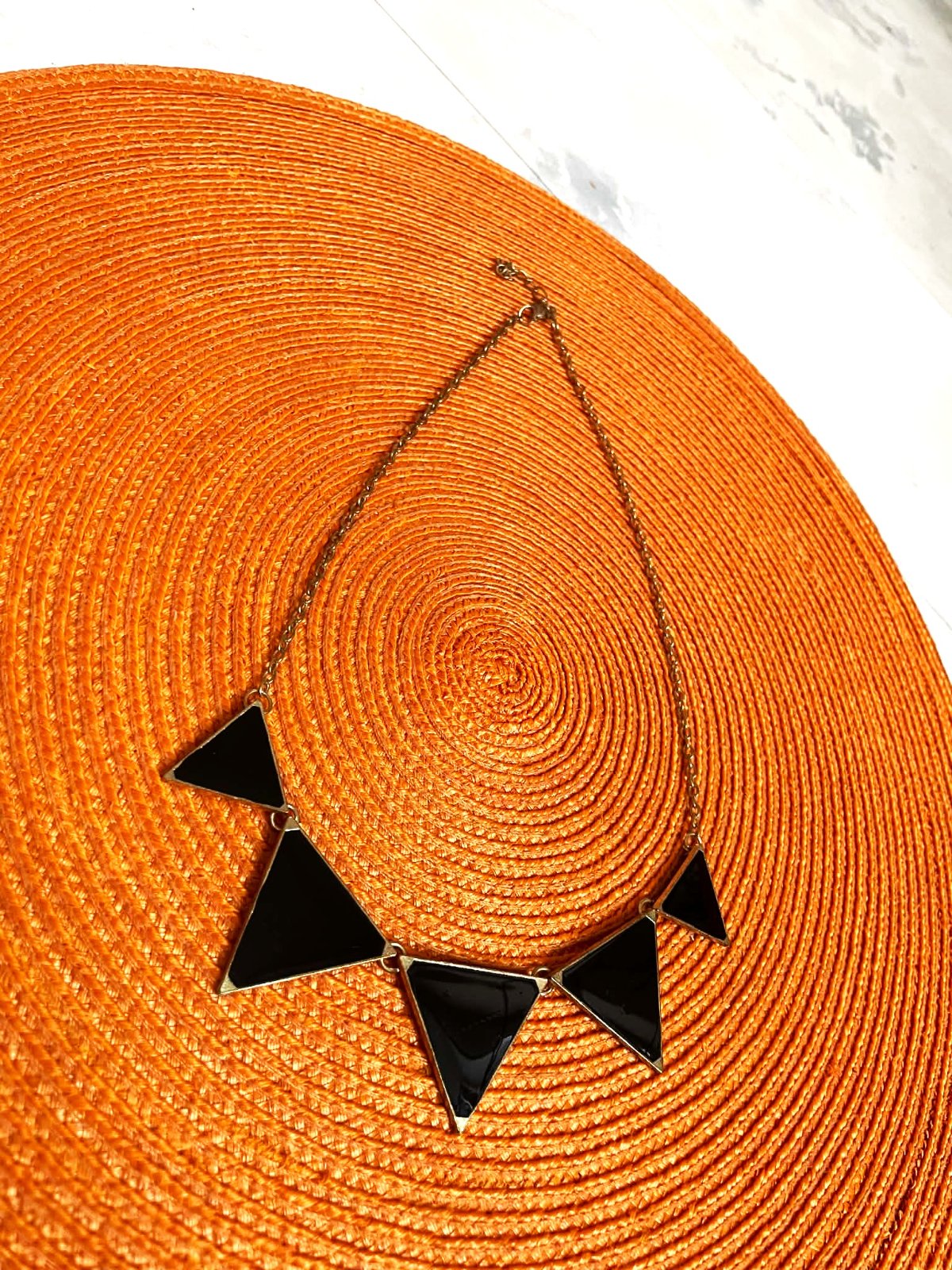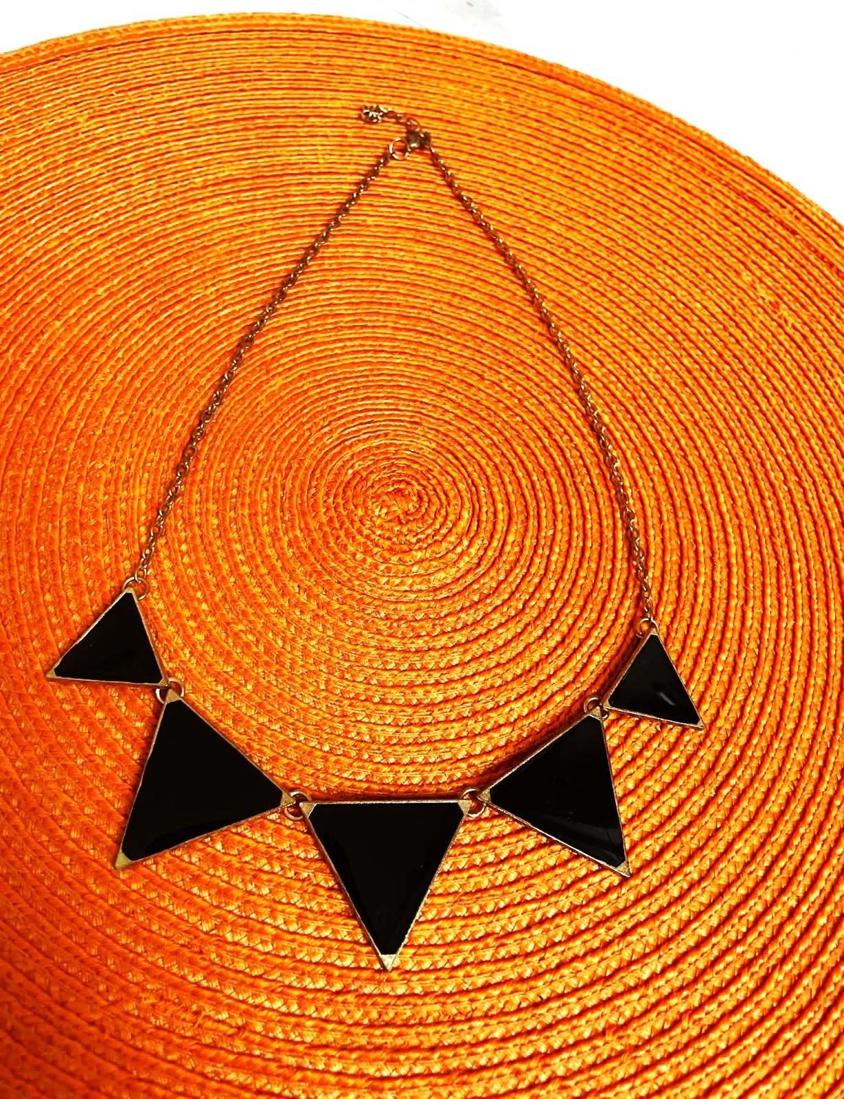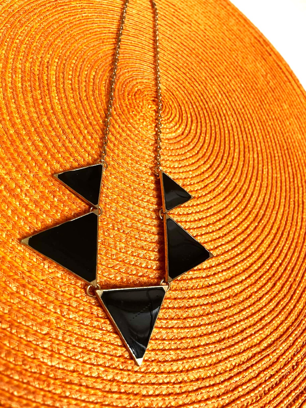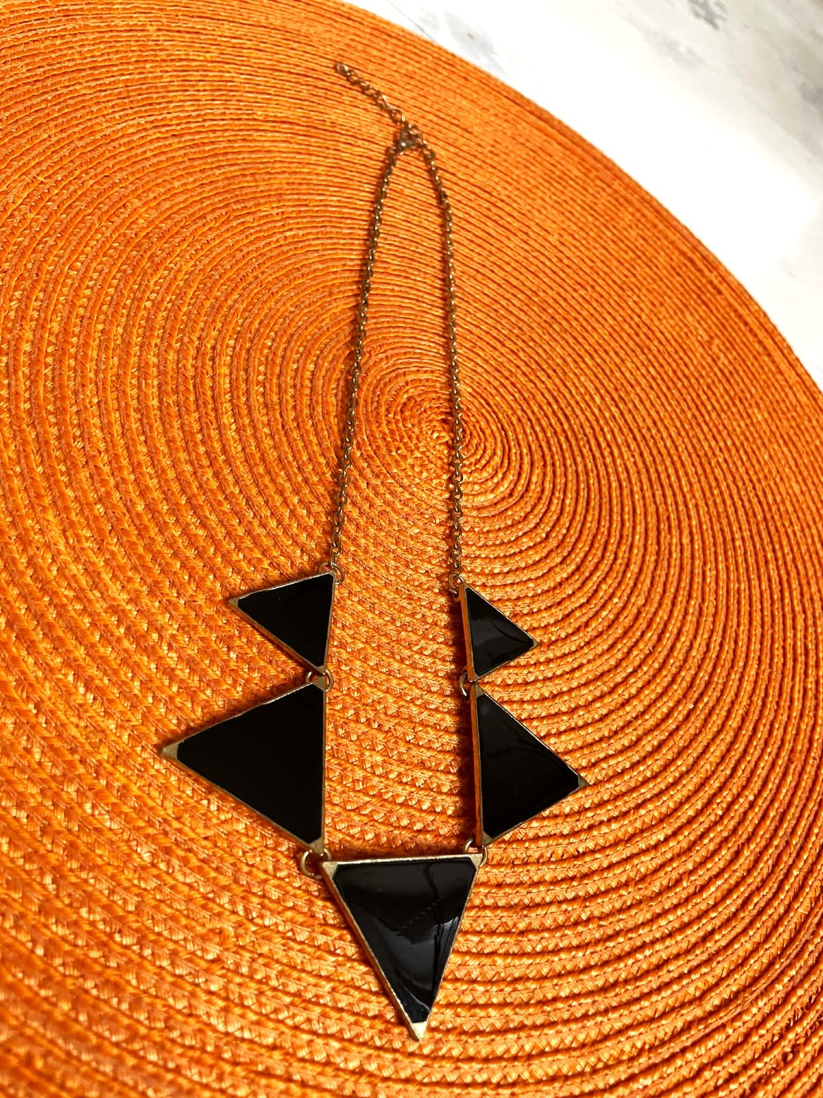 zaujímavý náhrdelník,trojuholník = 3 x 3 cm,malý 2,5 x 2, 5 cm,dlžka = 52 cm ( dá sa skrátiť ),trojuholníčky sú lesklé,ako keby sklenené