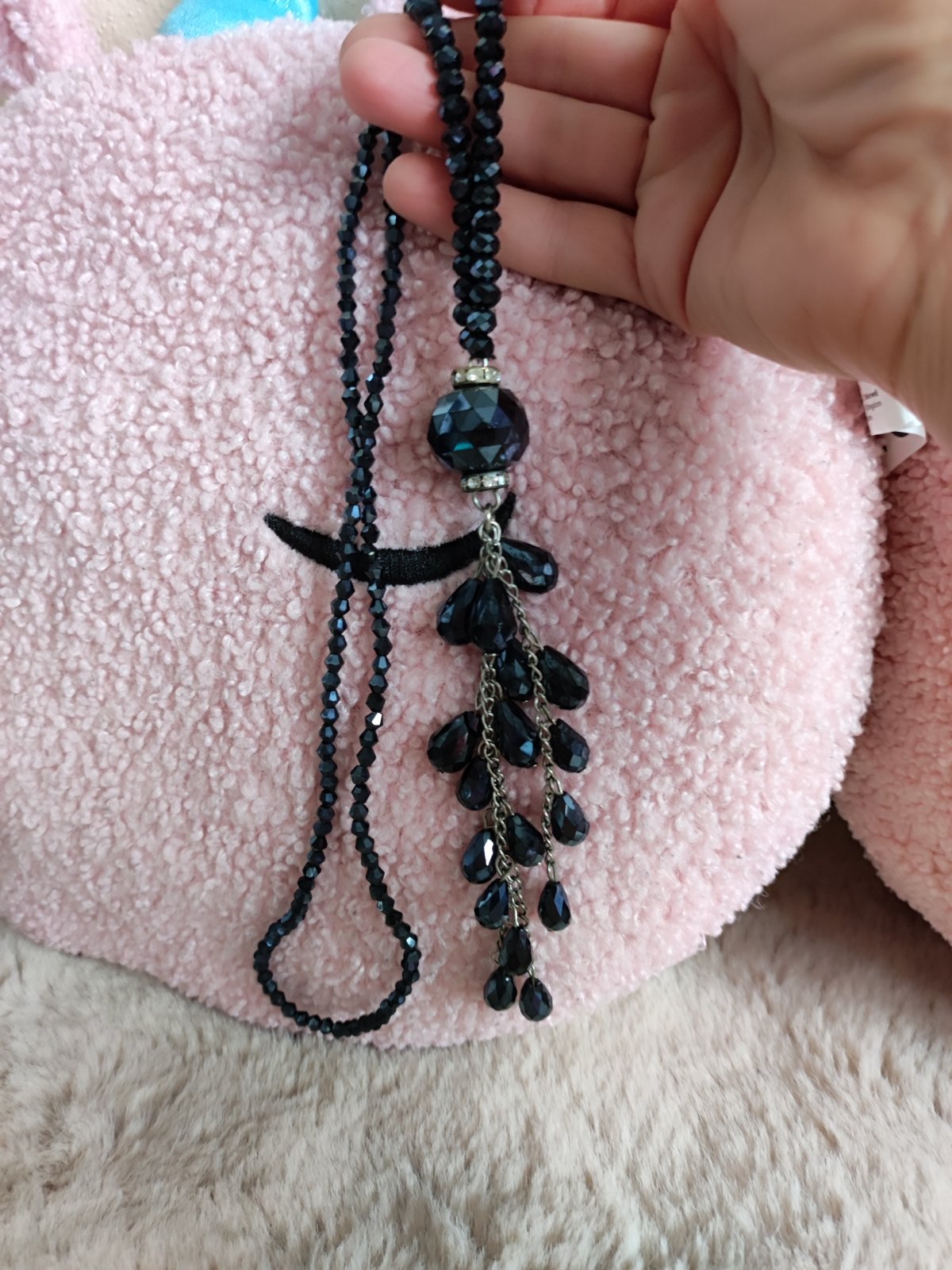 Jednoduchý náhrdelník s čiernou šnúrkou a trblietavou ozdobou v strede.