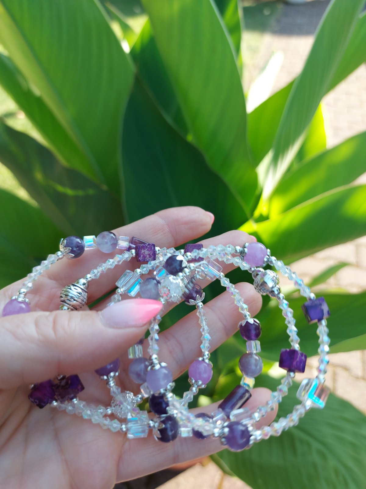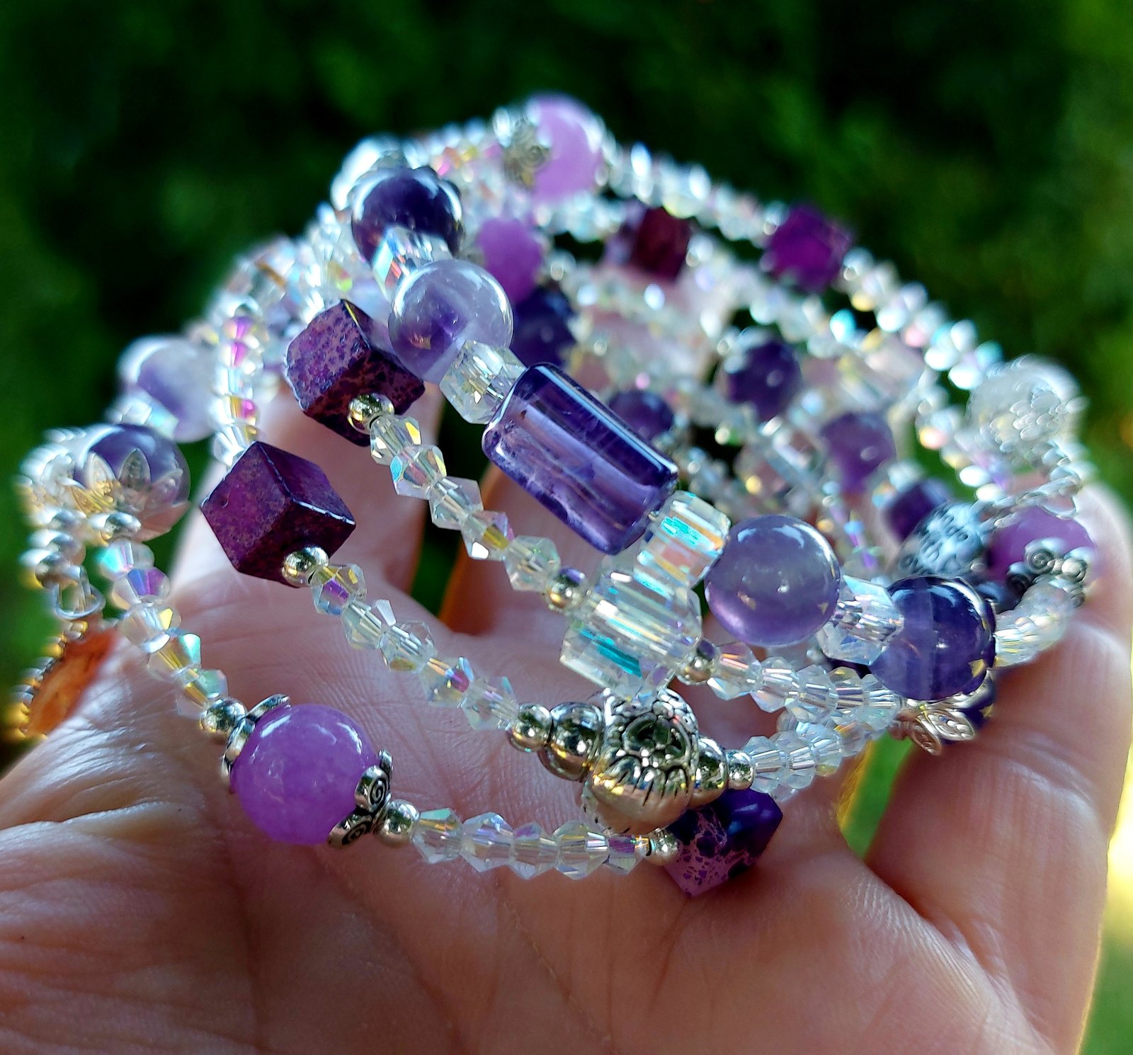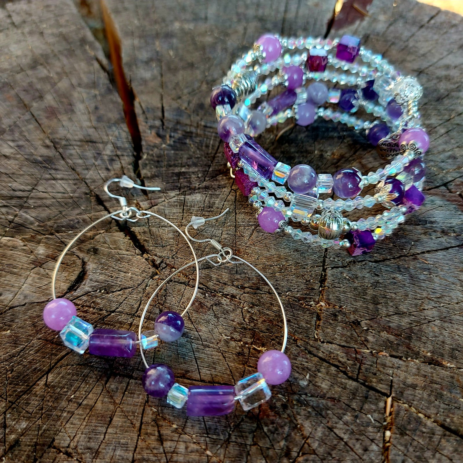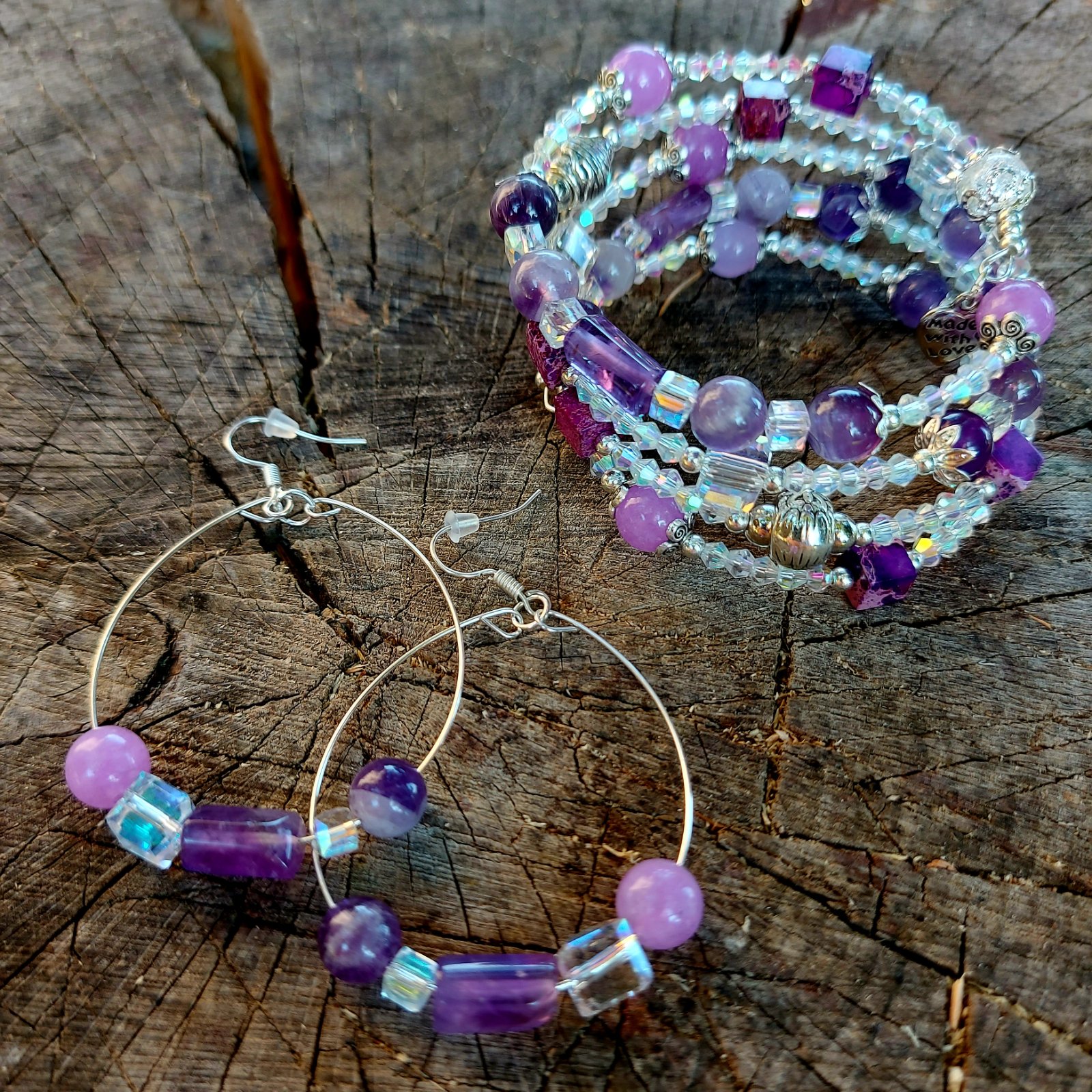 Tento elegantný a zároveň magický set náramku a náušníc som vytvorila s láskou z kvalitného pamäťového drôtu z nehrdzavejúcej ocele – takže si zachová svoj tvar, nech ho nosíš akokoľvek často. Hlavnými hviezdami sú Ametyst a jeho jemnejšia sestra – Orgovánový ametyst, ktoré som doplnila o ligotavé rakúske krištáliky a štýlové sklené kocky. Keď na ne zasvieti slnko, rozžiaria sa ako drobné poklady – no vážne, treba to vidieť naživo!