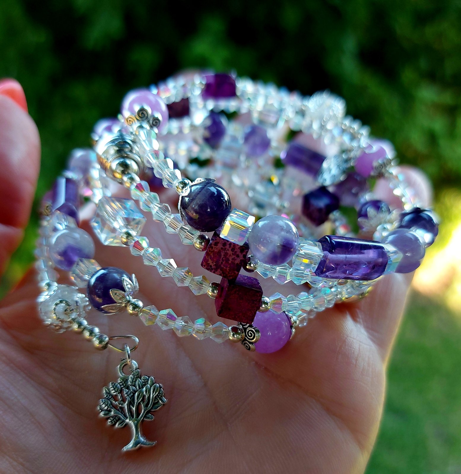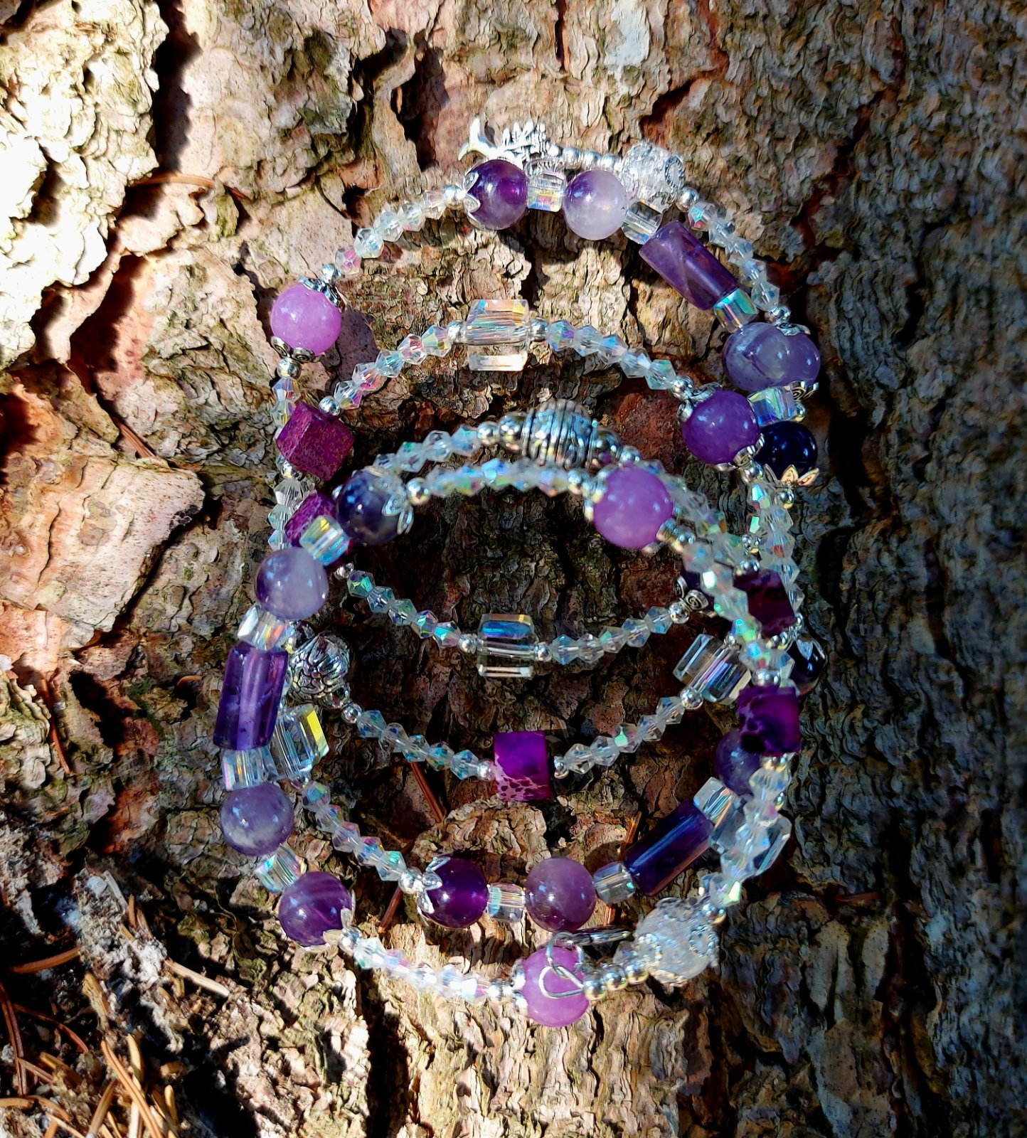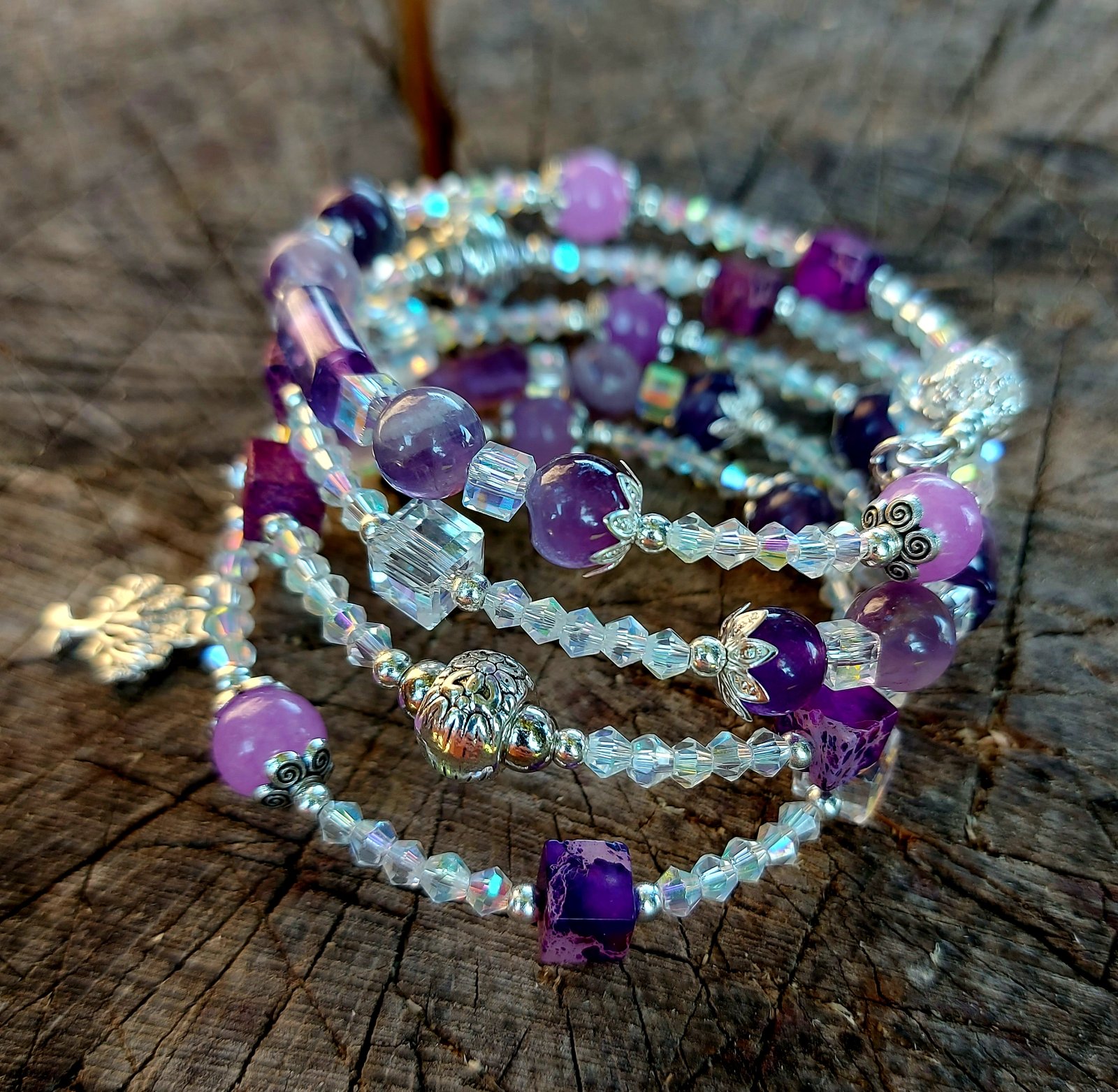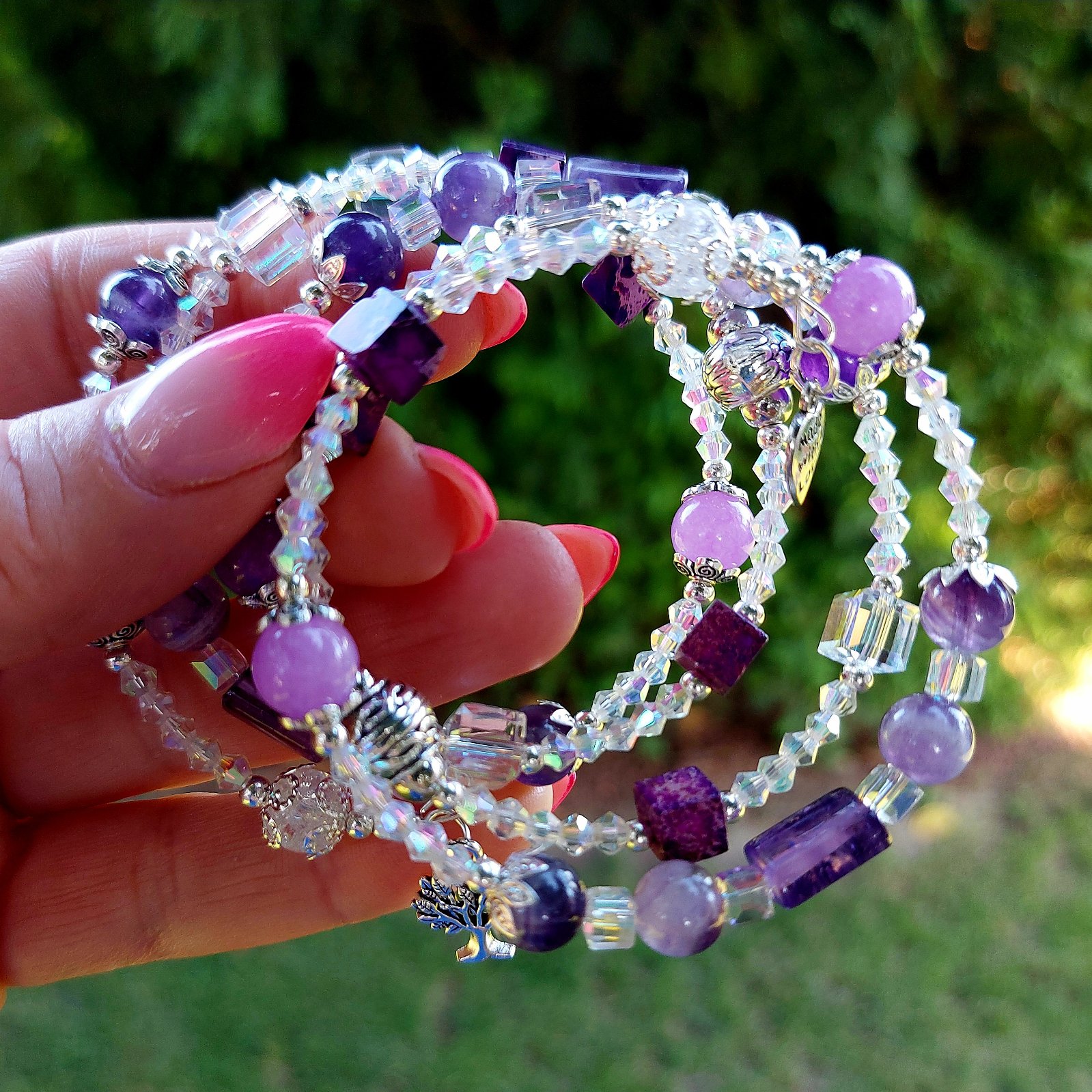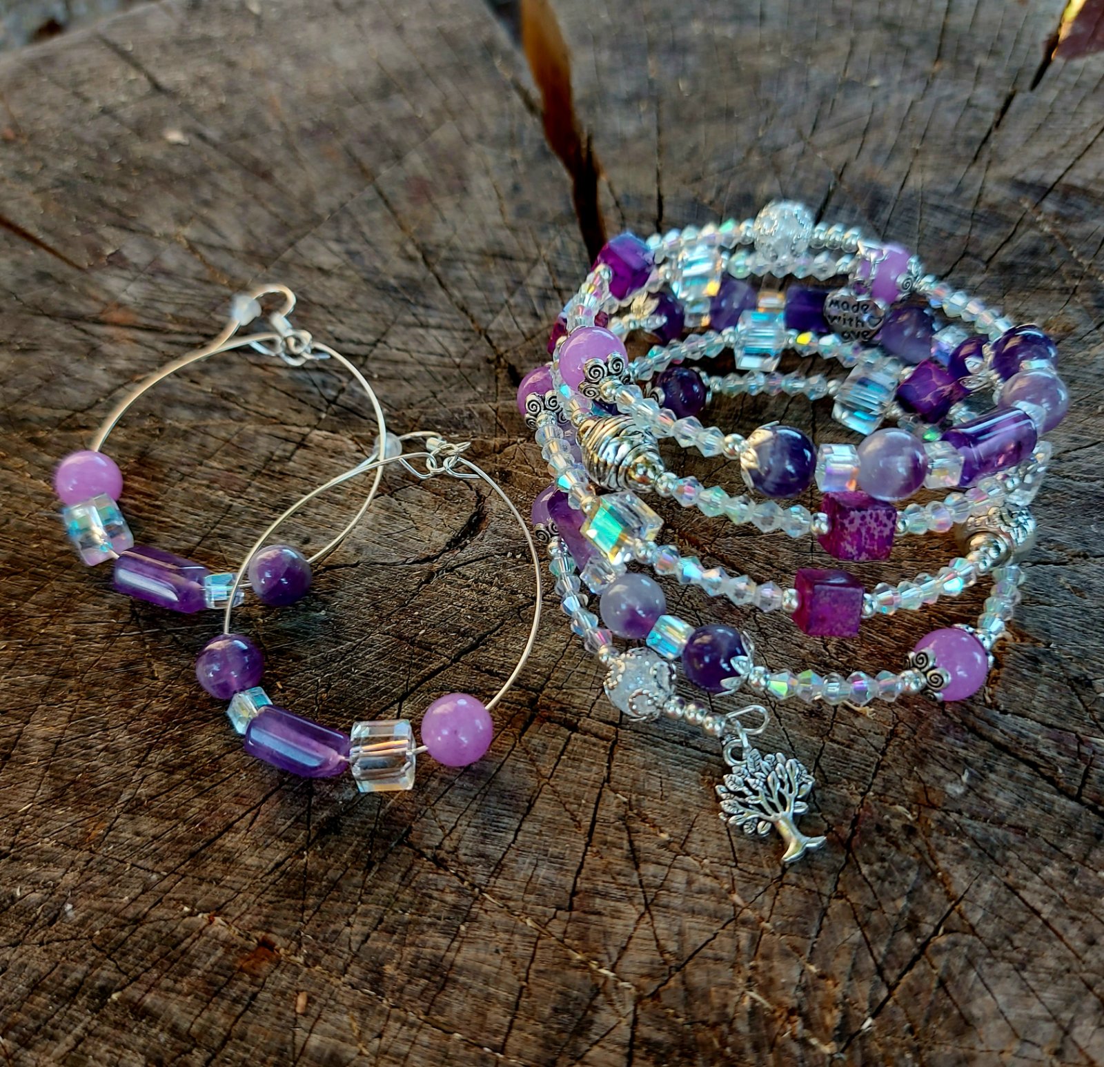 Tento elegantný a zároveň magický set náramku a náušníc som vytvorila s láskou z kvalitného pamäťového drôtu z nehrdzavejúcej ocele – takže si zachová svoj tvar, nech ho nosíš akokoľvek často. Hlavnými hviezdami sú Ametyst a jeho jemnejšia sestra – Orgovánový ametyst, ktoré som doplnila o ligotavé rakúske krištáliky a štýlové sklené kocky. Keď na ne zasvieti slnko, rozžiaria sa ako drobné poklady – no vážne, treba to vidieť naživo!