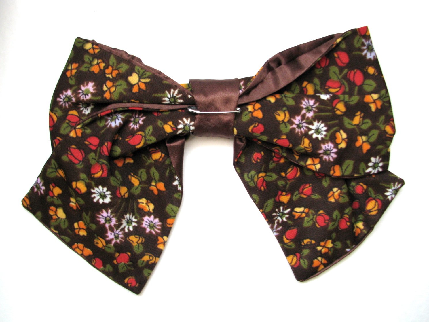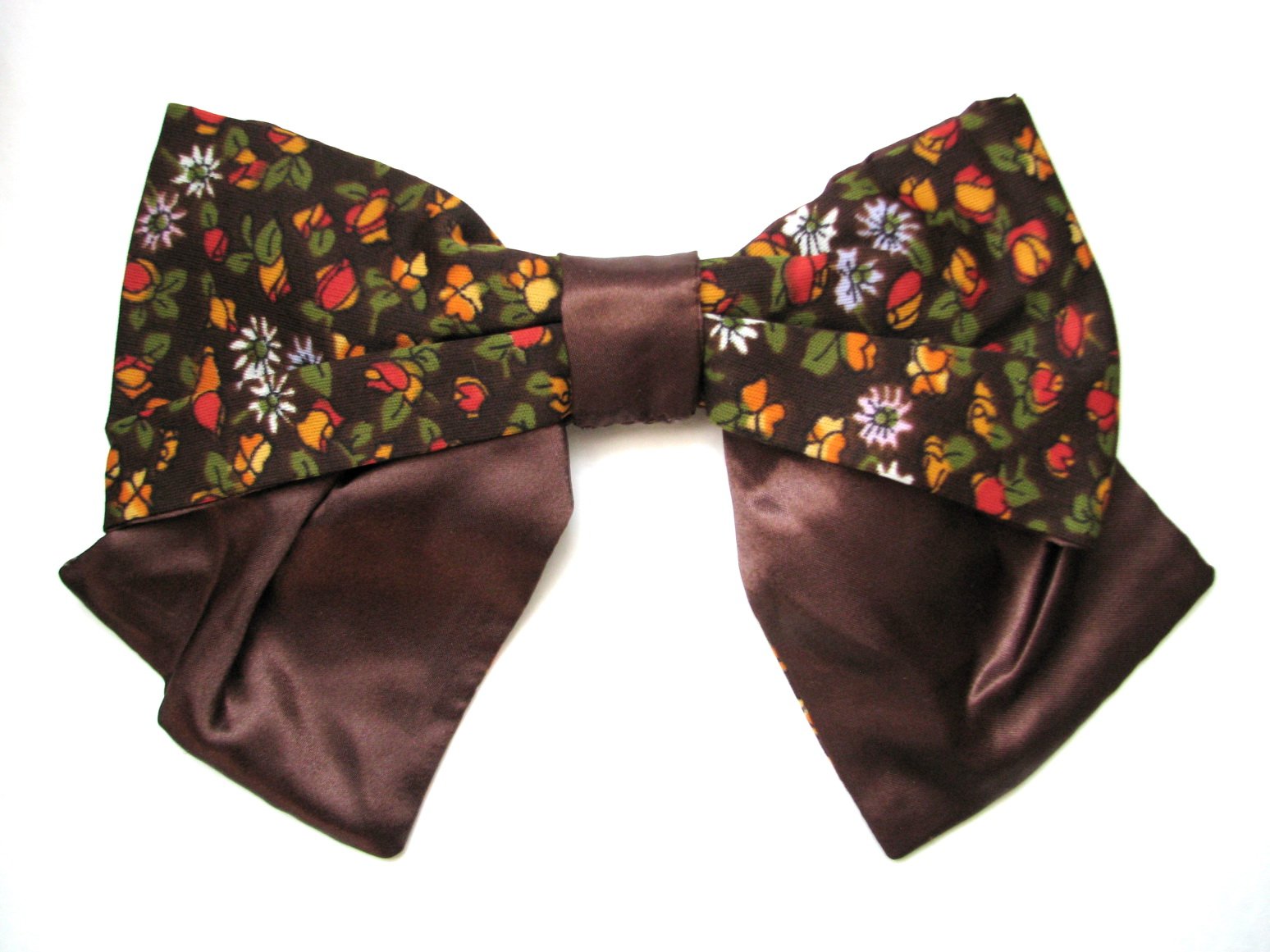 Mnou ušitá veľká mašľa - brošňa z tmavohnedej látky s drobným farebným oranžovo-červeným kvietkovaným vzorom, v kombinácii s hnedým lesklým saténom. Dá sa pripnúť kamkoľvek - na tašku, oblečenie či do vlasov na gumičku... Nepoužívaná, bez poškodení. Je fakt veľká, odhadujem okolo 20 cm, v prípade záujmu premeriam.