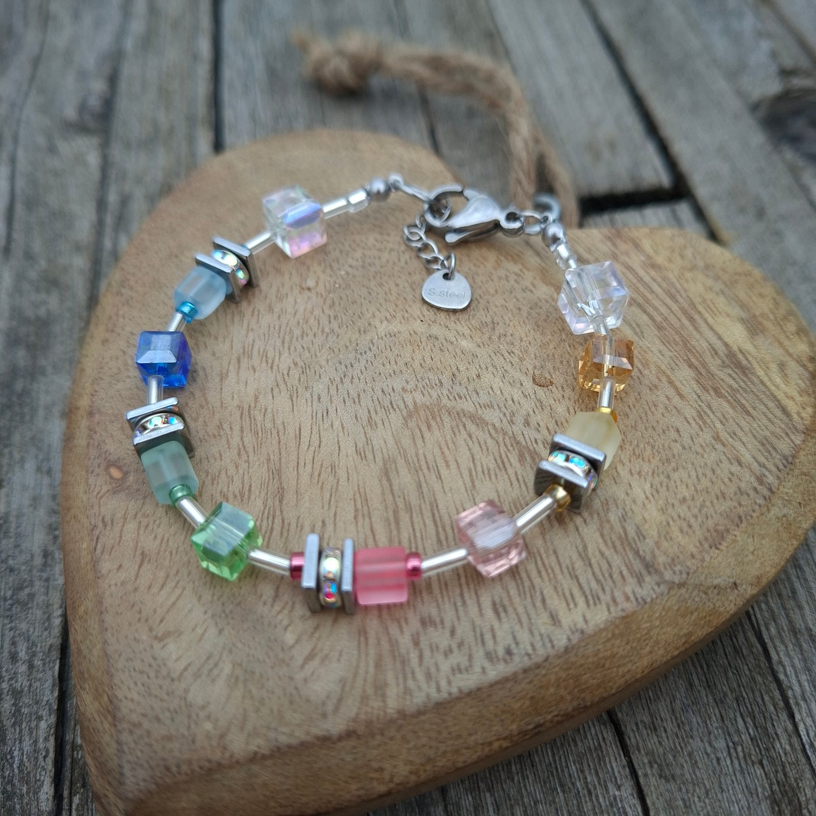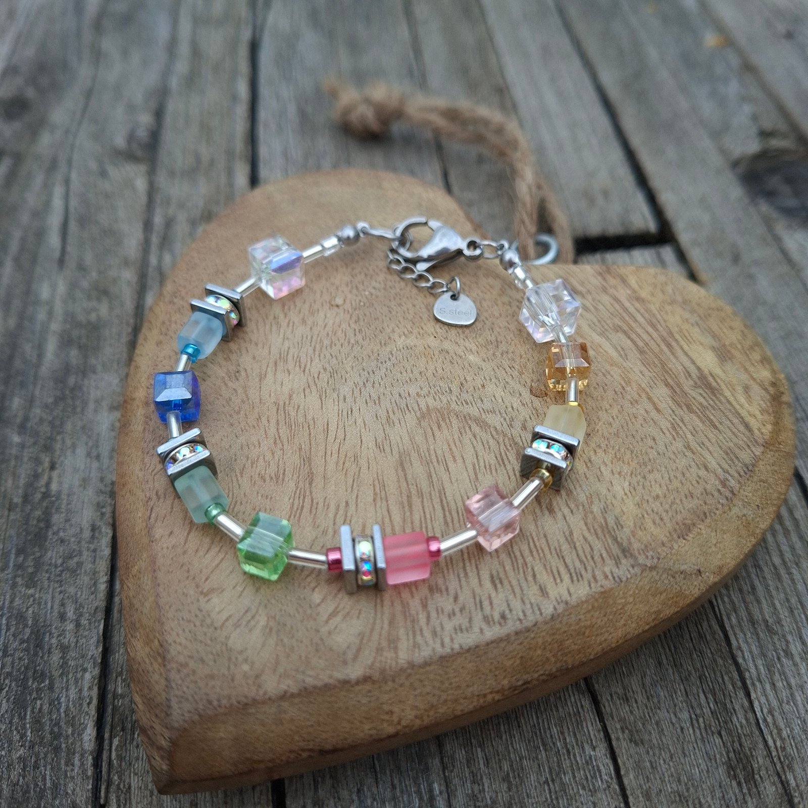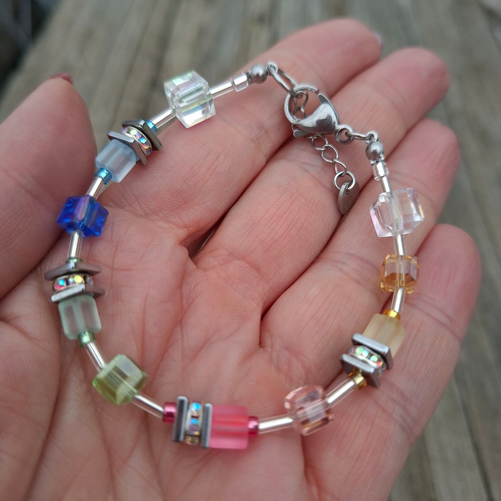 Vyrobený je na pevnom nerezovom drôte s kvalitným nerezovým zapínaním, vhodným aj pre citlivú pokožku. Kombinácia farebných sklenených kociek, drobných sklenených tyčiniek v striebornej farbe a jemných detailov vytvára moderný, svieži a ľahko kombinovateľný šperk.