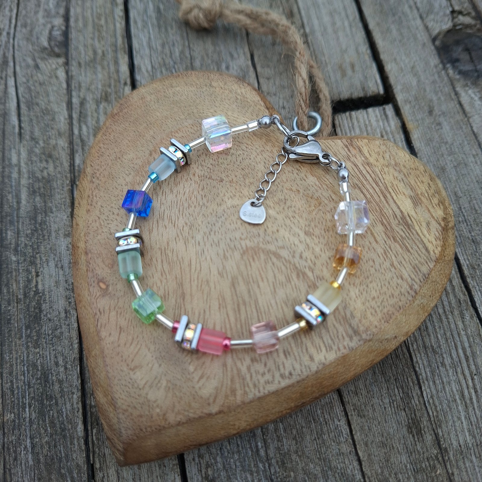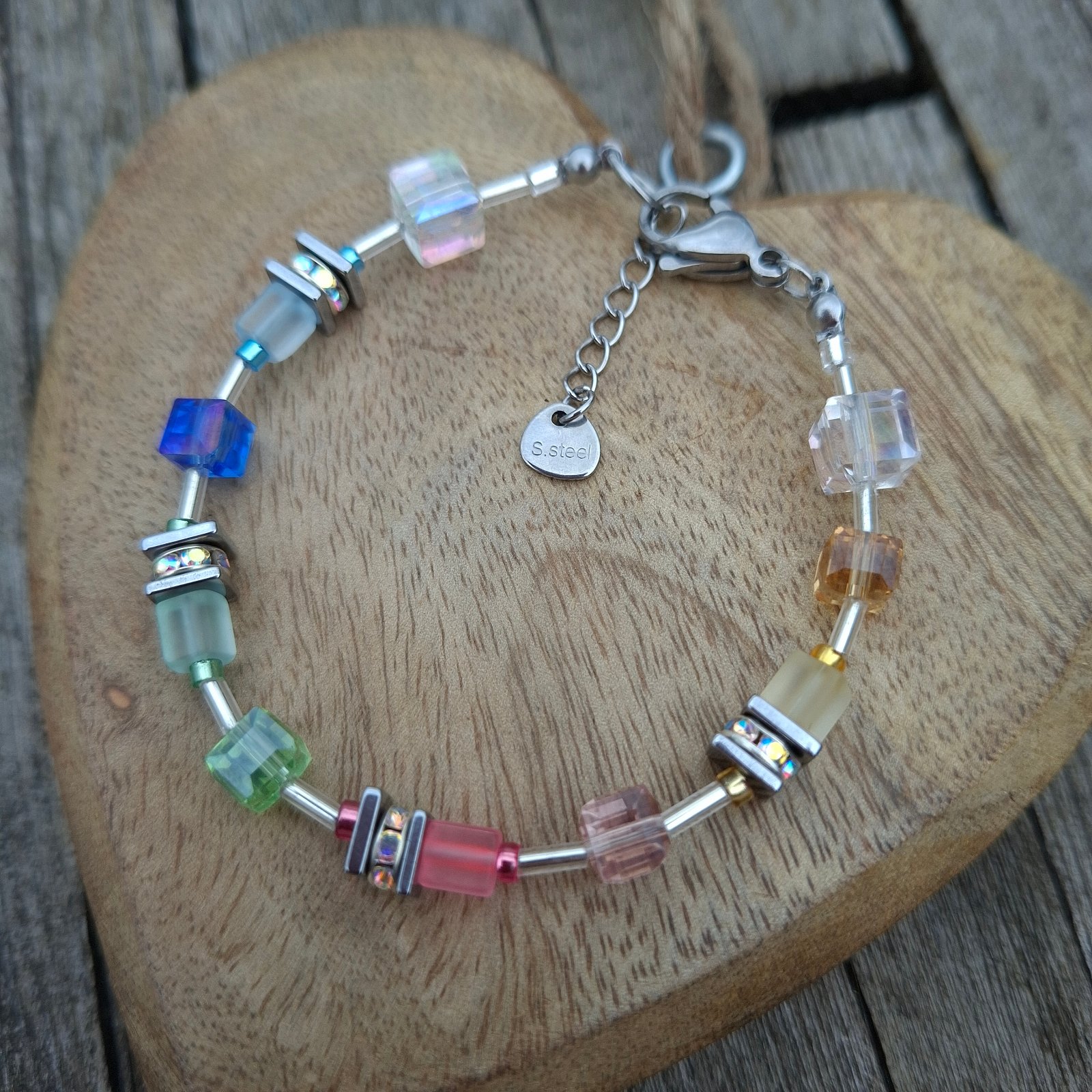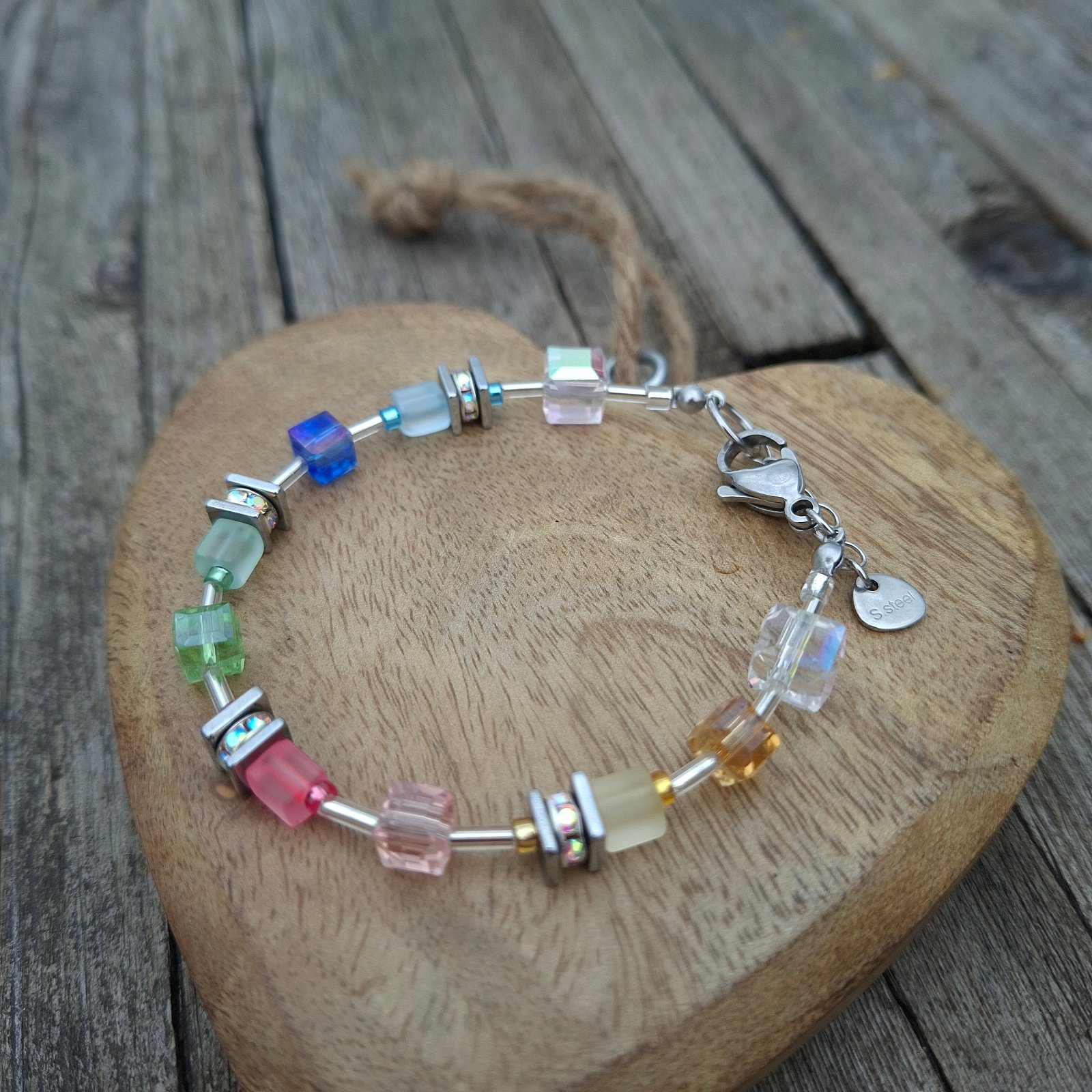 Vyrobený je na pevnom nerezovom drôte s kvalitným nerezovým zapínaním, vhodným aj pre citlivú pokožku. Kombinácia farebných sklenených kociek, drobných sklenených tyčiniek v striebornej farbe a jemných detailov vytvára moderný, svieži a ľahko kombinovateľný šperk.