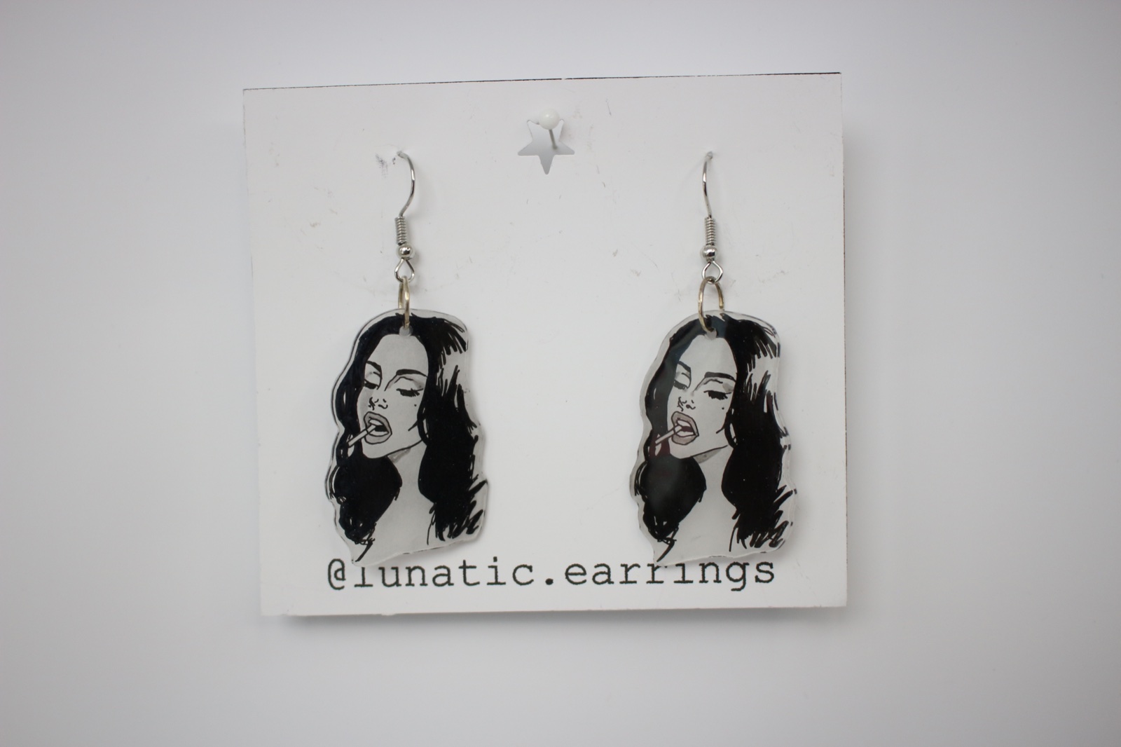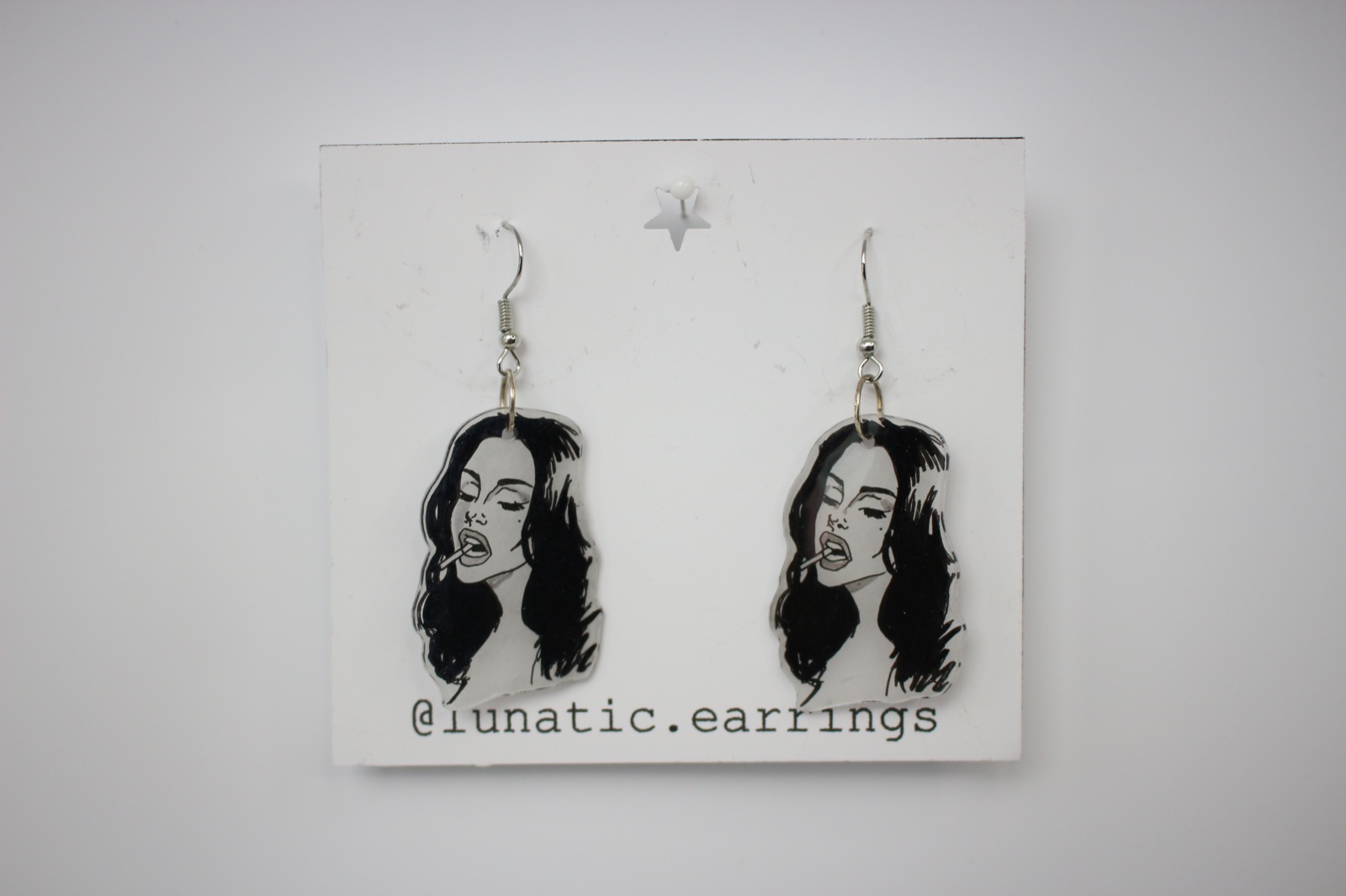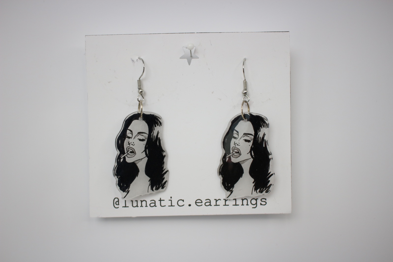 Handmade plastové náušnice s ilustráciou inšpirovanou ikonickou estetikou Lany Del Rey. Retro glamour, bad girl look a kúsok melanchólie v jednom.