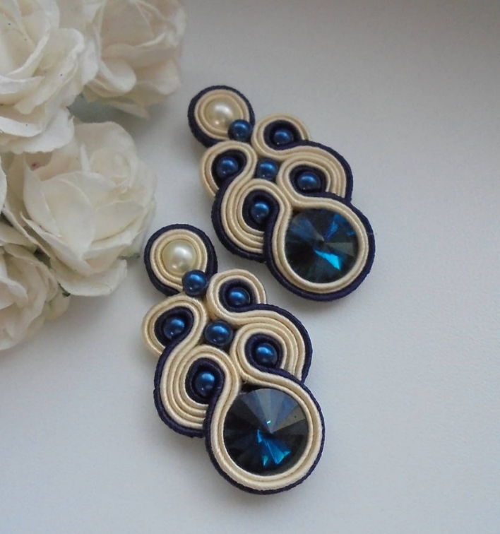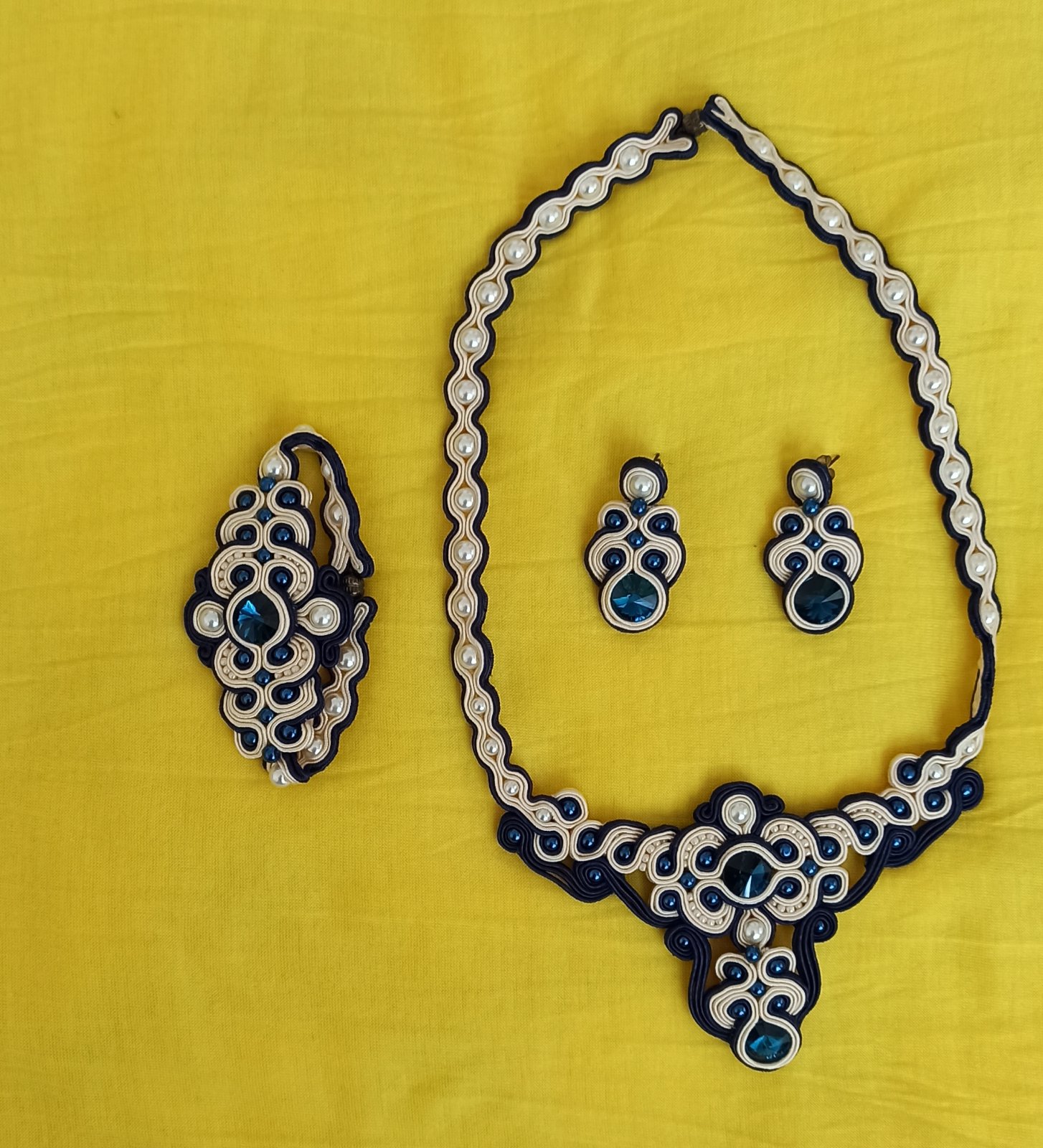 Ručne šitý setík z béžového a tmavomodrého šujtášu. Na prípravu použité tmavodré krištálové rivoli, české voskované perly a japonský TOHO rokajl. Náramok aj náhrdelník majú magnetické zapínanie a sú podlepené filcom.
