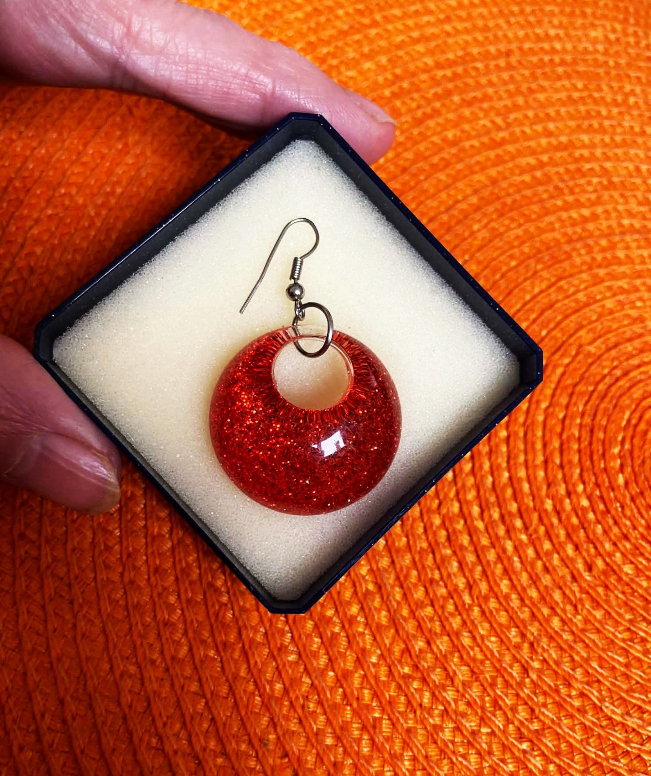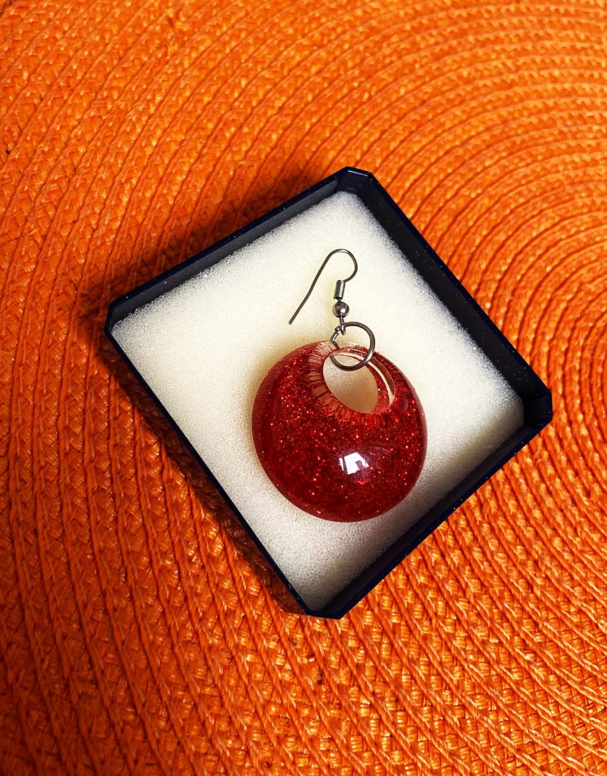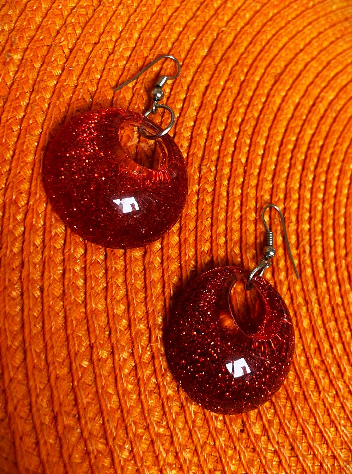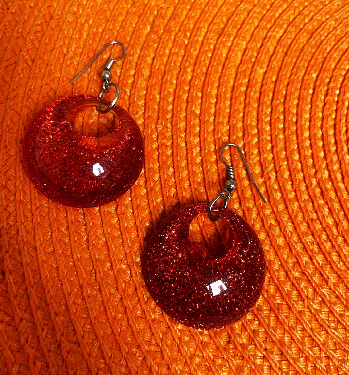 zaujímavé a ľahké náušnice,plast,top stav,sýtočervené,vo vnútri rozrúsené jemné trblietky,super na leto,priemer = 3 cm