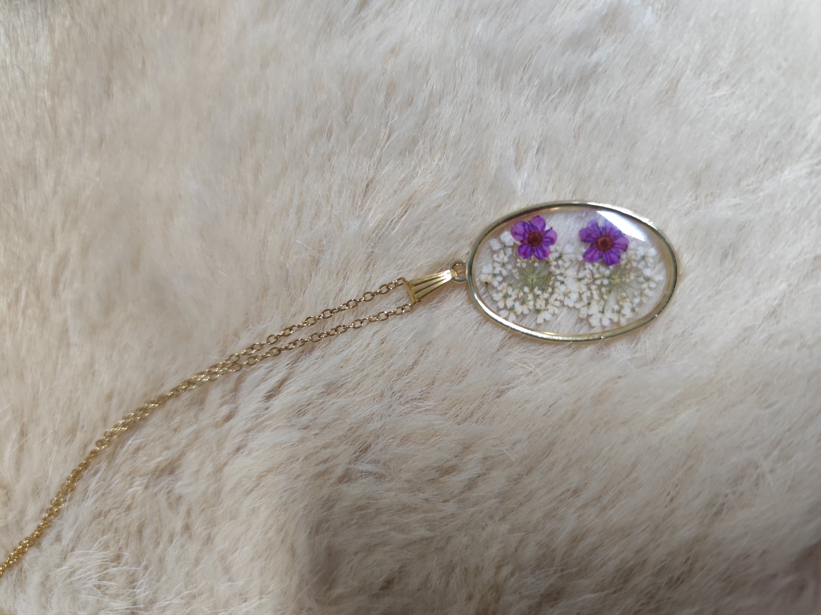 Retiazka a kovové komponenty z chirurgickej ocele- dĺžka 48 CM, vkladané sušené kvietky na dva x zalievane, brúsené a leštenie. Prívesok veľkosť cc 3_4 cm