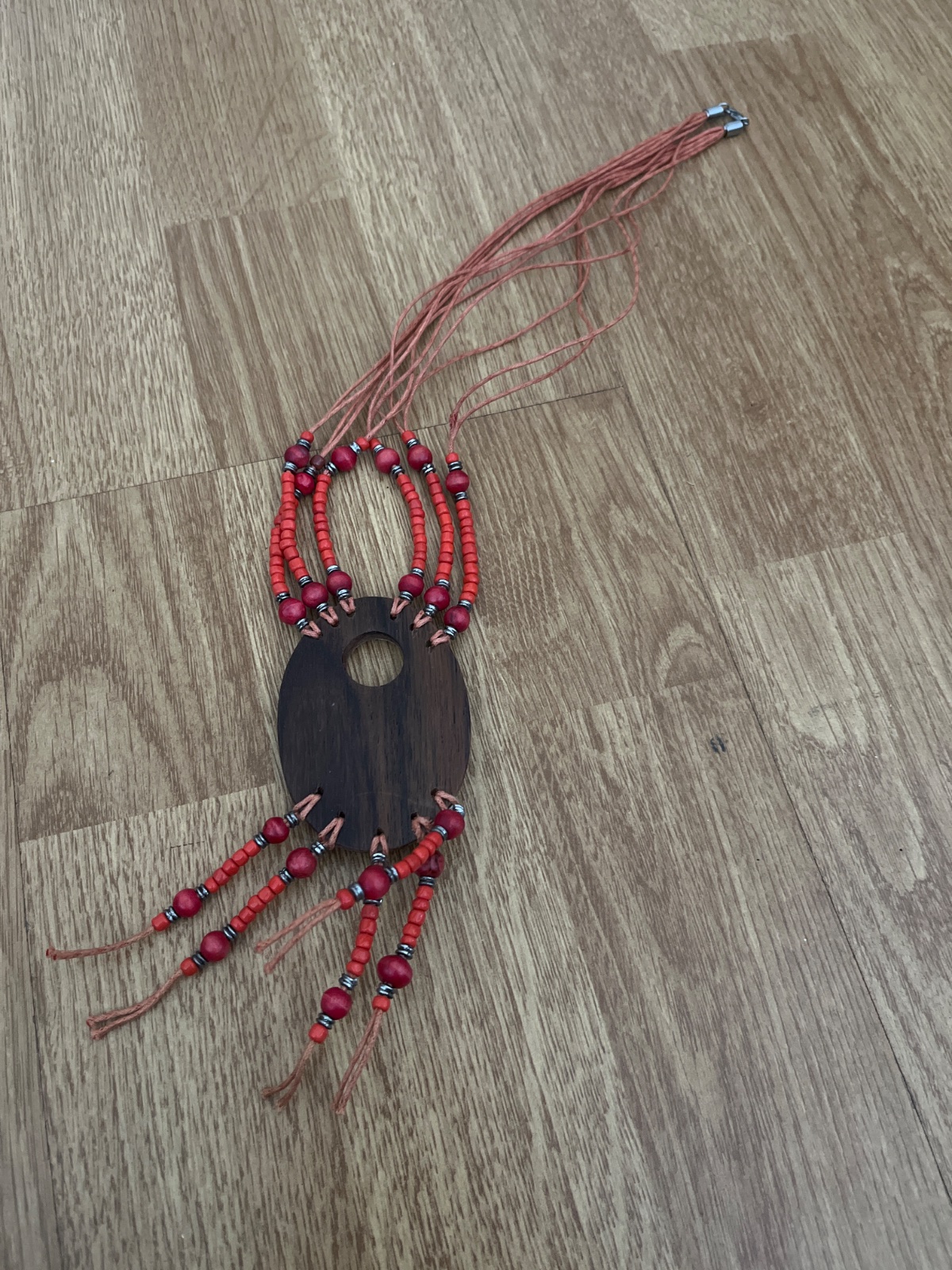 Náhrdelník, nevynosím , červeno hnedo oranžový , zo zadu drevo