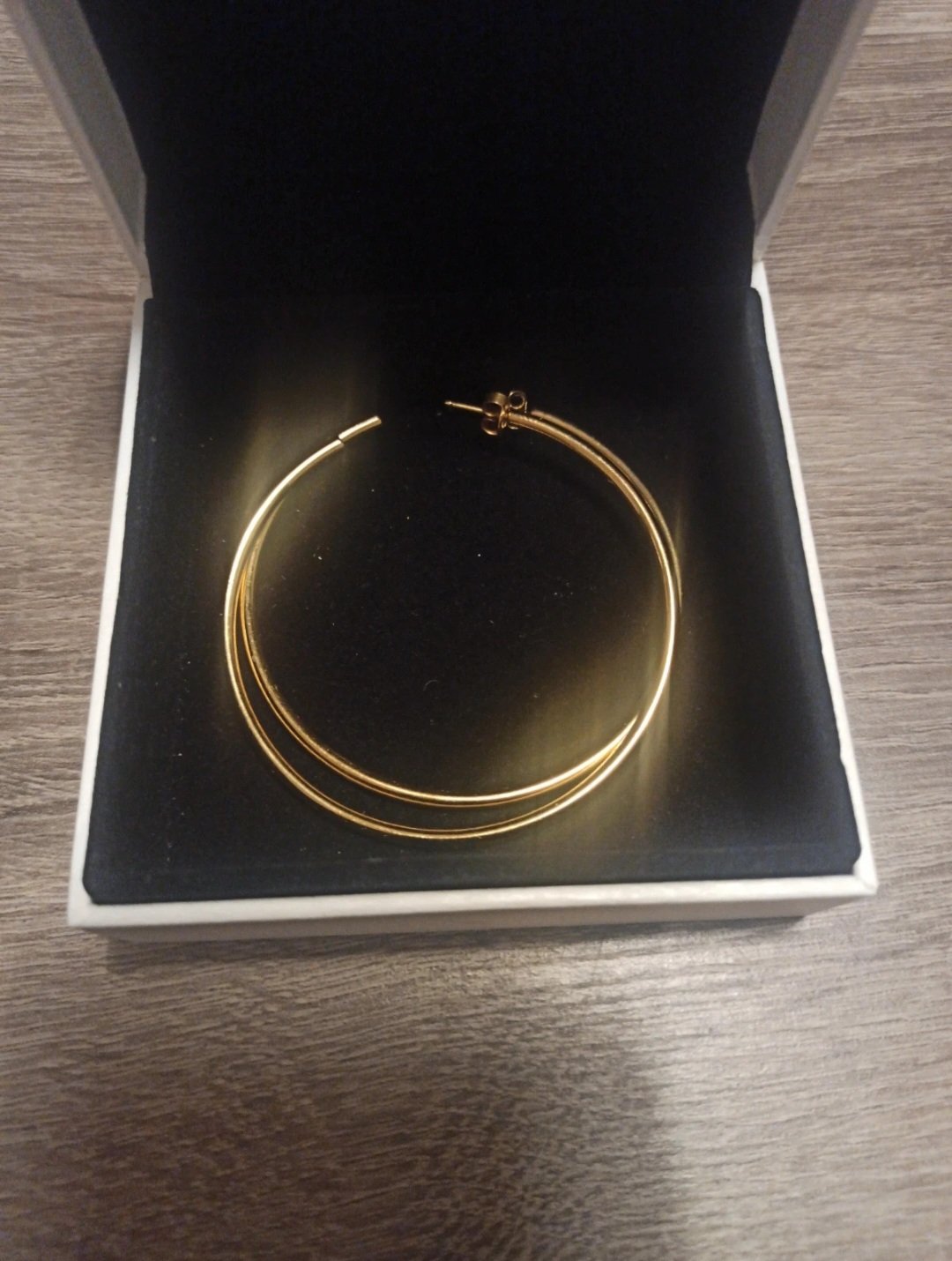 Štylový kúsok v podobe otvorených kruhových náušnic s priemerom 65 mm. Tieto kruhové náušnice, vyrobené z jedinečnej zmesi kovov pozlátené 14-karátovým zlatom, majú okrúhly profil, ploché konce. Na...