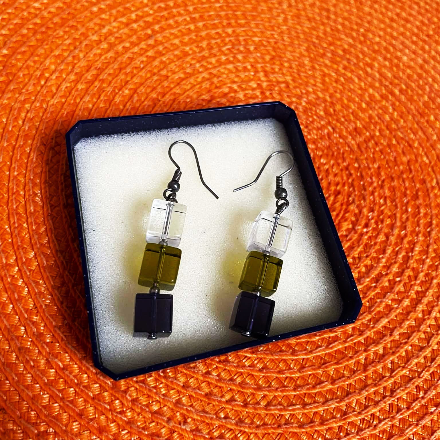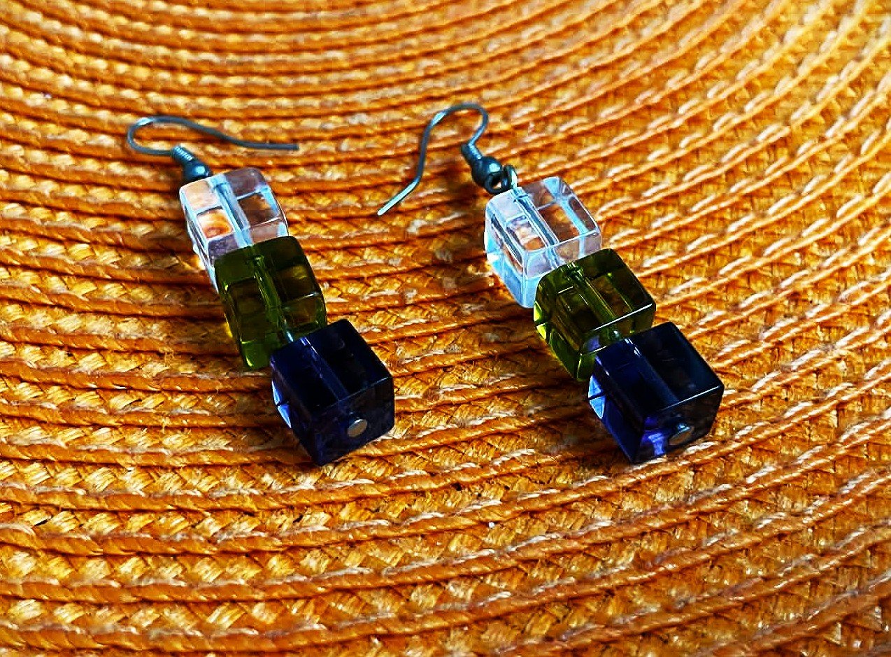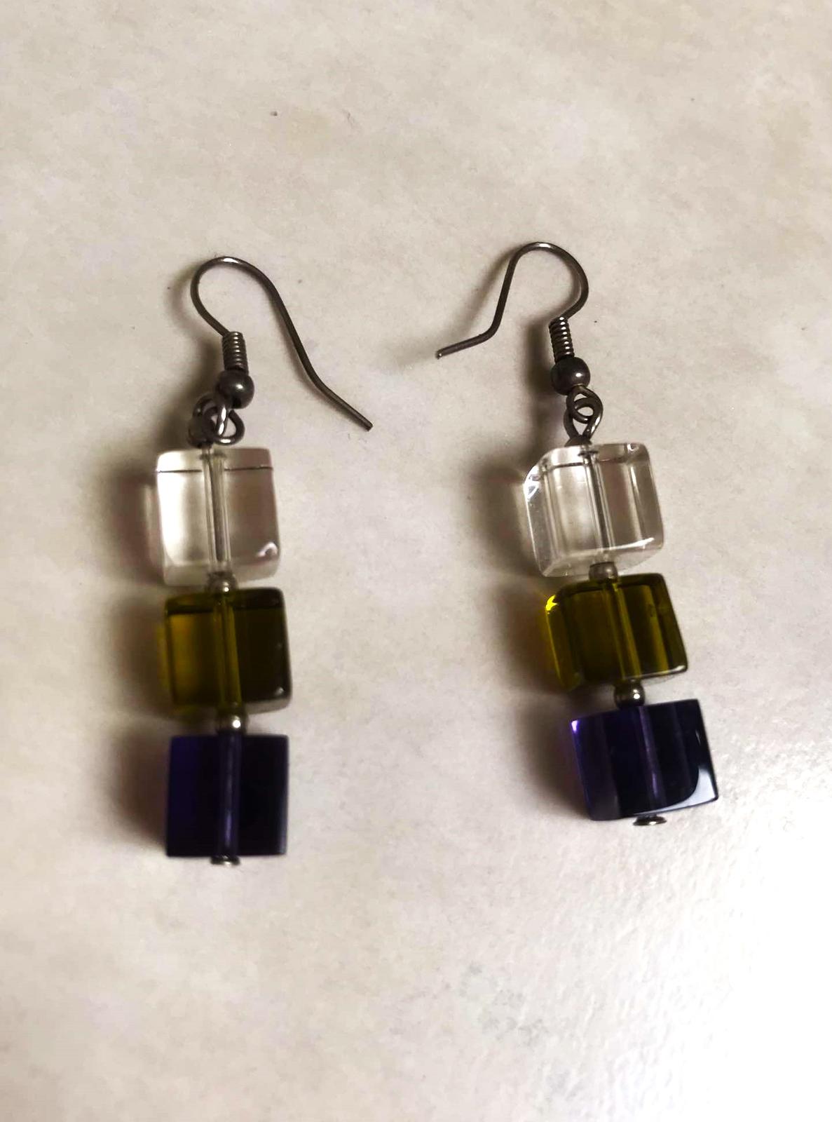 zaujímavé náušnice vyrobené z brúsených kociek pripomínajúcich sklo,3 kocky v rôznych farbách: číra/priehľadná, zelená/jantárová a tmavomodrá,dlžka celkom = 3 kocky = 3 cm