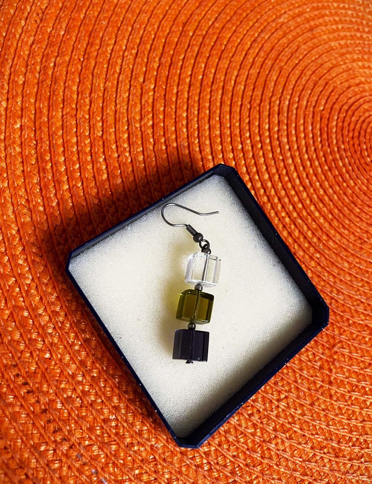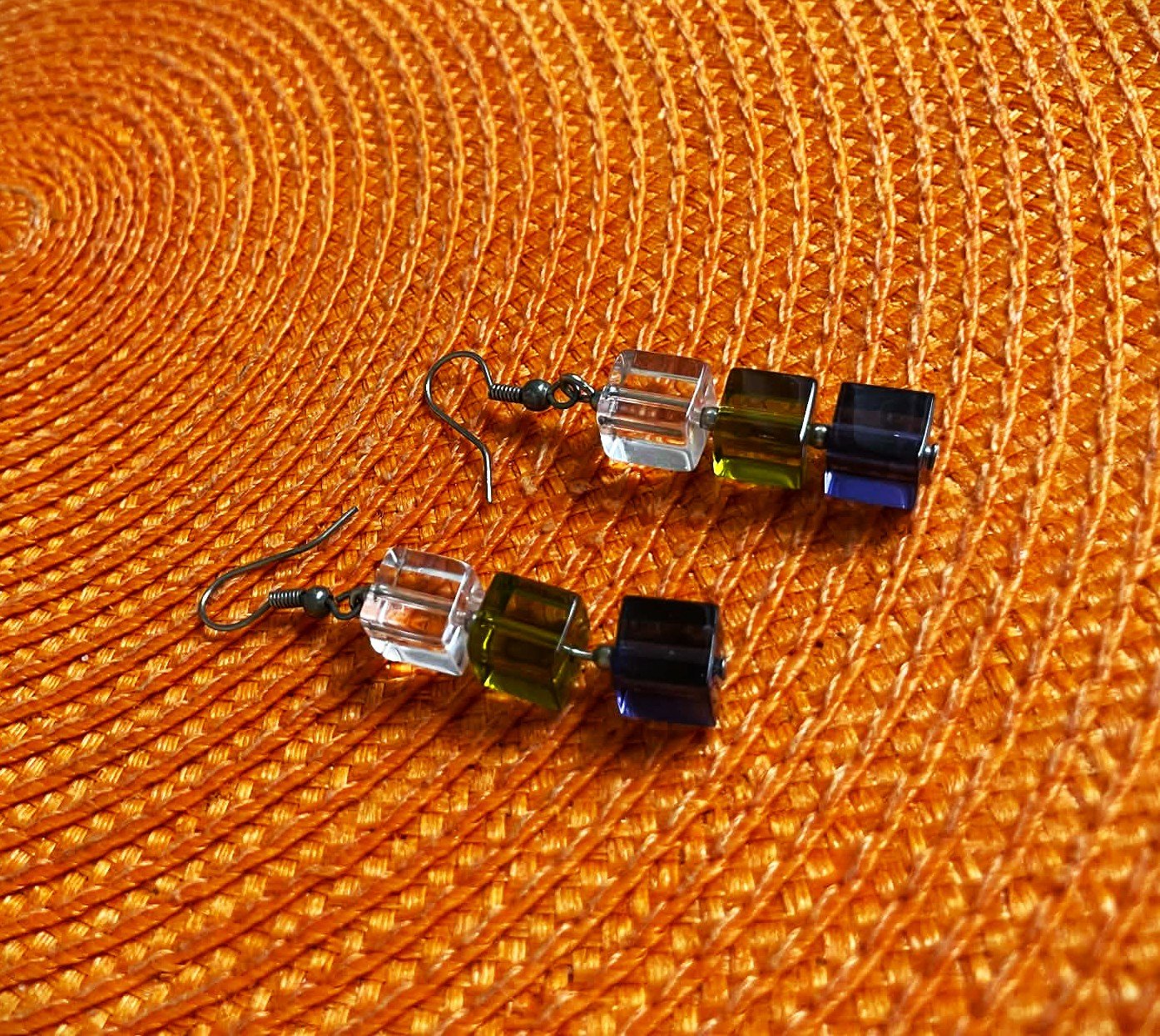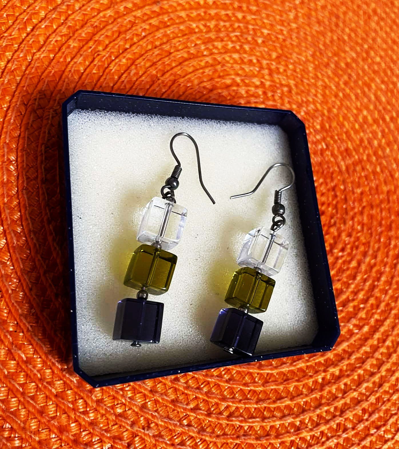 zaujímavé náušnice vyrobené z brúsených kociek pripomínajúcich sklo,3 kocky v rôznych farbách: číra/priehľadná, zelená/jantárová a tmavomodrá,dlžka celkom = 3 kocky = 3 cm
