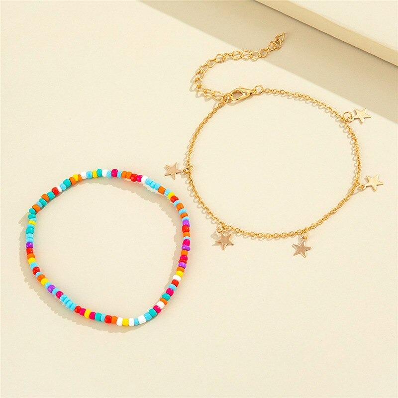 2 náramky na nohu . 1ks na gumičke farebne korálky a druhý v zlatej farbe retiazka s hviezdičkami