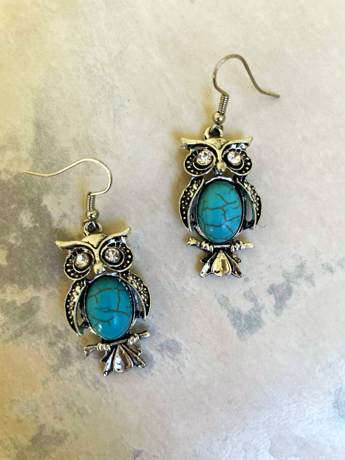 väčšie výrazné a nápadité krásne náušnice,farba strieborná s patinou,očko - tyrkenit,jemné očká aj v očiach sovy,výška = 3,5 cm,mexické striebro