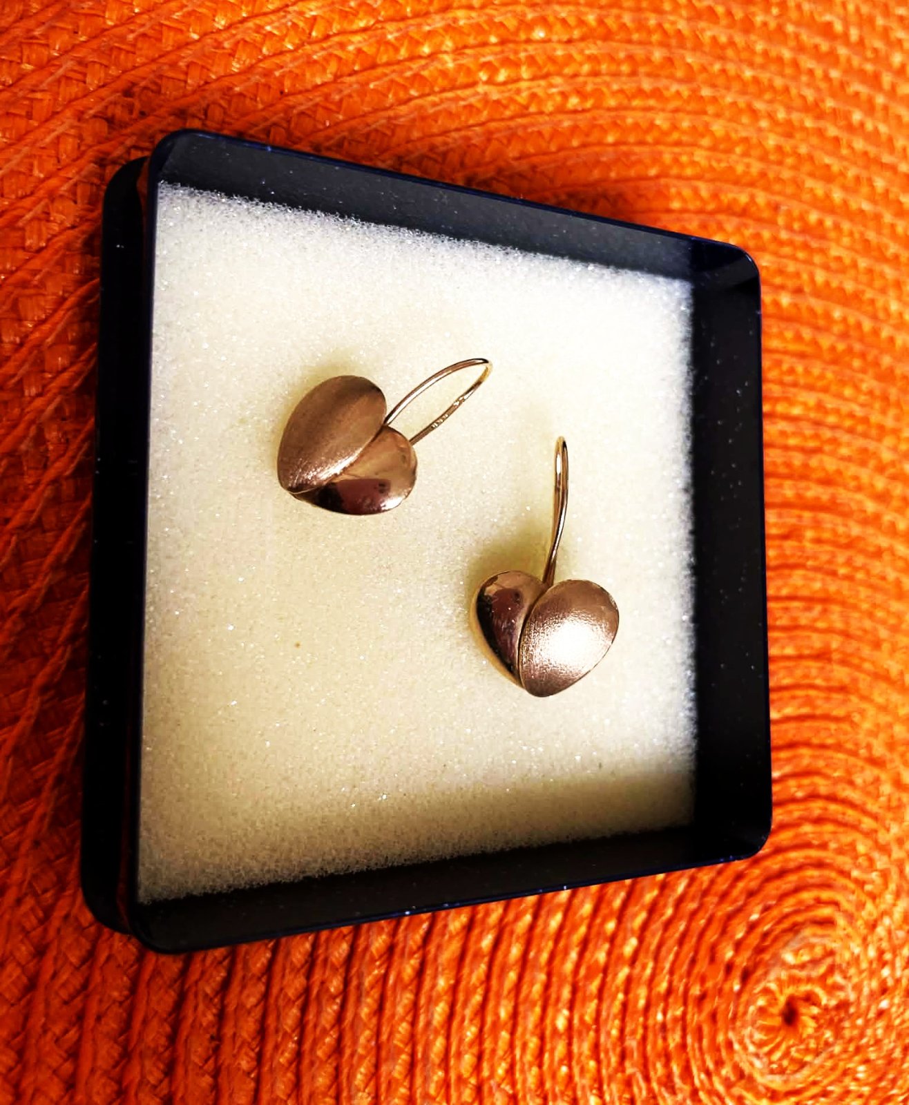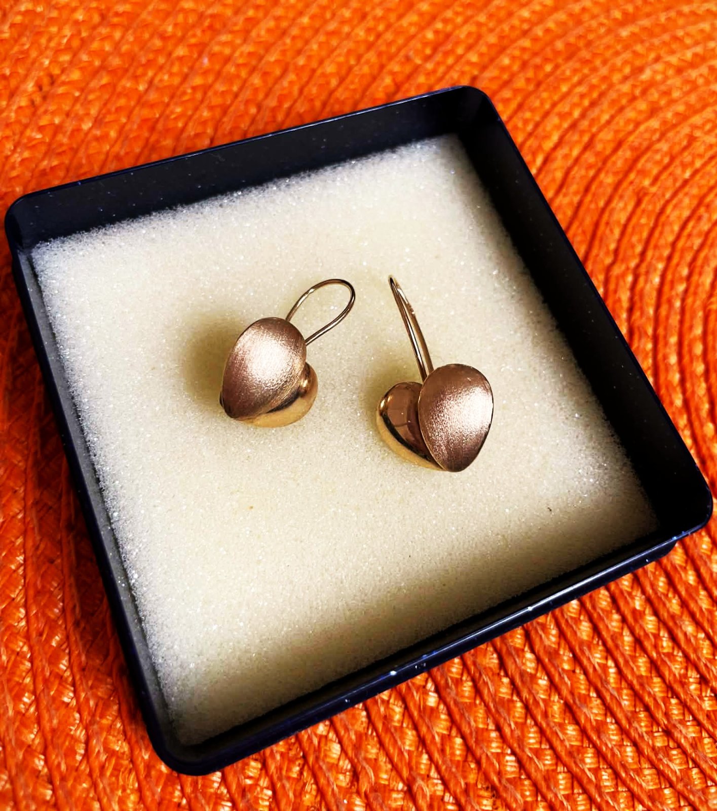 zaujímavé netuctové zlaté náušnice - srdiečka,14 karátové zlato,výborné zapínanie na háčik,predná časť napoly lesklá,napoly matovaná,srdiečko = 1,2 cm, v top stave,vážia 1,92 gramov