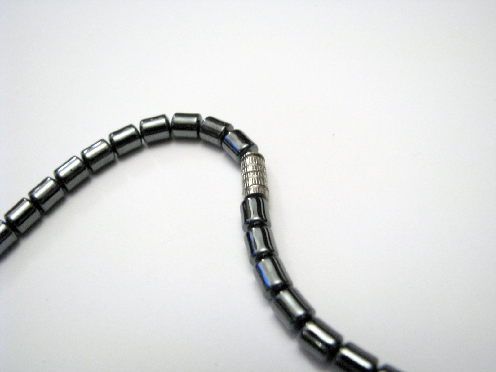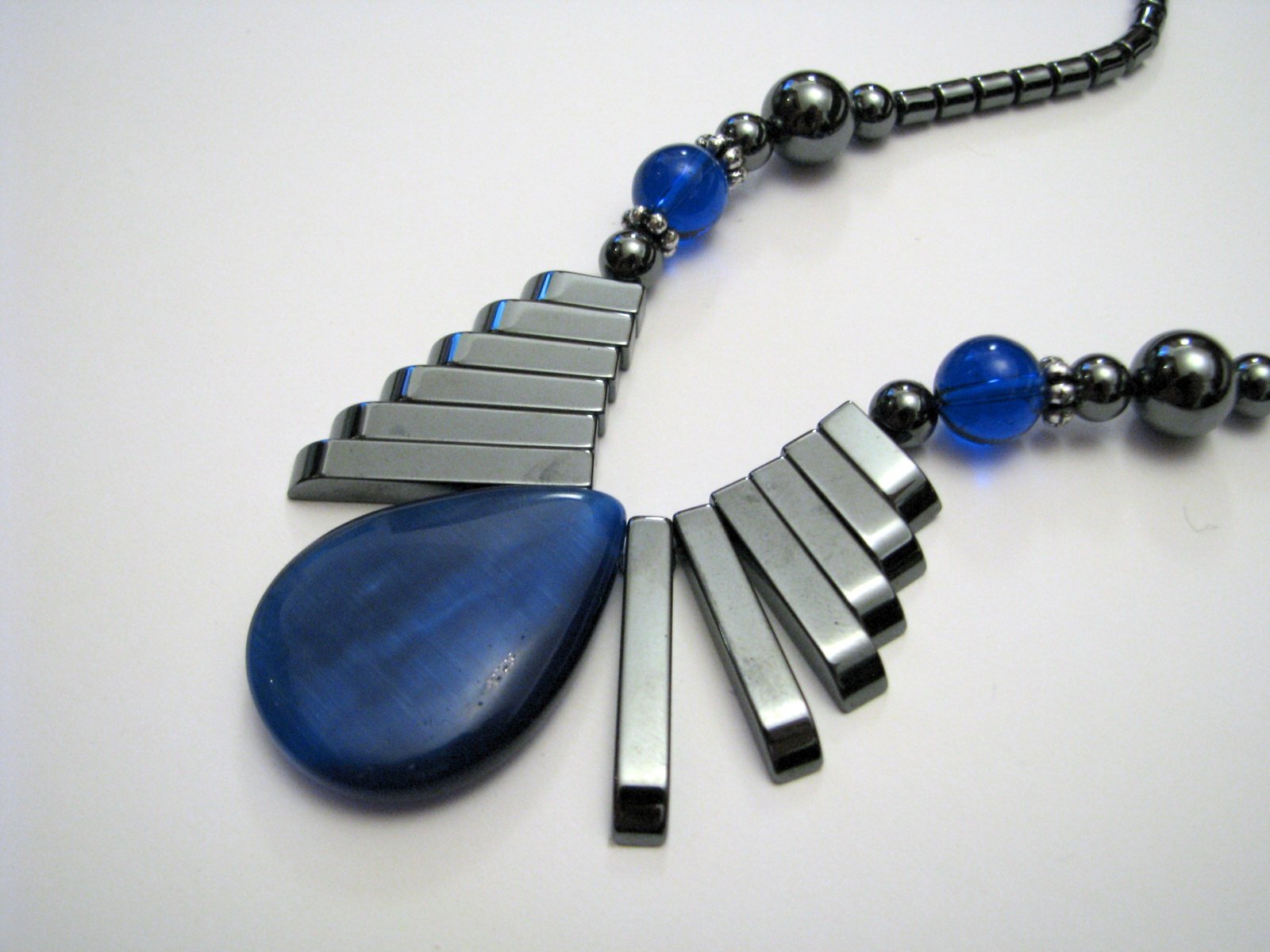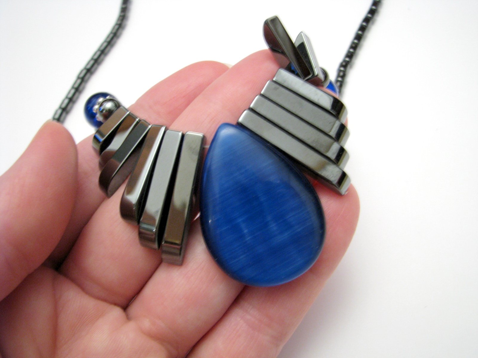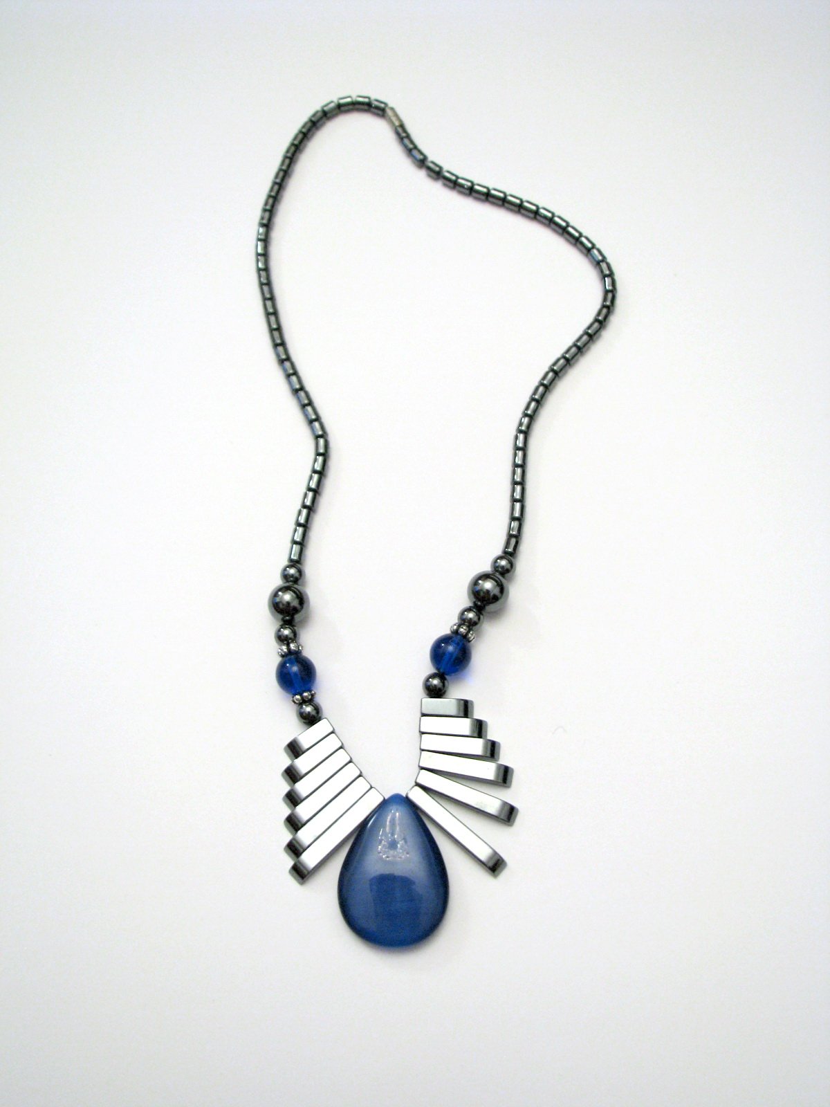 Krásny náhrdelník s veľkou kráľovsky modrou lesklou sklenenou kvapkou typu "mačacie oko" a dvoma menšími modrými korálkami + hematitovými (predpokladám umelý kameň) korálkami rôznych veľkostí, farby sivočiernej, resp. antracitovej, či tzv. gunmetal. Zapínanie na šrúbovanie. Výborne zachovalý, bez poškodení.