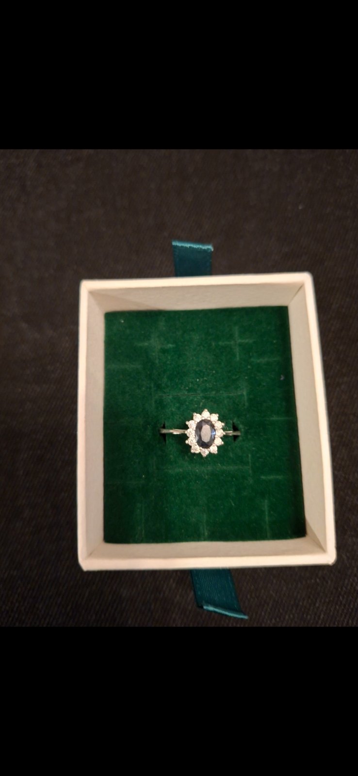 Elegantný strieborný prsteň s výrazným oválnym očkom v tmavom odtieni (čierna až tmavomodrá). Dominantný kameň je jemne vyvýšený a po celom obvode je lemovaný drobnými čírymi kamienkami, ktoré vytvárajú efekt kvetu alebo korunky.