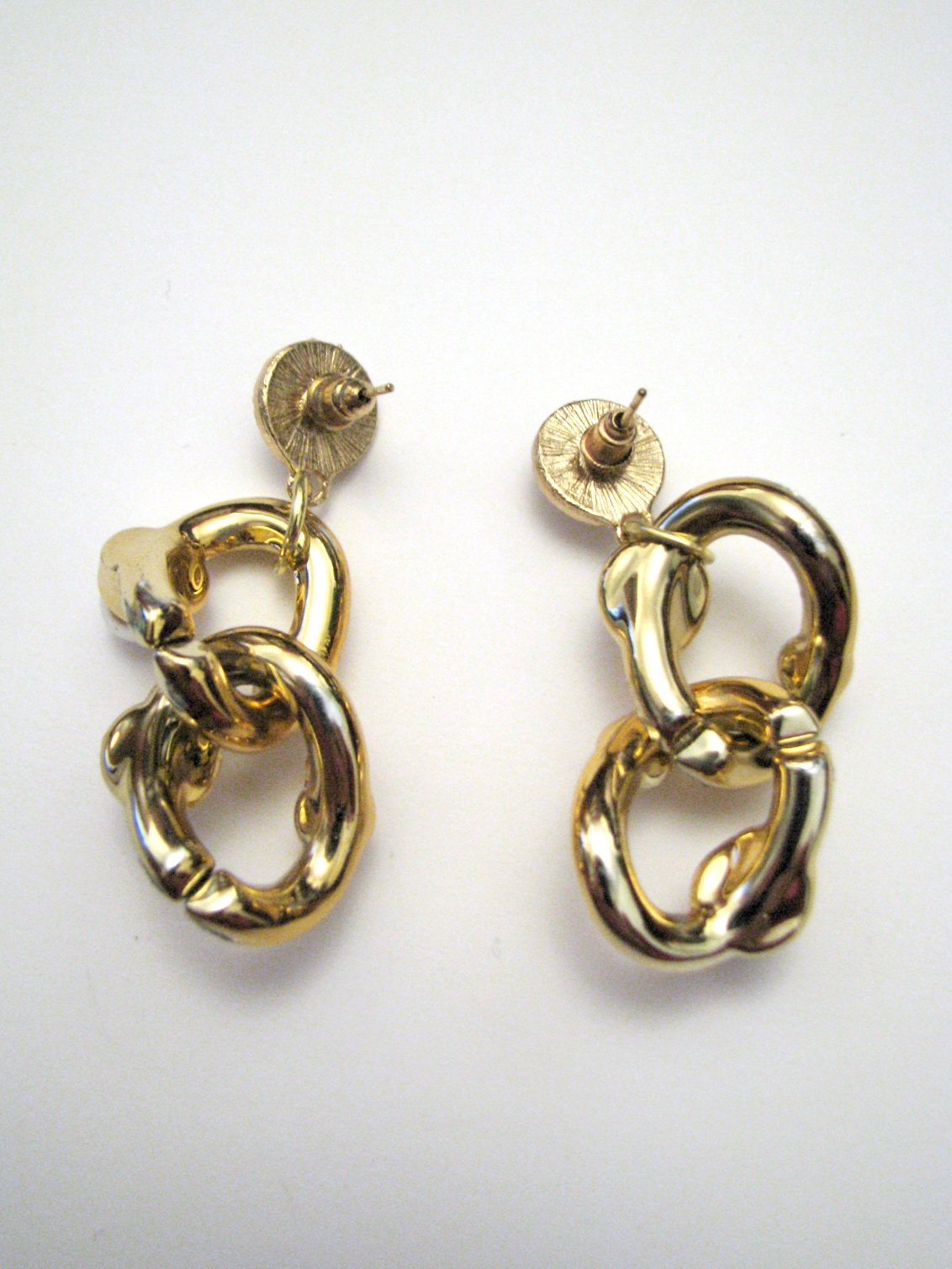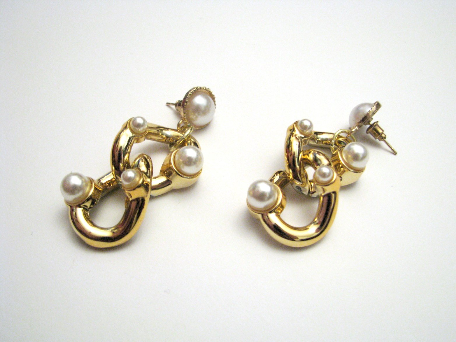 Dlhé visiace napichovacie náušnice zlatej farby s perleťovými korálkami. Horná zlatá časť do ucha je kovová, spodné diely z akoby masívnej reťaze sú plastové, ľahké. Na jednej náušnici sú dve perličky trochu ošúchané, viď. fotky, pri nosení nevidno, len pri blízkom skúmaní. Iné poškodenia nemajú.