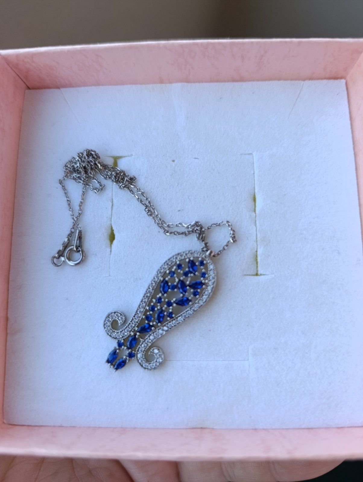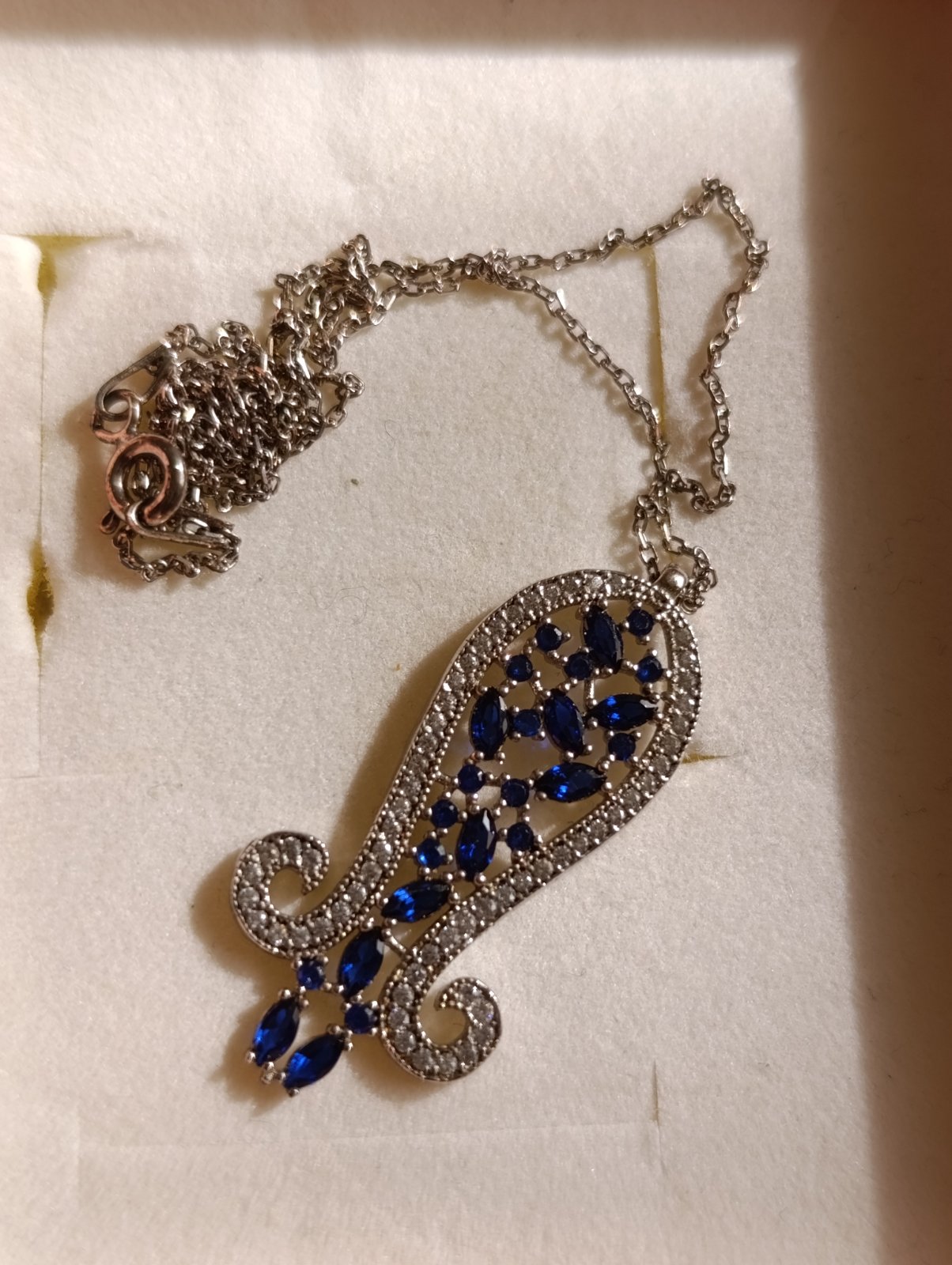 nádherné tmavomodré očká ,prekrásne vypracovaná, veľmi kvalitná bižutéria,kupovaná v zlatníctve. Predávam spolu s retiazkou 42 cm, prívesok je 3,3 x 1,3 cm hore a dole je 1,7 cm