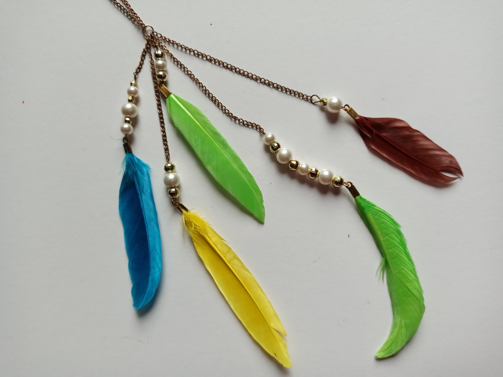 Jedinečný náhrdelník s pierkami a perličkami, originálny kúsok. Kúpila som si ho na dovolenke v Tunisku. Mám toho veľmi veľa, triedim😉 V bazáriku mám aj náušnice s pierkami.