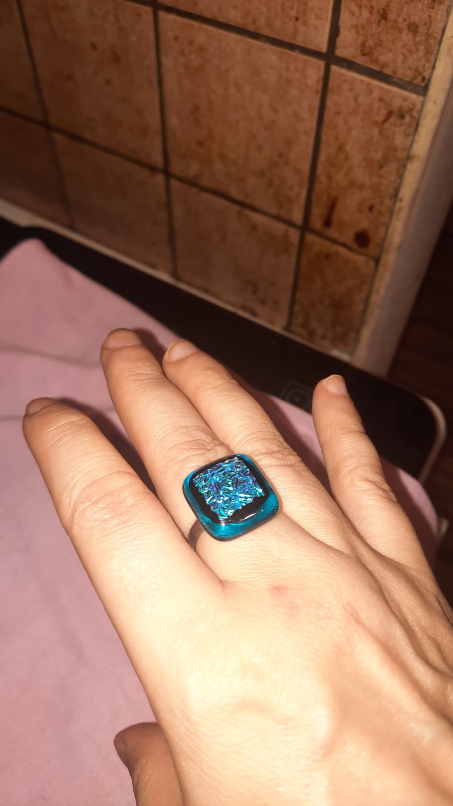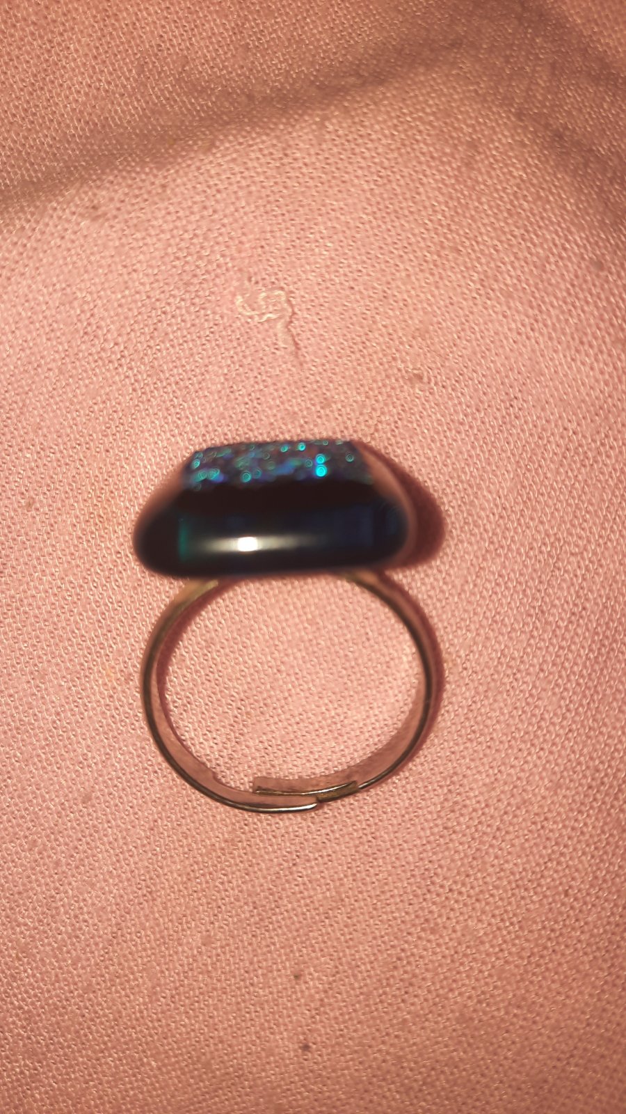 Krásny trvlietavý ručne robený prsteň, nastaviteľný, kúpený na Sashe, pre mňa asi moc trblietavý, nenosila som ho vôbec.
