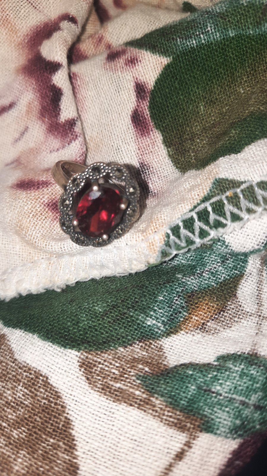 Krásny strieborný prsteň retro štýl, s trblietavým červeným kameňom a markazitmi...výrazný..54, mám veľa prstienkov, nie je obnosený, kúpený v obchode, no červené prstienky nosím hlavne, ked som zaľúbená a to už dlho nie som, tak nech urobí radosť nejakej zaľúbenej dáme🙂