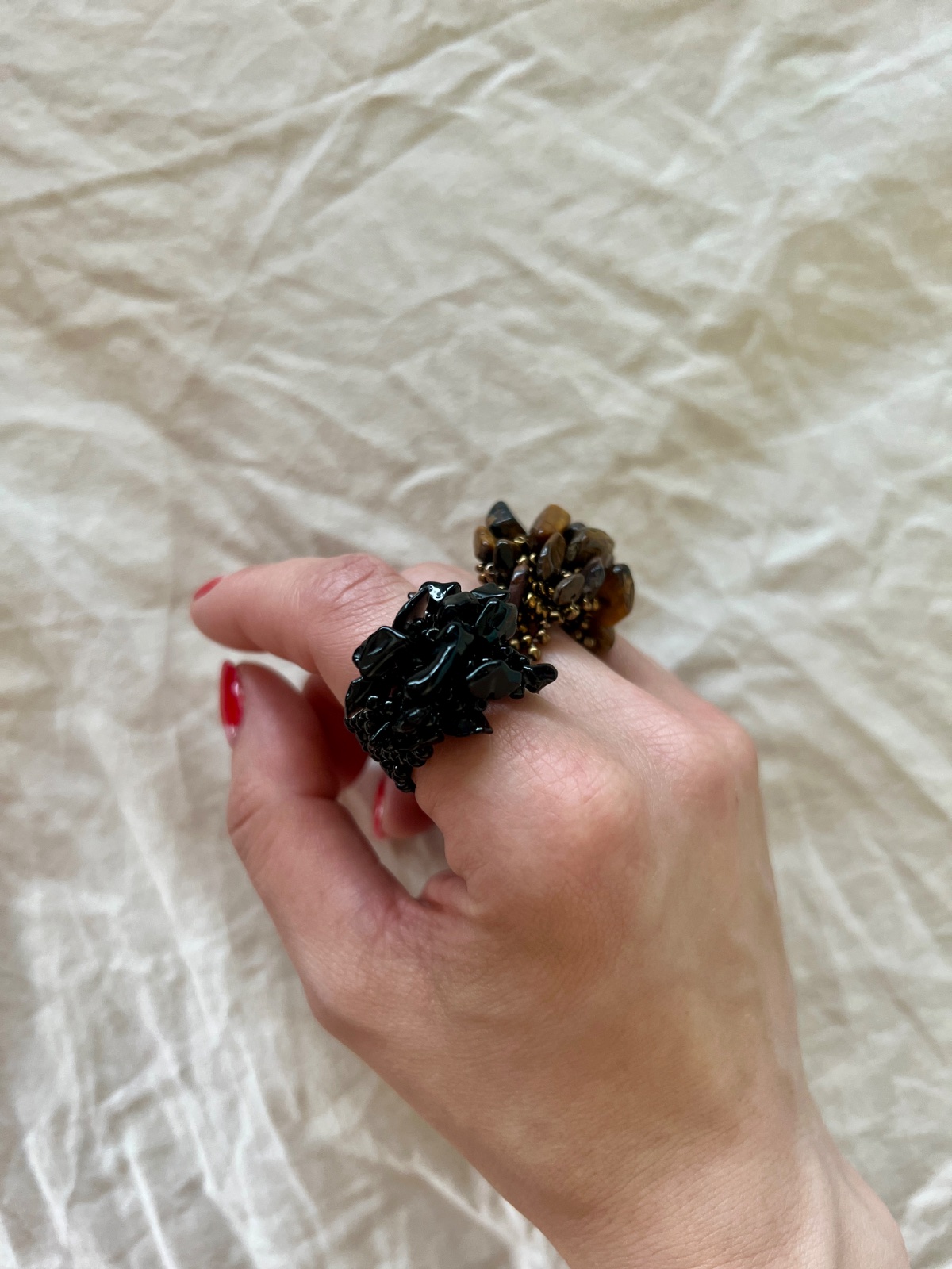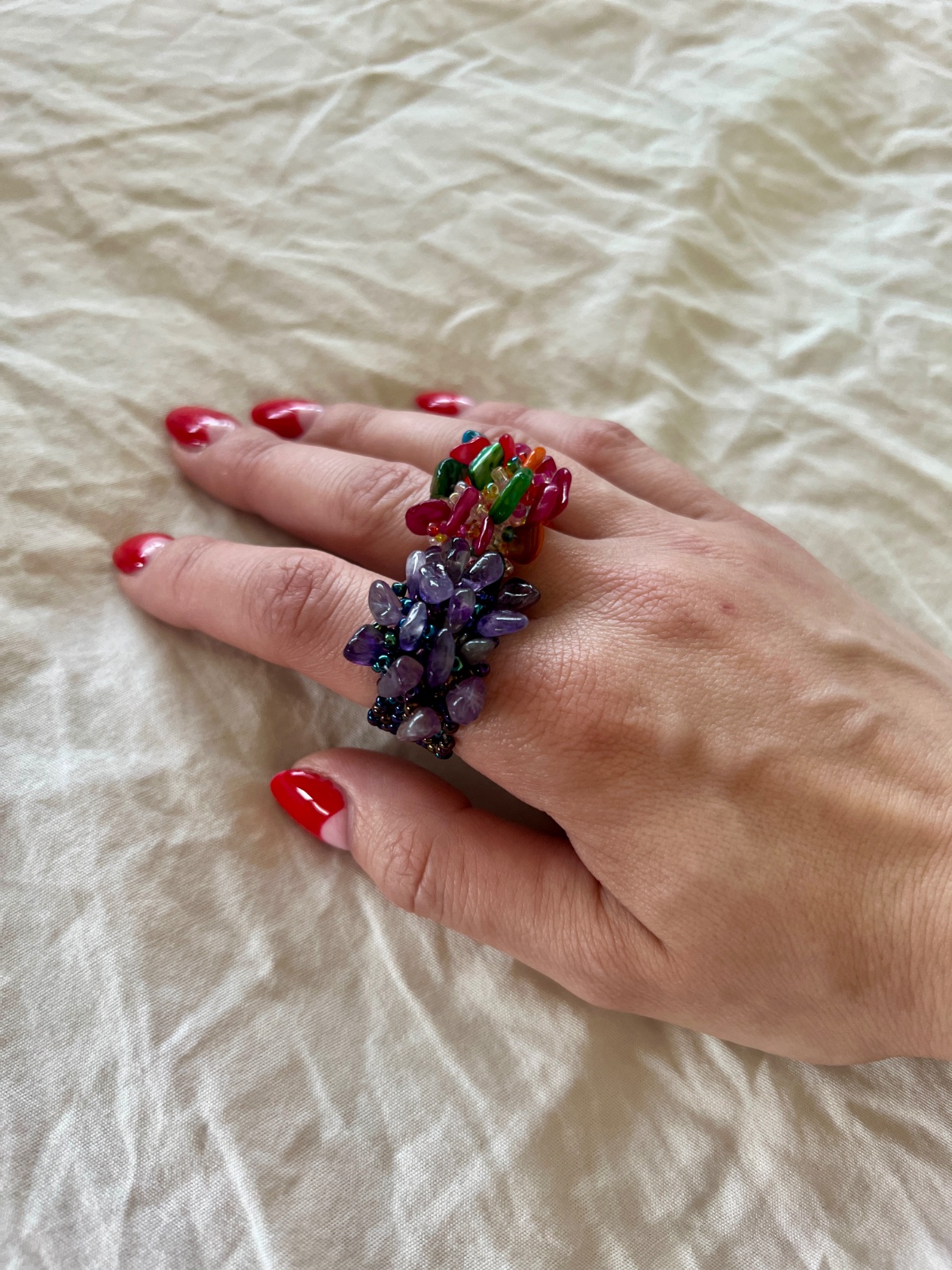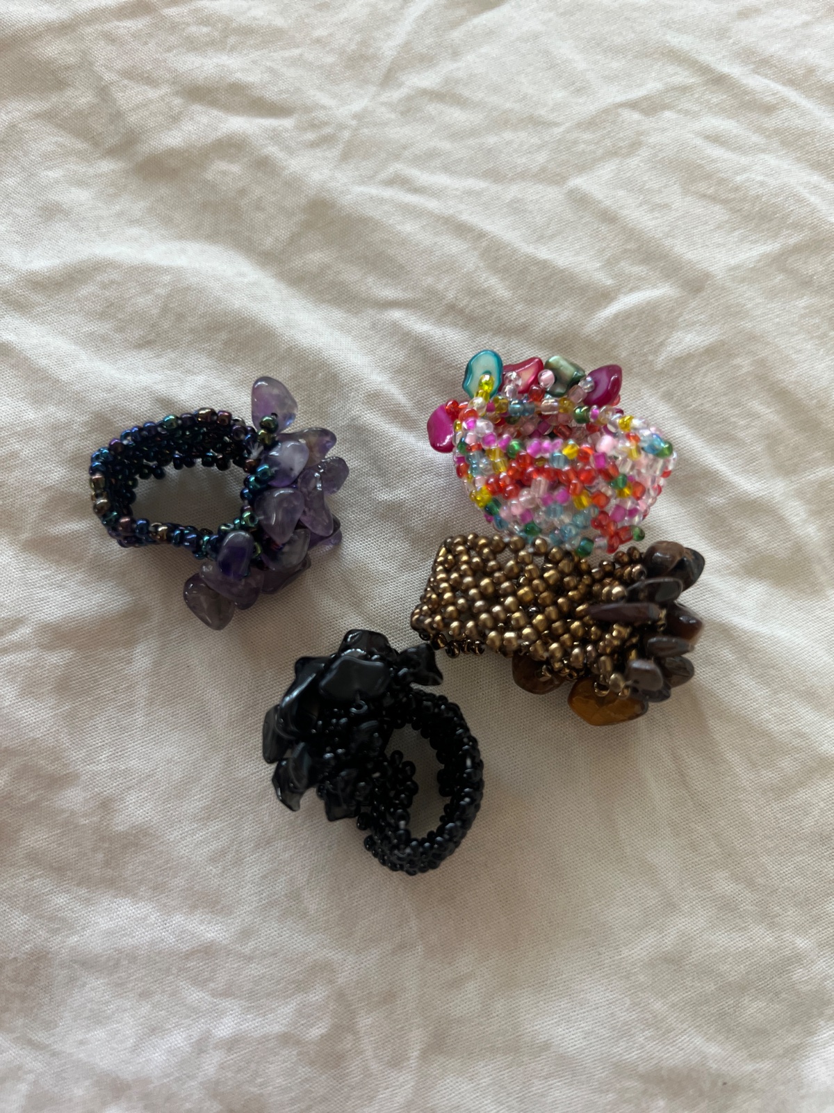 Nenosené gorálkové prstene, mne sú všetky veľké 😞 reálne sú tie 4 farby fotené na ruke - čierna, hnedá, fialová, farebná.